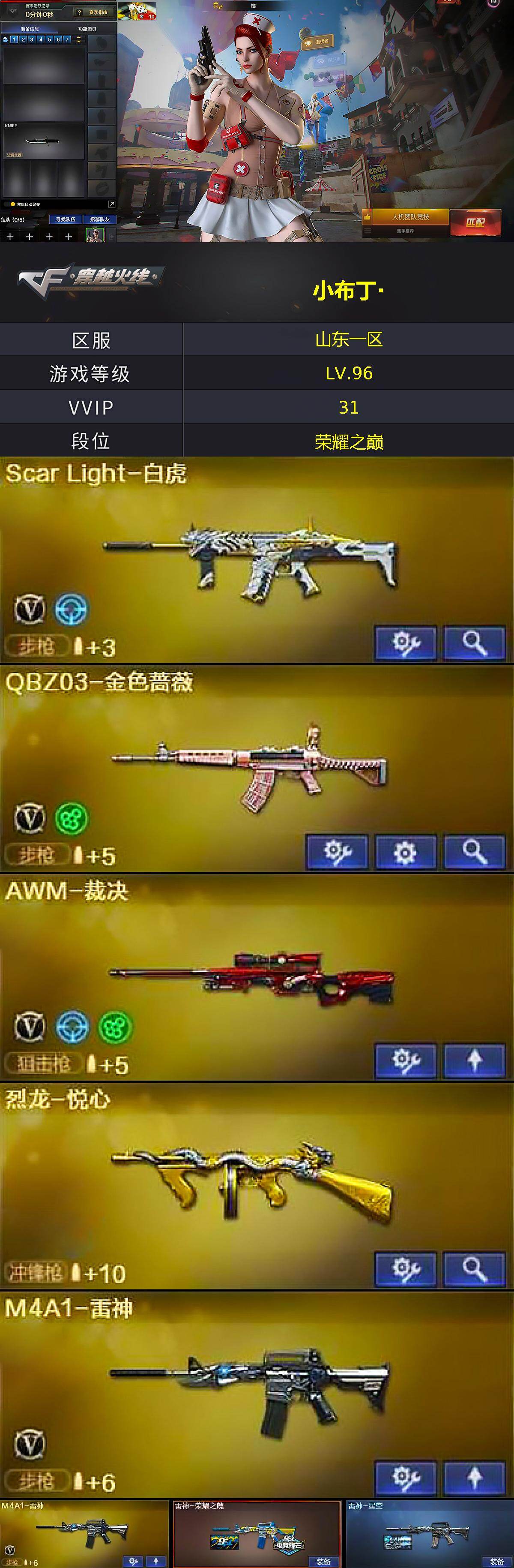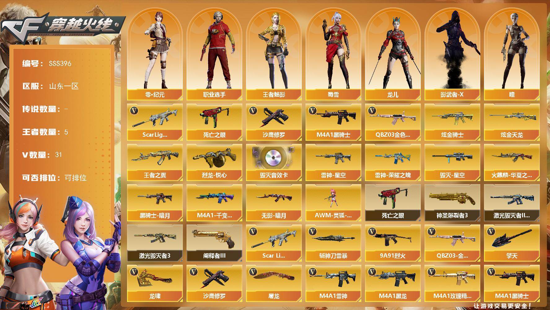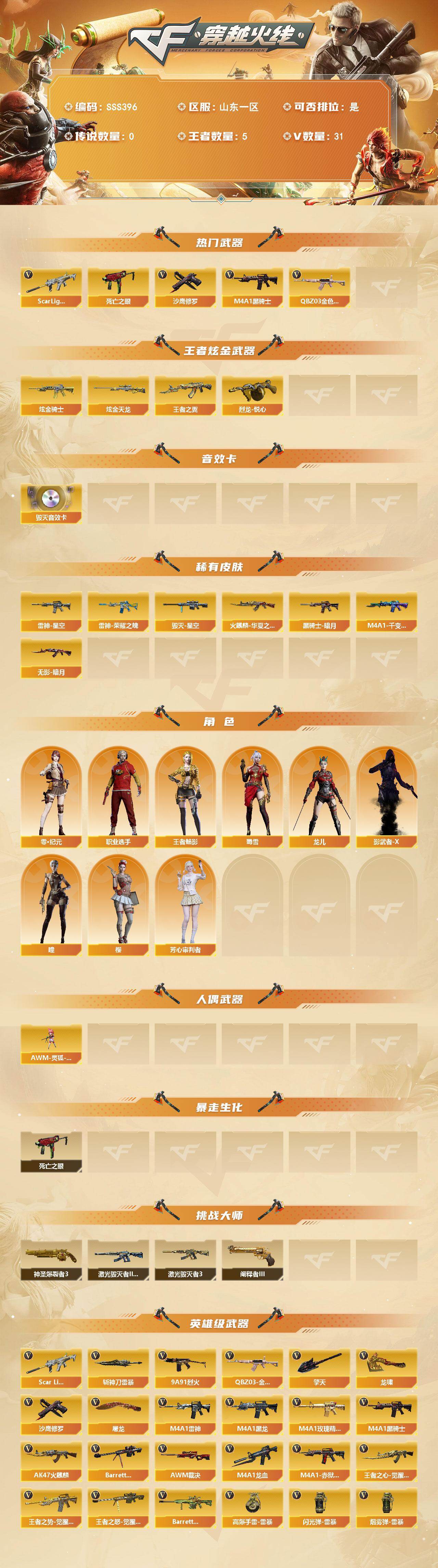 [18032313]山东一区-39V-5王者武器数-2炫金武器数 【热门武器】:QBZ03-金色蔷薇,Scar Light-白虎,死亡之眼,M4A1-黑骑士*2,沙鹰-修罗*2 【王者炫金武器】:王者之翼,烈龙-悦心,炫金骑士,炫金天龙 【音效卡】:Barrett-毁灭音效卡 【皮肤】:雷神-荣耀之魄,雷神-星空,火麒麟-华夏之心,毁灭-星空,M4A1-千变-孔明皮肤,黑骑士-暗月,无影-暗月 【角色】:樱,瞳,零·纪元,王者-魅影,芳心审判者,龙儿,蜀雪,影武者-X,职业选手 【人偶武器】:AWM-灵狐-15周年嘉年华 【暴走生化】:死亡之眼 【挑战大师】:神圣爆裂者III,激光毁灭者III-白马银枪,激光毁灭者III,阐释者III 【英雄级武器】:AK47-火麒麟,M4A1-黑龙,M4A1-雷神*2,M4A1-黑骑士*2,M4A1-龙血,Scar Light-白虎,M4A1-玫瑰精灵,QBZ03-金色蔷薇,9A91-烈火*2,王者之心-觉醒版,王者之势-觉醒版,Barrett-毁灭,AWM-裁决,王者之怒-觉醒版,沙鹰-修罗*2,屠龙,龙啸,擎天*3,斩神刀-雷暴,高爆手雷-雷暴*2,闪光弹-雷暴*2,烟雾弹-雷暴*2,M4A1-赤狱骑士,Barrett-碧霄极光 【源级武器】:魂·M4A1-雷神-化蛇,魂·雷神-神秘按键,源·青龙,M4A1-青龙-掌上穿越火线,魂·HK417-朱雀-凤灵,魂·裁决-神秘按键,魂·裁决-羽掣,源·毁灭,灵·Barrett-朱雀-炫光*2,魂·炼狱-月,魂·修罗-迷彩,魂·天神-宇航兔兔,魂·屠龙-惊鸿,魂·龙啸-秦师,魂·龙啸-玩具枪 【道具】:战舰背包,炫彩背包,女皇终结者-魔龙之吻,救世主-黑桃战神,绿色巨人,灵魂忍者,迷雾幽灵,夺命之镰,防化服*3,枪王排位29赛季金色流光,防弹头盔*5,防弹衣*5,C4工具钳*5,手雷包*4 【特殊枪械】:1白虎,2黑骑士