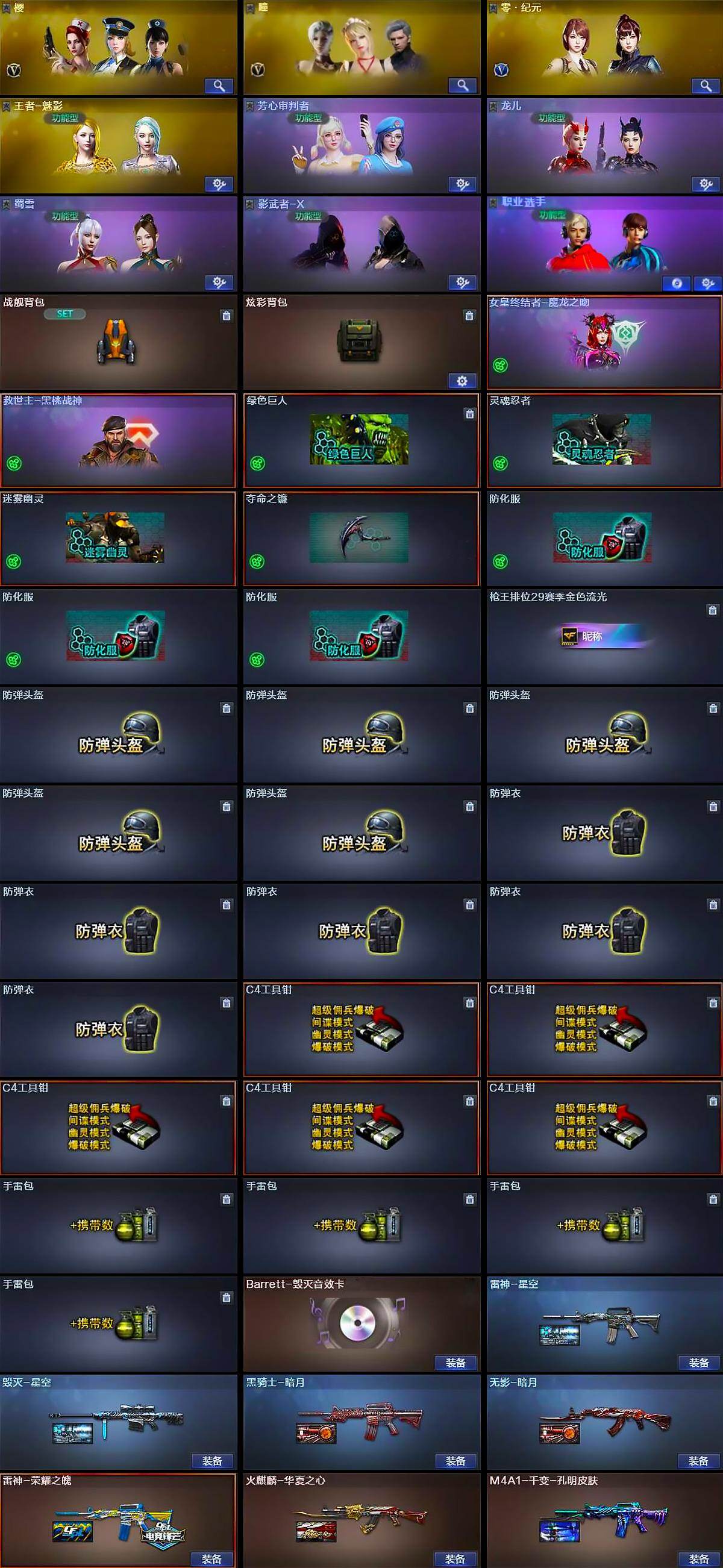 【道具】:战舰背包,炫彩背包,女皇终结者-魔龙之吻,救世主-黑桃战神,绿色巨人,灵魂忍者,迷雾幽灵,夺命之镰,防化服*3,枪王排位29赛季金色流光,防弹头盔*5,防弹衣*5,C4工具钳*5,手雷包*4