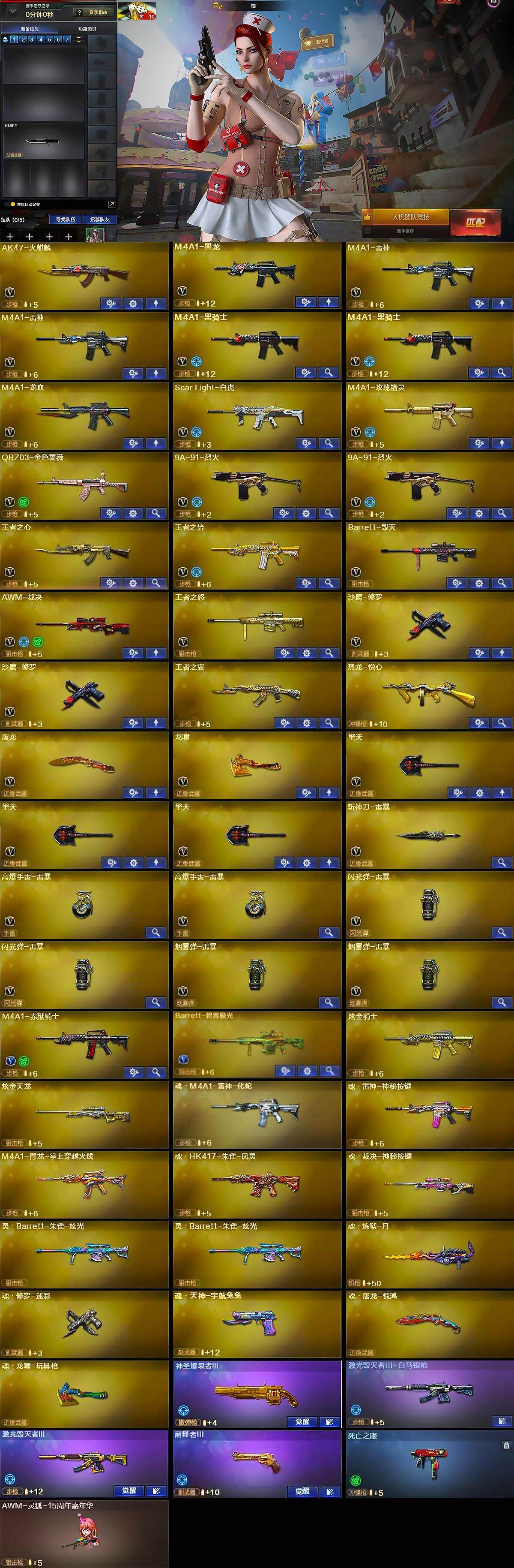 【英雄级武器】:AK47-火麒麟,M4A1-黑龙,M4A1-雷神*2,M4A1-黑骑士*2,M4A1-龙血,Scar Light-白虎,M4A1-玫瑰精灵,QBZ03-金色蔷薇,9A91-烈火*2,王者之心-觉醒版,王者之势-觉醒版,Barrett-毁灭,AWM-裁决,王者之怒-觉醒版,沙鹰-修罗*2,屠龙,龙啸,擎天*3,斩神刀-雷暴,高爆手雷-雷暴*2,闪光弹-雷暴*2,烟雾弹-雷暴*2,M4A1-赤狱骑士,Barrett-碧霄极光