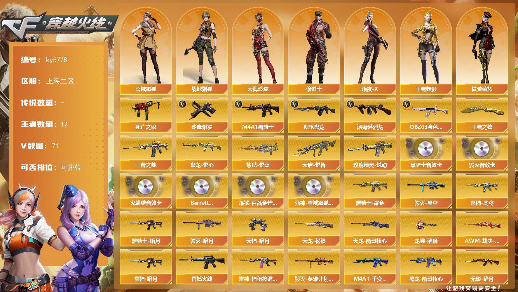 [18032962]【ky5778】上海二区-73V-12王者武器数-0炫金武器数 【热门武器】:QBZ03-金色蔷薇,死亡之眼,M4A1-黑骑士,汤姆逊-烈龙*6,RPK-盘龙*6,沙鹰-修罗*5 【王者炫金武器】:天启-悦智,玫瑰精灵-悦动*2,王者之魄,盘龙-悦心*3,炼狱-悦蓝*2,王者之锋 【音效卡】:AK47-火麒麟音效卡,M4A1-黑骑士音效卡,Barrett-毁灭音效卡,Barrett-碧霄极光音效卡,炼狱-百战金芒-庆典舞曲音效卡,死神-雪域霜狐-怀旧音效卡 【皮肤】:金色蔷薇-电竞之星 皮肤,AWM-裁决-凤灵皮肤,雷神-暗月,雷神-虎将,M4A1-再燃火线,雷神-神秘按键 皮肤,毁灭-暗月*5,毁灭-星空,毁灭-英雄计划 皮肤,M4A1-千变-孔明皮肤,黑龙-能量核心,黑骑士-暗月*2,黑骑士耀金皮肤,无影-暗月*6,无影-能量核心,死神-秘银,天启-暗月*3,战神-紫绶金章皮肤*3,战神-流金岁月皮肤*2,天龙-秘银*2,天龙-能量核心,修罗-能量核心*3,修罗-百战金芒 皮肤,天神-暗月*2,龙啸-醒狮 皮肤,轻型军用手斧-再燃火线 【角色】:零,葵,樱,战地猎狐,王者-魅影,雪域霜狐,修道士,云海玲珑,暗夜-X,芳心审判者,风暴女,零-水下丽影,龙儿,铁骑荣耀,影武者-X 【人偶武器】:迷你深渊冰龙*2,迷你牛牛,迷你生化手雷,生化手雷-机甲核心,闪光弹-小乔,巴雷特-赏金猎人 【暴走生化】:死亡之眼,超级对讲机 【挑战大师】:激光毁灭者III,KAC-圣炎切割者III 【英雄级武器】:M4A1-千变,AK47-火麒麟*2,M4A1-雷神*4,M4A1-黑骑士,AK47-无影,M4A1-死神,AK47-黑武士,死神-雪域霜狐,QBZ03-金色蔷薇,王者之幻-觉醒版,AK-47-猩红传说*5,AK47-B-战神,QBZ-03-王者蔷薇-觉醒版,AWM-天龙,Barrett-毁灭,AWM-裁决,Barrett-金色蔷薇*2,RPK-盘龙*6,炼狱-百战金芒,汤姆逊-烈龙*6,沙鹰-修罗*5,沙鹰-天神,屠龙*3,龙啸,麒麟刺-堕天神,擎天,麒麟刺*3,麒麟刺-百战金芒,高爆手雷-堕天神,闪光弹-堕天神,烟雾弹-堕天神,M4A1-赤狱骑士,M4A1-苍鸣雷神,AWM-昌龙,Barrett-碧霄极光 【道具】:CFS限定背包,云山科技背包,炫彩背包-诺拉,炫彩背包