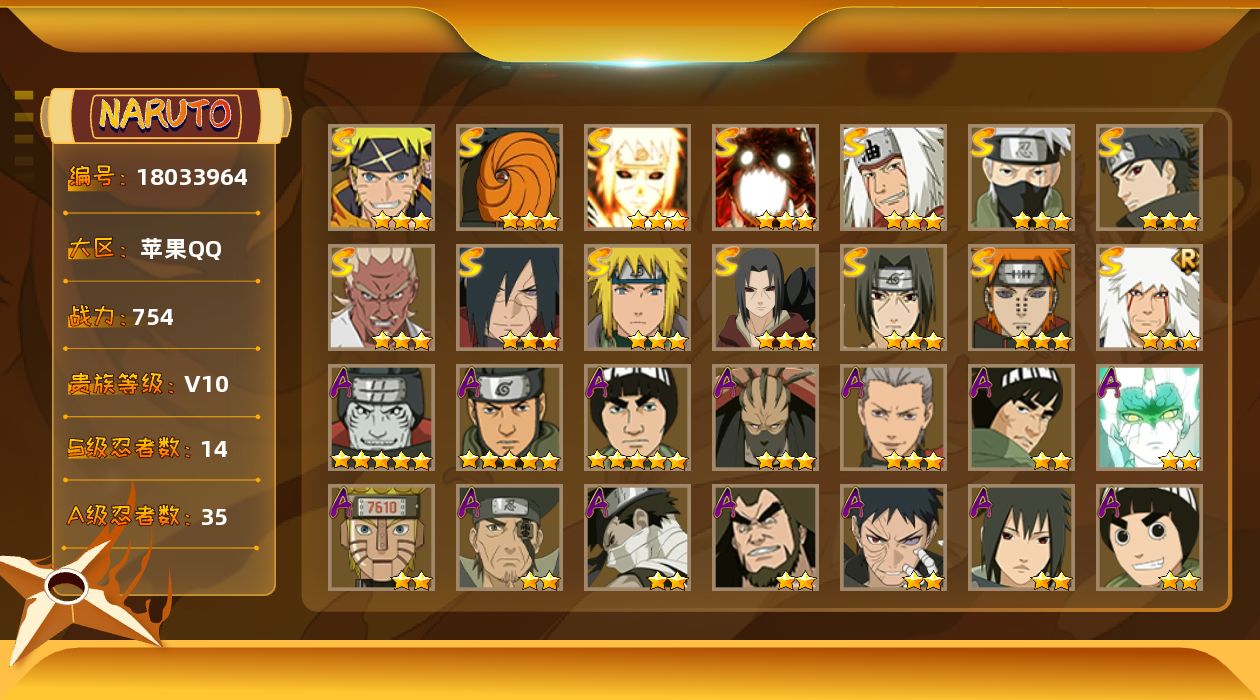 [18033964]14S级忍者数-35A级忍者数 【S级忍者】:宇智波鼬「秽土转生」(3星),宇智波斑「秽土转生·解」(3星),艾「忍界大战」(3星),宇智波鼬「须佐能乎」(3星),宇智波止水「须佐能乎」(3星),旗木卡卡西「须佐能乎」(3星),自来也「舞之豪杰」(3星),自来也「传说中的三忍」(3星),波风水门(3星),佩恩「天道」(3星),漩涡鸣人「暴怒·第六尾」(3星),波风水门「九喇嘛连结」(3星),宇智波斑「五影会谈」(3星),漩涡鸣人·宇智波佐助(3星) 【A级忍者】:长门「青年」(2星),波风水门「青年」(2星),迪达拉(2星),飞段(3星),飞段「死司凭血」(2星),干柿鬼鲛(5星),漩涡博人「桃式显现」(2星),机械鸣人「初始形态」(2星),迈特凯(5星),旗木卡卡西「幻之真容」(2星),桃地再不斩「漂泊武士」(2星),桃地再不斩「秽土转生」(2星),我爱罗「疾风传」(2星),我爱罗「新春限定」(2星),蝎(2星),蝎「绯流琥」(3星),小南「漂泊浪客」(2星),小南「神驹佑将」(2星),猿飞阿斯玛(5星),猿飞阿斯玛「秽土转生」(2星),宇智波鼬(2星),宇智波鼬「夏日限定」(2星),宇智波佐助「须佐能乎」(2星),药师兜「半蛇斗篷」(2星),日向雏田「最终章」(2星),宇智波带土「漂泊浪客」(2星),李洛克「忍界大战」(2星),秋道丁次「忍界大战」(2星),千代「近松十人卫」(2星),神农「羁绊」(2星),土台「忍界大战」(2星),不缘(2星),宇智波泉奈(2星),巳月「仙人模式」(2星),迈特凯「青春爆炸」(2星)