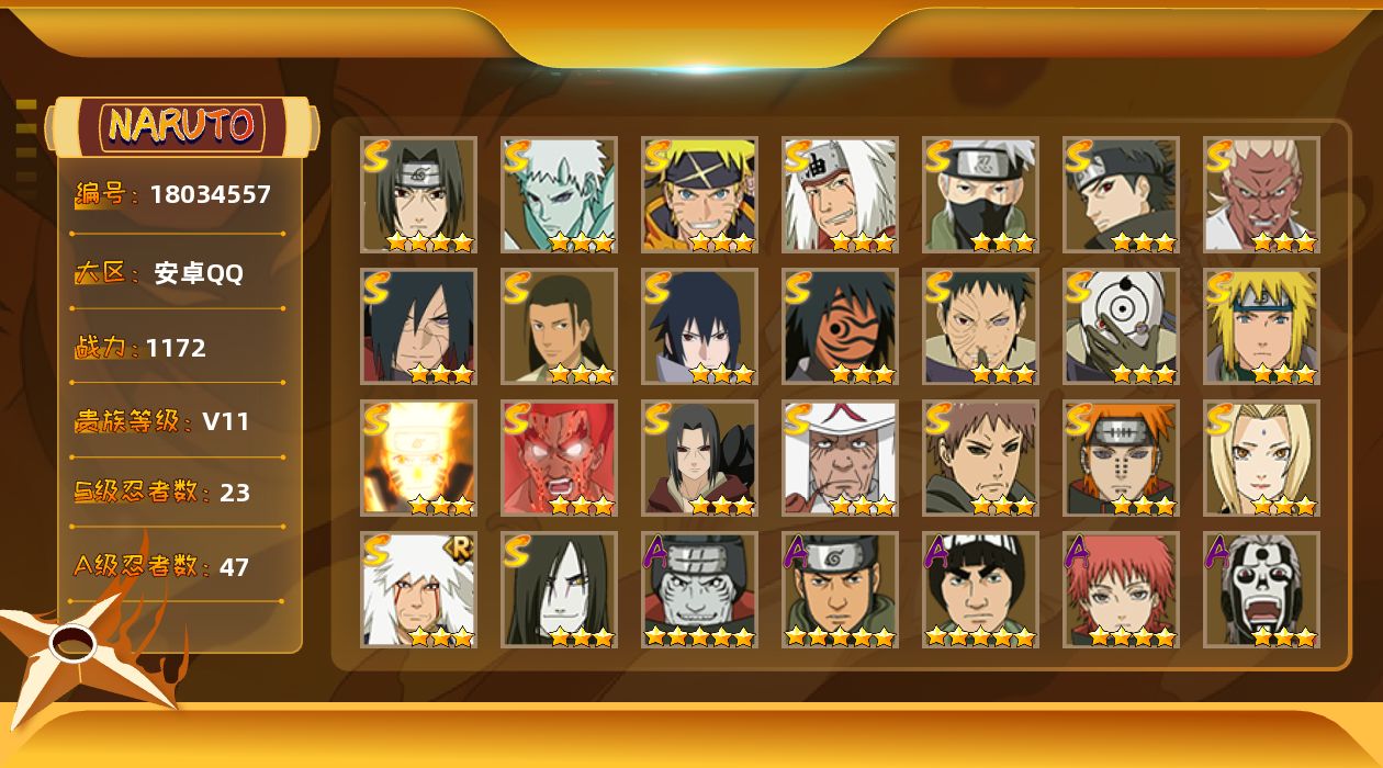 - [11547601]V12 34S忍 48A忍 20通灵 1089.7W战力 可二次 可修改实名 优质装备:熊猫,千手柱间「秽土转生」,罗砂「四代目风影」,宇智波鼬「秽土转生」,佩恩·天道「超」,宇智波斑「秽土转生」,艾「三代目雷影」,宇智波斑 「木叶创立」,千手扉间「秽土转生」,纲手「百豪」,波风水门「秽土转生」,猿飞日斩「秽土转生」,长门「秽土转生」,宇智波鼬「秽土转生」,迈特凯「死门」,宇智波带土 「忍界大战」,“宇智波斑” 「白面具」,漩涡鸣人 「九喇嘛连结」,大筒木金式「博人传」,春野樱 「忍界大战」,神秘面具男 「红夜之刃」,宇智波佐助「永恒万花筒」,千手柱间·木叶创立,宇智波斑「秽土转生·解」,大筒木桃式,艾「忍界大战」,宇智波止水「须佐能乎」,旗木卡卡西「须佐能乎」,大筒木舍人 「最终章」,自来也 「传说中的三忍」 S级忍者:大野木 「忍界大战」,自来也 「舞之豪杰」,宇智波鼬 「须佐能乎」,佩恩「天道」,波风水门,大蛇丸