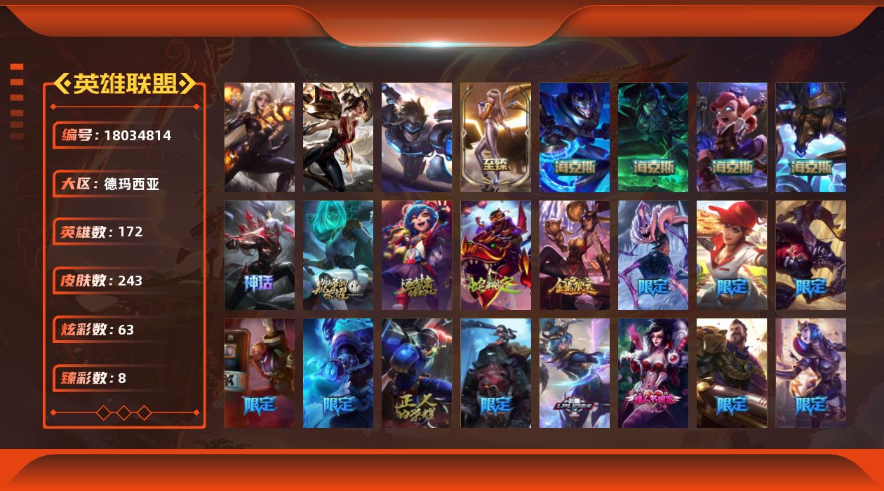 - [17511436]钻石段位-172英雄-309皮肤-43炫彩-1终极-3神话-47限定-24传说-64史诗 【神话皮肤】:十周年纪念安妮,十五周年纪念希维尔,水晶泰坦诺提勒斯 【臻彩皮肤】:冠军之志瑞兹凯旋圣装 【年限皮肤】:古琴余韵娑娜,定海神珍孙悟空,你看见过我的熊猫吗安妮,广寒仙子嫦娥,天龙之子李青 【冰雪限定】:持胡萝卜的雪人易,圣诞狂欢努努和威朗普,胡桃夹子萨科,邪恶圣诞老人维迦,喜庆之树茂凯,圣诞驯鹿克格莫,冰雪节辛吉德 【终极皮肤】:灵魂守卫乌迪尔 【限定皮肤】:创星之灵璐璐,穿星魔锋赵信,Fnatic嘉文四世,Fnatic库奇,暗杀星奥莉安娜,SKTT1薇恩,SSW辛吉德,SKTT1扎克,SSG塔莉垭,FPX墨菲特,电玩女神阿狸,暗裔英雄盖伦,胜利枪神格雷福斯,胜利女神奥莉安娜,胜利之剑亚托克斯,胜利枪神卢锡安,胜利巨口克格莫,胜利女神娑娜,胜利剑圣易,胜利之运崔斯特,胜利女神菲奥娜,南瓜头费德提克,鬼影重重魔腾,无头骑士赫卡里姆,泳池派对塔里克,暗影沃里克,野兽猎人德莱文,野兽猎人瑟庄妮,波比的巧克力工坊,勇者阿狸,都铎王朝图奇,御星魔矢艾希,钢铁之翼艾尼维亚,惊悚派对费德提克 【传说皮肤】:地狱之门卫士加里奥,血石领主弗拉基米尔,大天使长米迦勒凯尔,恶魔男爵瑞兹,黑夜使者索拉卡,女皇艾希,绅士科加斯,战地巨兽科加斯,双重冰晶艾尼维亚,黯晶凤凰艾尼维亚,律政大亨蒙多,灵能特工娑娜,最终BOSS维迦,冰川巨兽墨菲特,神拳李青,神龙尊者圣龙李青,第三类接触黑默丁格,驯龙学者黑默丁格,钢铁军团盖伦,冰霜亚龙希瓦娜,焰尾妖狐阿狸,符文战熊沃利贝尔,宇航员诺提勒斯,蔷薇绅士杰斯 【史诗皮肤】:冰霜烈焰安妮,铁钩船长费德提克,圣光审判凯尔,铁血剑豪易,战争机器赛恩,钢铁之心希维尔,火箭达人崔丝塔娜,狼外婆沃里克,法国皇室厄运小姐,黑帮狂花厄运小姐,女船长厄运小姐,百夫长贾克斯,炼金狂士辛吉德,小小骑士阿木木,飞越疯人院萨科,武动巅峰萨科,恐惧新星普朗克,绝代智将斯维因,抵抗军天使凯特琳,古墓丽影凯特琳,无畏号墨菲特,蓝焰梦魔魔腾,符文战神雷克顿,死亡绽放伊莉丝,斗战胜佛孙悟空,防弹武僧李青,至高之拳李青,地下拳王李青,屠龙勇士薇恩,深海妖姬卡西奥佩娅,四神之力乌迪尔,军神战甲波比,血色之锤波比,钢铁意志潘森,银色之牙阿卡丽,刺客信条凯南,血色精锐锐雯,帝王斑蝶克格莫,腥红之月