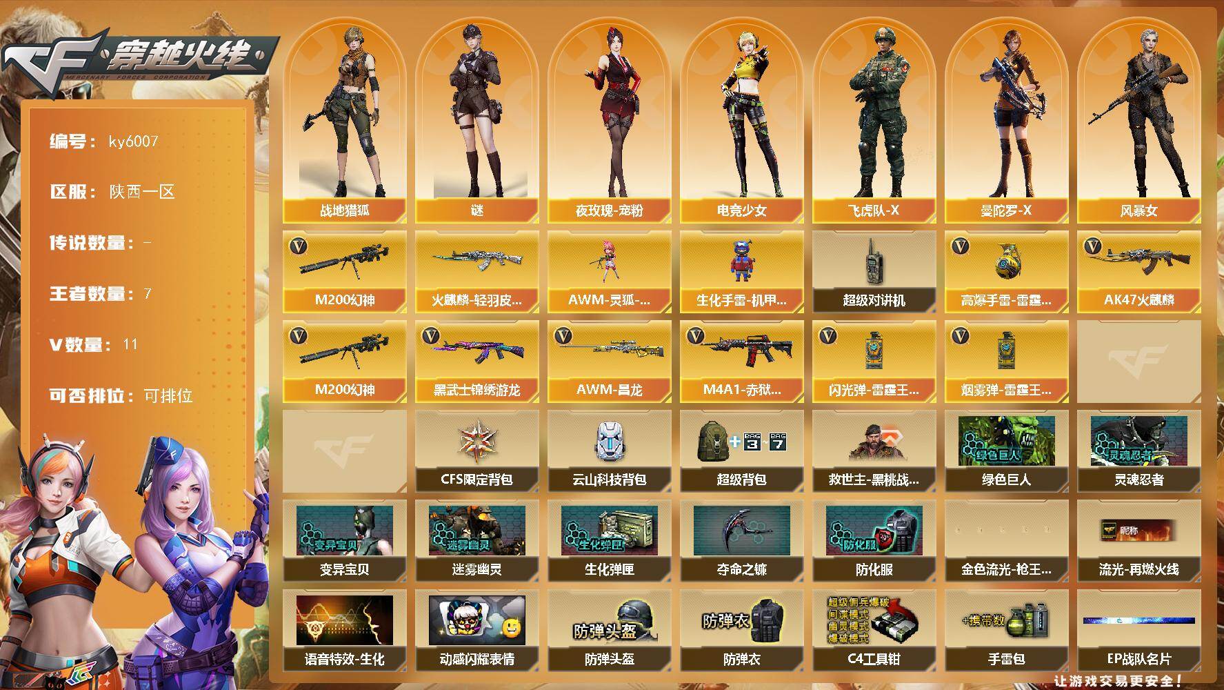 [18035537]【ky6007】陕西一区-17V-7王者武器数-0炫金武器数 【热门武器】:M200-幻神 【皮肤】:火麒麟-轻羽皮肤 【角色】:谜,战地猎狐,电竞少女,飞虎队-X,风暴女,曼陀罗-X,夜玫瑰-宠粉 【人偶武器】:AWM-灵狐-15周年嘉年华,生化手雷-机甲核心 【暴走生化】:超级对讲机 【英雄级武器】:AK47-火麒麟,黑武士-锦绣游龙,HK417-朱雀-电竞之星,机械迷城-穹宇,M200-幻神,高爆手雷-雷霆王者-觉醒版*2,闪光弹-雷霆王者-觉醒版*3,烟雾弹-雷霆王者-觉醒版*2,M4A1-赤狱骑士,AWM-昌龙 【道具】:CFS限定背包,云山科技背包,超级背包,救世主-黑桃战神,绿色巨人,灵魂忍者*2,变异宝贝,迷雾幽灵*2,生化弹匣,夺命之镰,防化服*2,金色流光-枪王排位,星辰流光-枪王排位,流光-再燃火线,枪王排位28赛季金色流光,语音特效-生化,动感闪耀表情,EP战队名片,EP战队喷图,防弹头盔*2,防弹衣*2,C4工具钳*2,手雷包*2 【特殊枪械】: