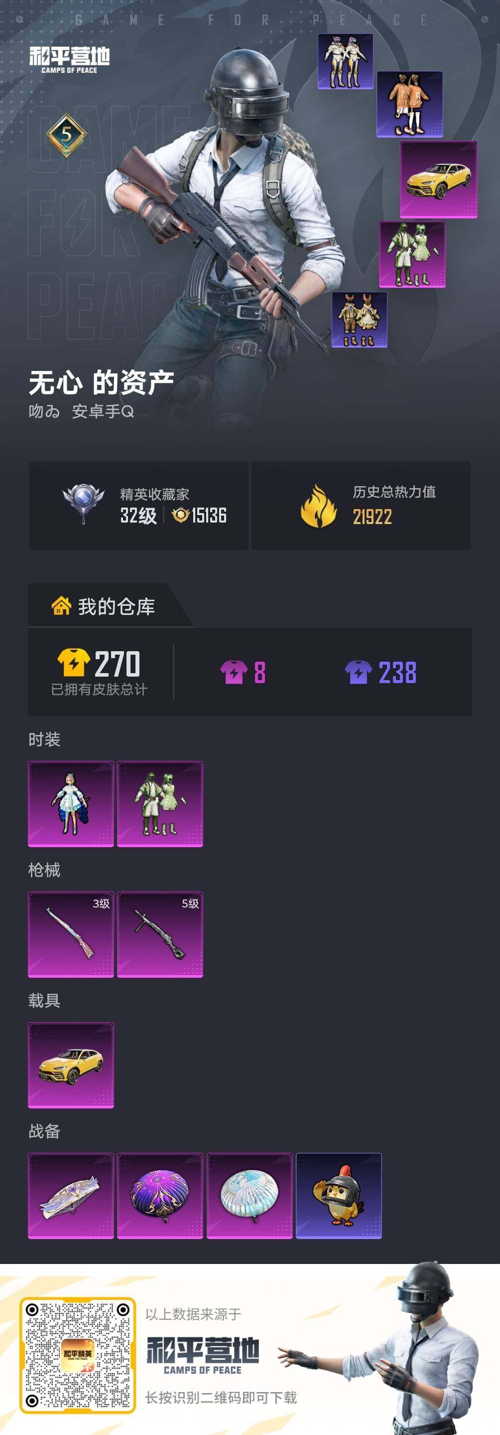 - [12956352]素材身法号 安卓 手Q-1神装-6粉装-9特效枪-1载具-9粉色飞行器-7.9w热力值-13王牌印记-183套装-233枪皮【红色神装等级】:最终圣卫者-帕修斯(二级)【热门品类】:粉装-梦幻火箭,角色-军刀雅典娜,套装-龟仙人,大砍刀-青龙偃月刀【粉色载具】:玛莎拉蒂Ghibli(蓝)【粉色套装】:粉装-梦幻火箭,粉装-碧影闪光,粉装-闲梦青缨,角色-千金淑猫,角色-玄冥寒域,角色-冷漠罗丽【粉色枪皮等级】:SCAR-L-锦绣绵绵(五级),M416-五爪金龙(七级),M416-电玩时刻(五级),GROZA-镜光银凌(五级),Vector-环太平洋(六级),Vector-最终圣卫者(三级),Kar98K-巳巳如意(五级),S12K-海渊国主(六级),DP-28-豹影疾电(五级)【粉色飞行器】:梦幻火箭飞行器,星之彼岸飞行器,齐天大圣飞行器,星夜魔法师飞行翼,闪光银龙飞行器,夜幕颂歌飞行器,圣域金龙飞行器,终晖之翼飞行器,灵猫魔法师飞行器