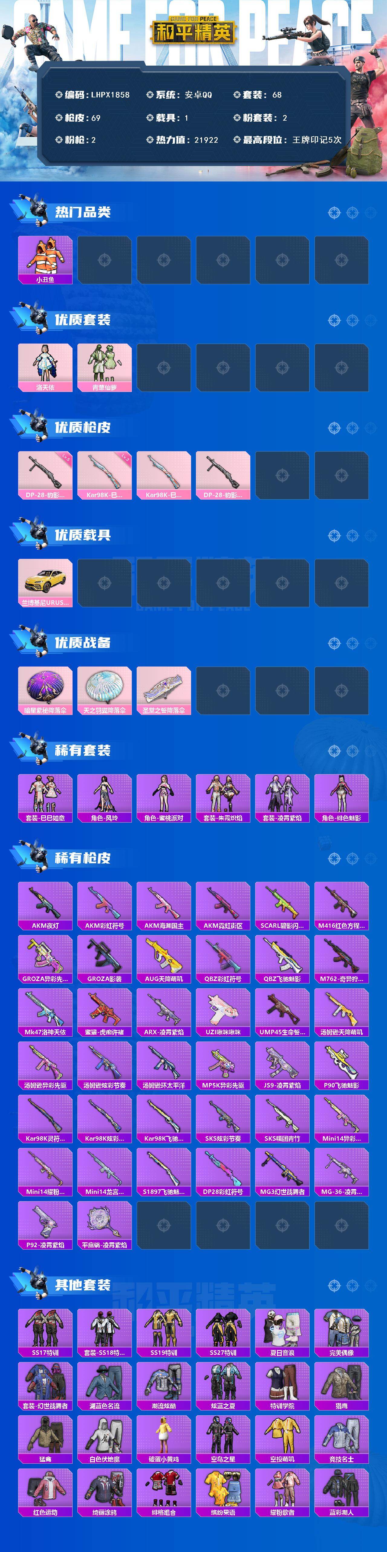 - PX_2061684- 安卓手Q-12王牌印记-16粉装-9特效枪-2载具-85537热力值-209套装-261枪皮-0卓越印记-0传奇印记 【16粉装】,星穹咏叹调,恐龙拽拽,炙焰赤龙,飓风飞鹰,金曜白虎,华贵君王,星之信仰,复仇流浪者,冰炎战车,紫钛骑兵,圣堂之誓,银河战甲,莲影清波,女娲灵识,山涧鹿灵,暗夜鎏金 【9特效枪】AKM-幽焰骑士-3级 M416-风花雪月-7级 Kar98K-巳巳