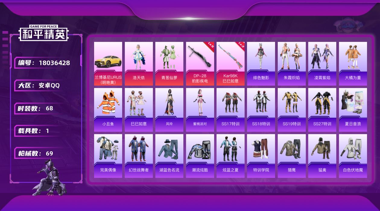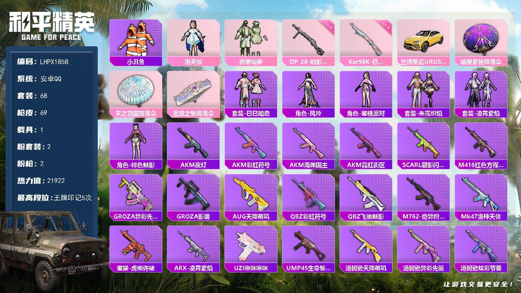 [18036428]【特价出售/店主推荐】安卓 手Q-2粉装-2特效枪-1载具-21922热力值-5王牌印记-68套装-69枪皮【热门品类】:套装-小丑鱼【粉色套装】:角色-洛天依,粉装-青葱仙萝【粉色枪皮等级】:Kar98K-巳巳如意(三级),DP-28-豹影疾电(五级)【粉色载具】:兰博基尼URUS(明艳黄)