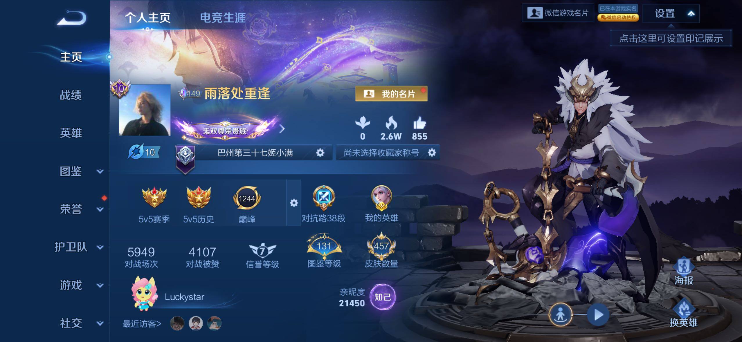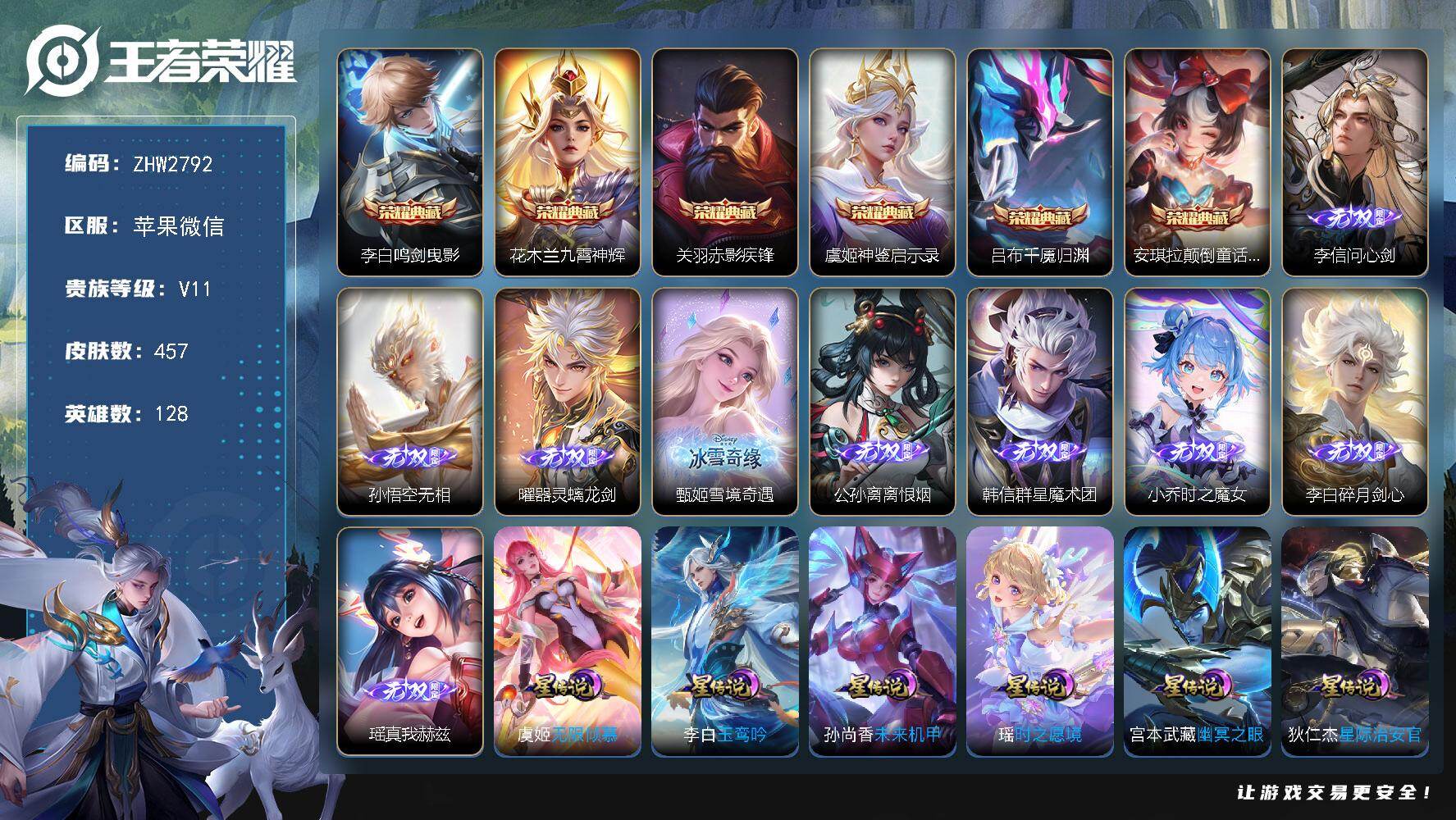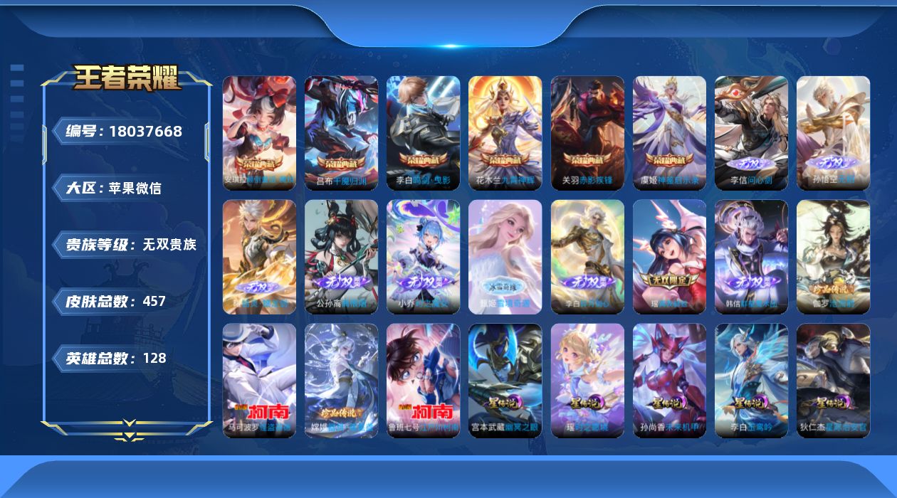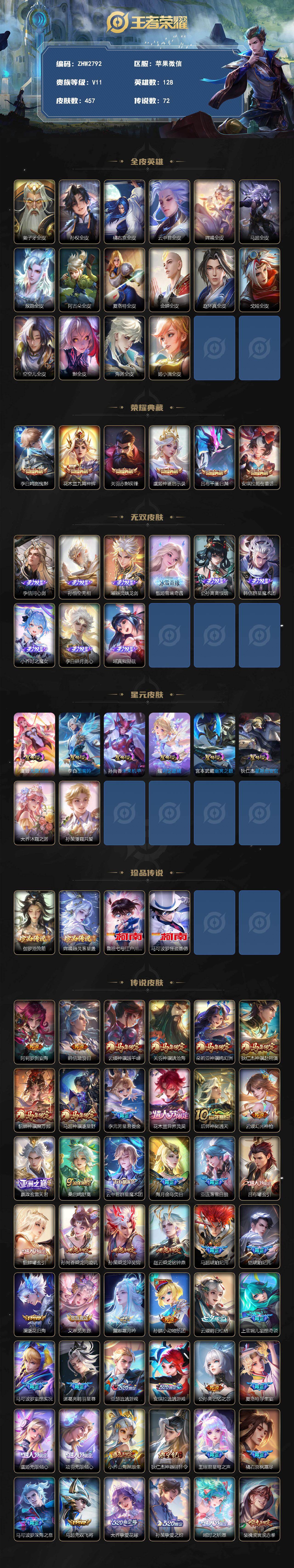 [18037668]苹果WX-V11-最强王者段位-128英雄-457皮肤-6典藏皮肤-9无双-4珍品传说-72传说-138史诗-8星元