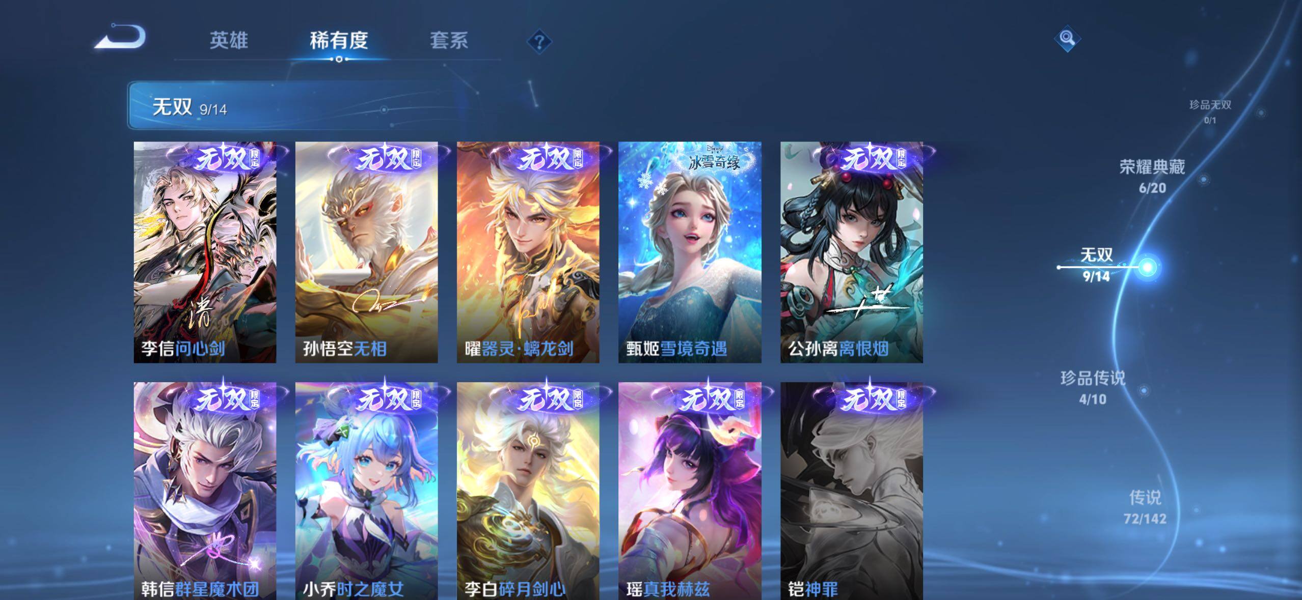 【无双皮肤】:李信问心剑,孙悟空无相,曜器灵螭龙剑,甄姬雪境奇遇,公孙离离恨烟,韩信群星魔术团,小乔时之魔女,李白碎月剑心,瑶真我赫兹