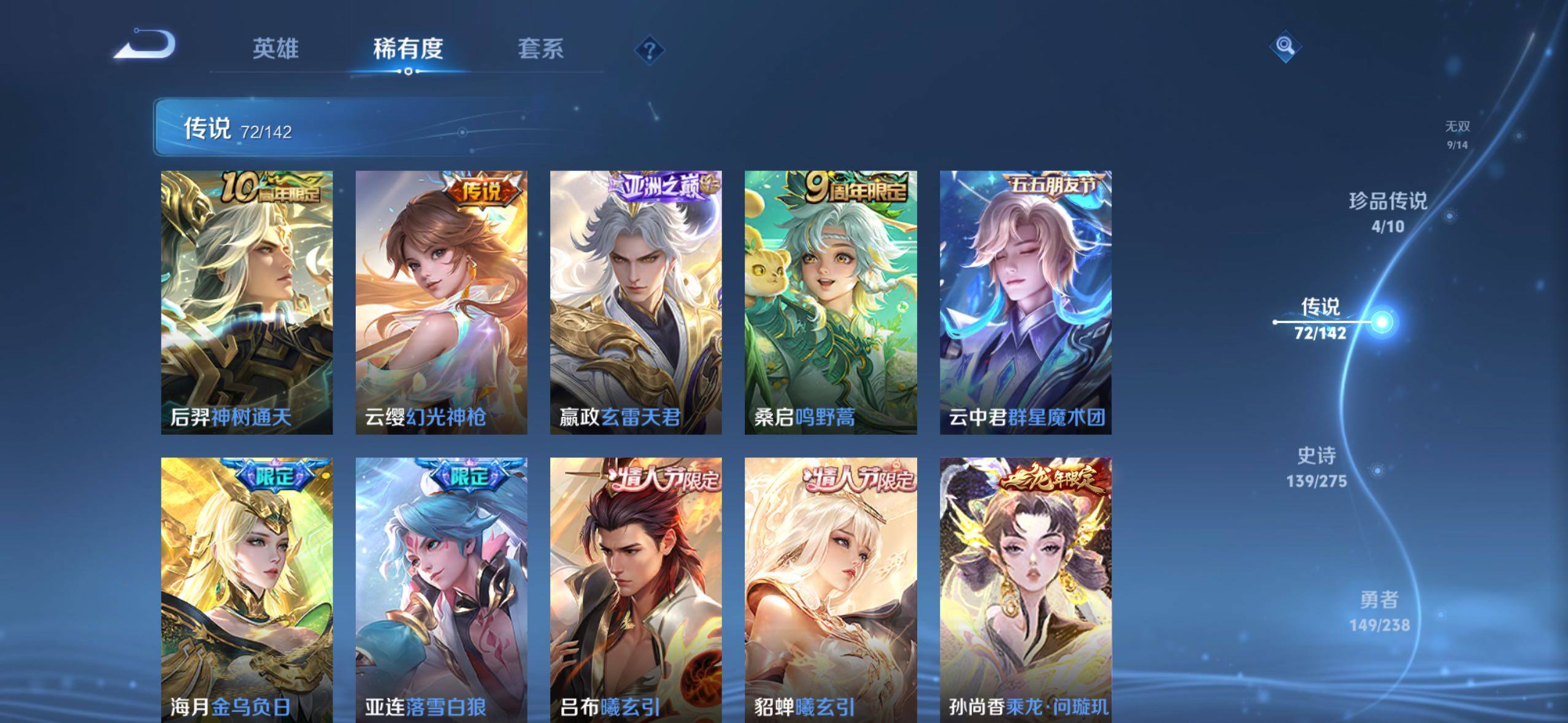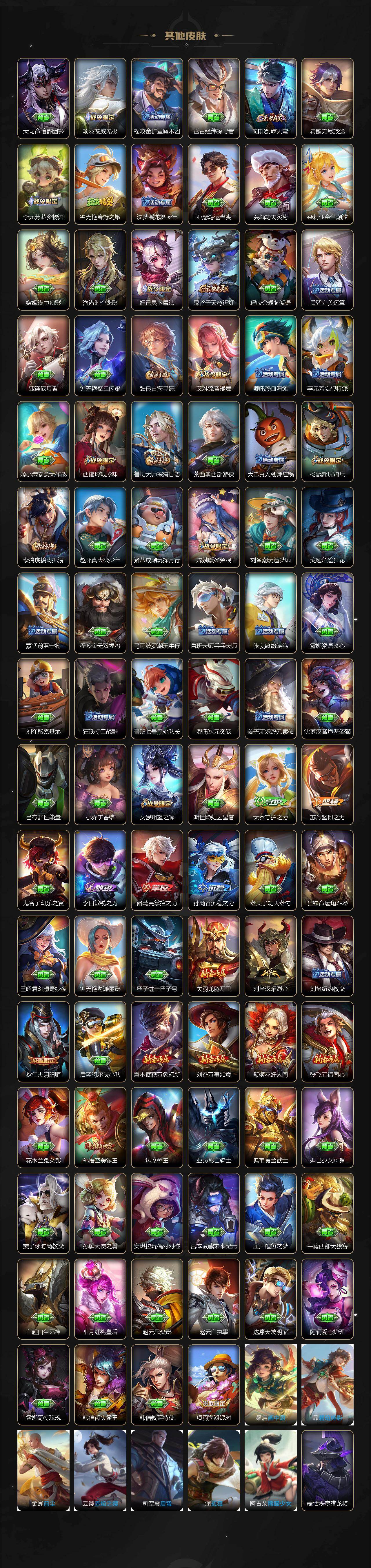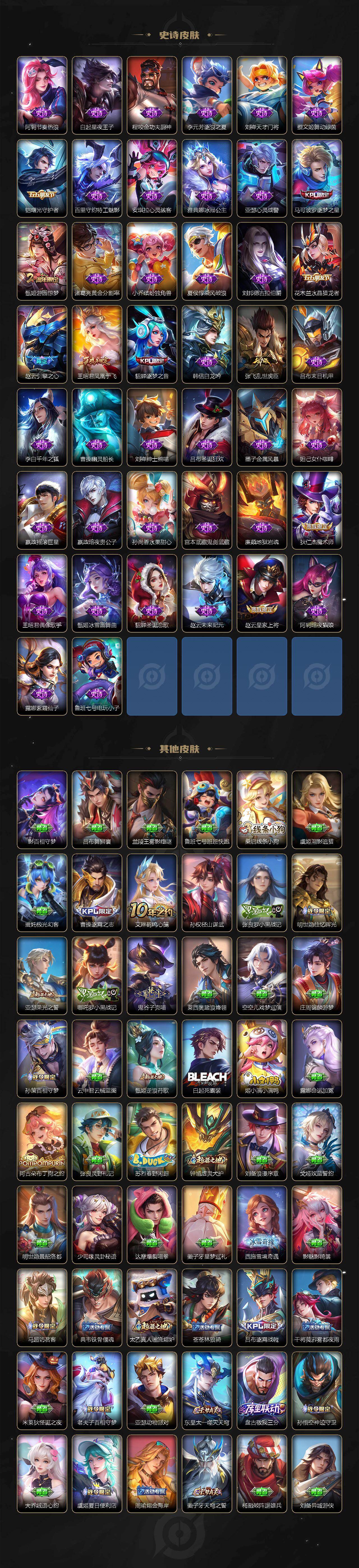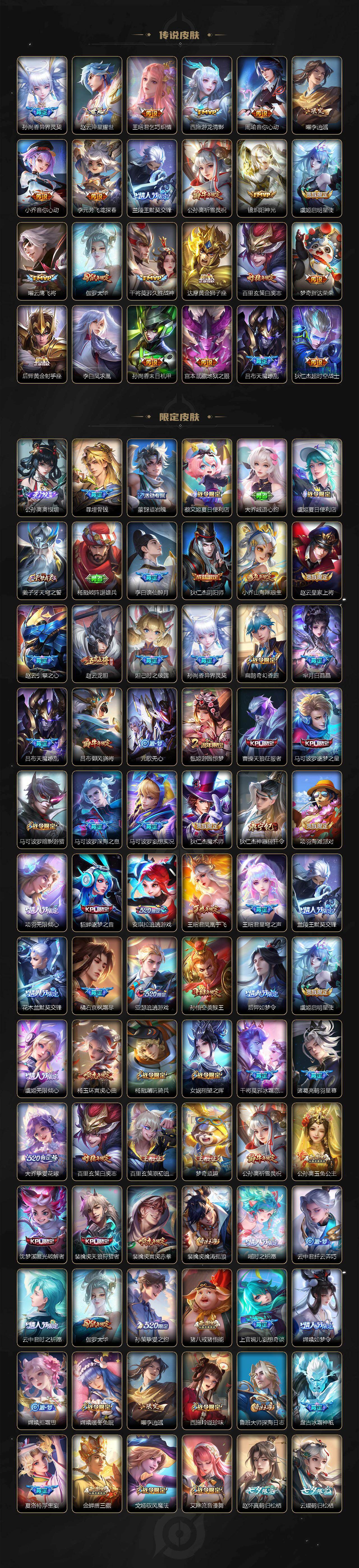 【传说皮肤】:阿轲罗刹妄海,韩信踏浪归,云缨神骥越千峰,关羽神骥镇沧海,朵莉亚神骥鸣幻洲,狄仁杰神骥赴朔漠,貂蝉神骥聚万邦,马超神骥逐星野,李元芳星君娄金,花木兰异界灵契,后羿神树通天,云缨幻光神枪,嬴政玄雷天君,桑启鸣野蒿,云中君群星魔术团,海月金乌负日,亚连落雪白狼,吕布曦玄引,貂蝉曦玄引,孙尚香乘龙问璇玑,孙策乘龙淬吴钩,赵云乘龙铭钟鼎,马超琥珀纪元,铠琥珀纪元,澜逐花归海,艾琳觅芳踪,露娜霜月吟,孙膑小动物乐团,云缨鹤归松栖,上官婉儿妄想奇谈,马可波罗妄想实况,诸葛亮鹤羽星尊,亚瑟追逃游戏,安琪拉追逃游戏,公孙离记忆之芯,夏洛特浮生妄,虞姬无限倾心,项羽无限倾心,小乔山海琳琅生,狄仁杰神器狴犴令,王昭君星穹之声,橘右京枫霜尽,马可波罗深海之息,马超无双飞将,大乔挚爱花嫁,孙策挚爱之约,瑶时之祈愿,裴擒虎寅虎赤拳,孙尚香异界灵契,赵云淬星耀世,王昭君乞巧织情,西施游龙清影,曜李逍遥 ,周瑜音你心动,小乔音你心动,李元芳飞鸢探春,兰陵王默契交锋,公孙离祈雪灵祝,镜炽阳神光,虞姬启明星使,曜云鹰飞将,伽罗太华,干将莫邪久胜战神,达摩黄金狮子座,百里玄策白虎志,梦奇胖达荣荣,后羿黄金射手座,李白凤求凰,孙尚香末日机甲,宫本武藏地狱之眼,吕布天魔缭乱,狄仁杰超时空战士