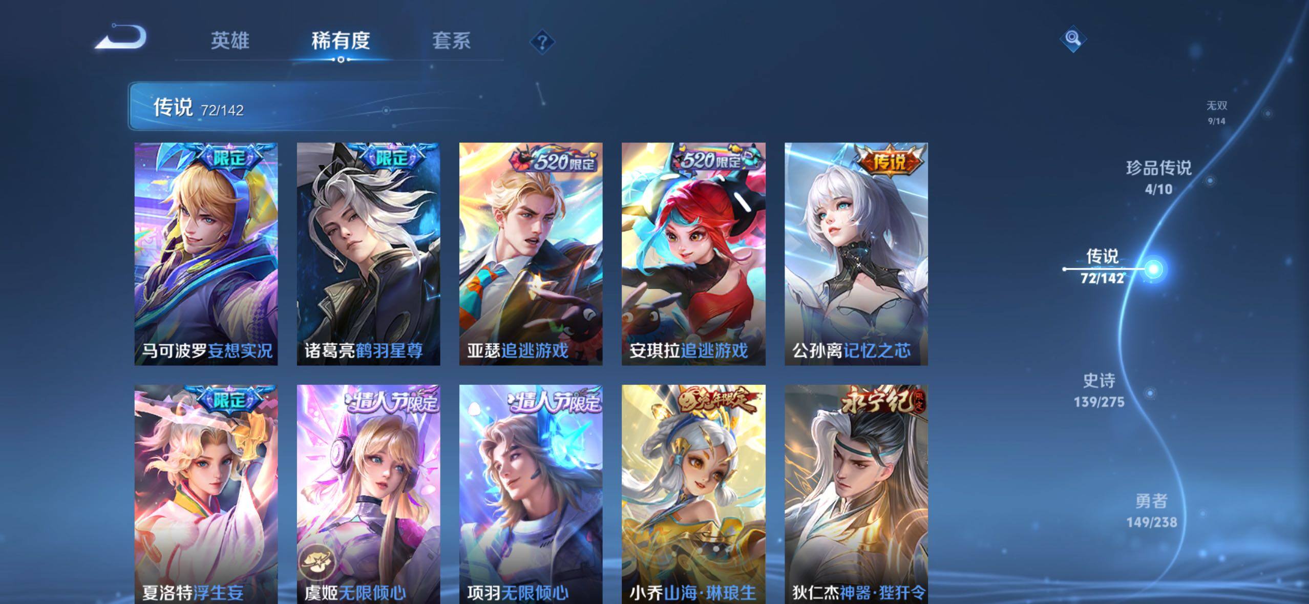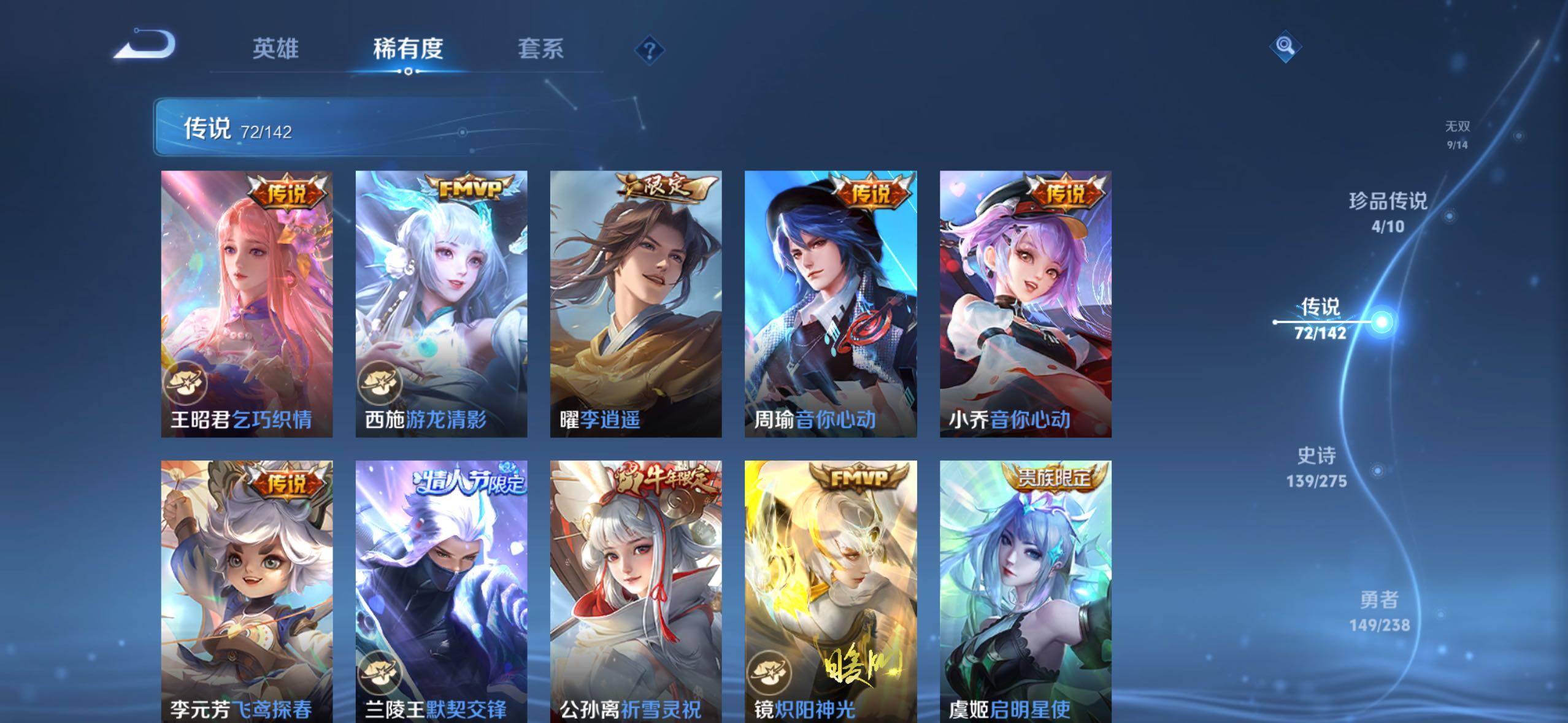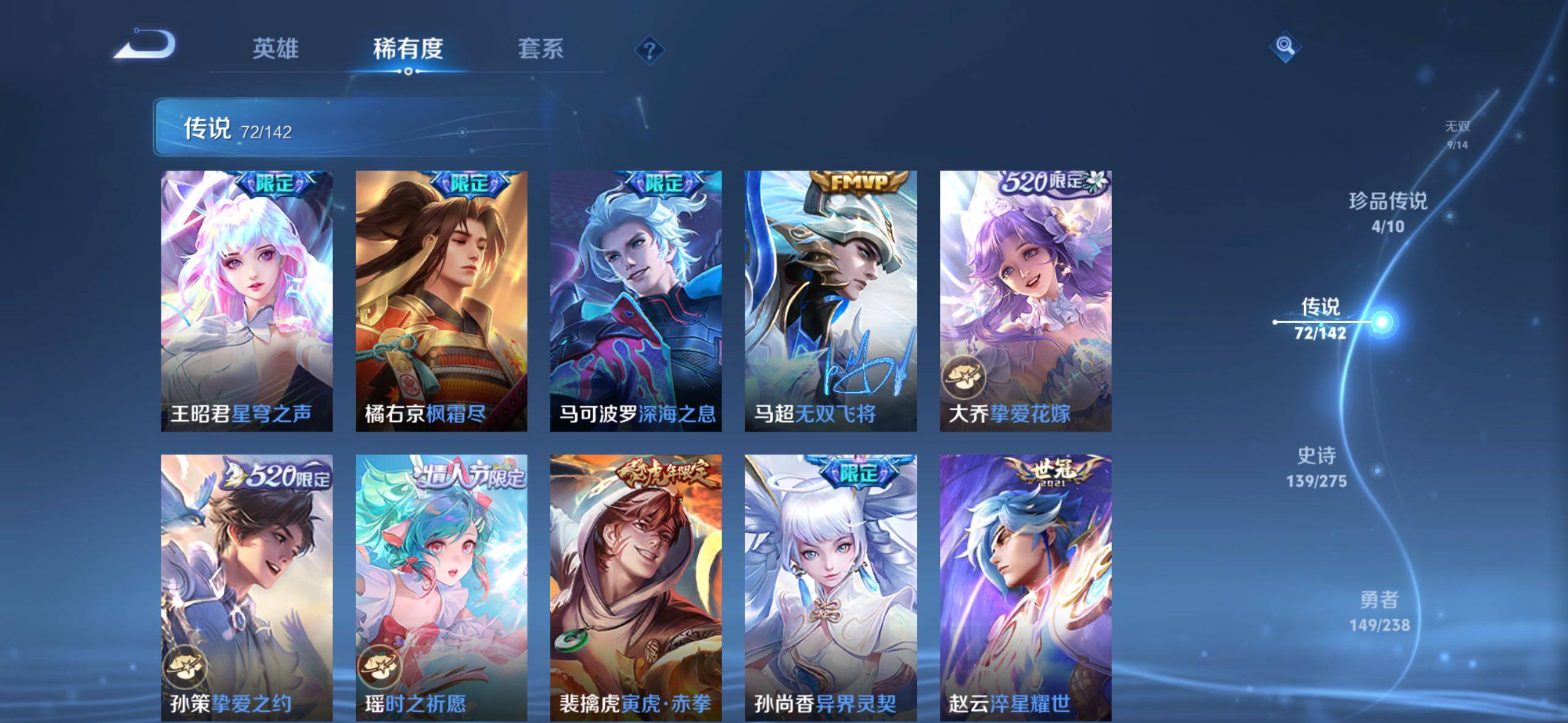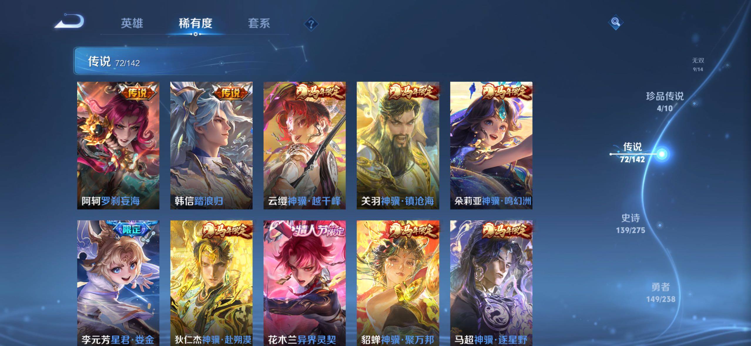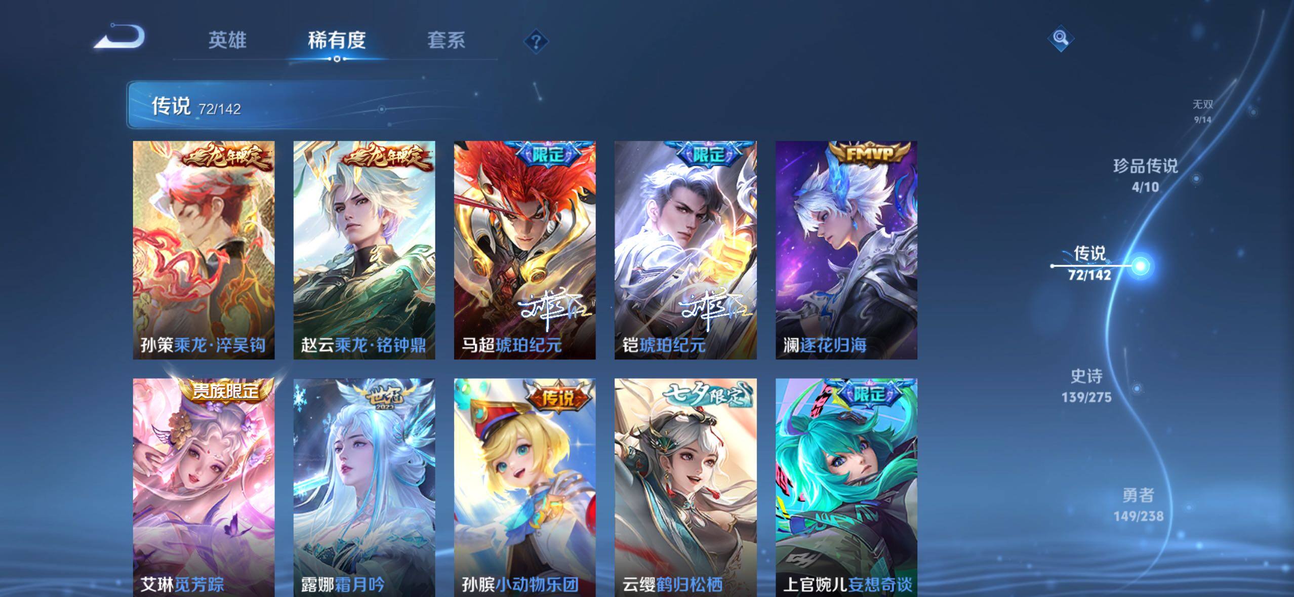 【传说皮肤】:阿轲罗刹妄海,韩信踏浪归,云缨神骥越千峰,关羽神骥镇沧海,朵莉亚神骥鸣幻洲,狄仁杰神骥赴朔漠,貂蝉神骥聚万邦,马超神骥逐星野,李元芳星君娄金,花木兰异界灵契,后羿神树通天,云缨幻光神枪,嬴政玄雷天君,桑启鸣野蒿,云中君群星魔术团,海月金乌负日,亚连落雪白狼,吕布曦玄引,貂蝉曦玄引,孙尚香乘龙问璇玑,孙策乘龙淬吴钩,赵云乘龙铭钟鼎,马超琥珀纪元,铠琥珀纪元,澜逐花归海,艾琳觅芳踪,露娜霜月吟,孙膑小动物乐团,云缨鹤归松栖,上官婉儿妄想奇谈,马可波罗妄想实况,诸葛亮鹤羽星尊,亚瑟追逃游戏,安琪拉追逃游戏,公孙离记忆之芯,夏洛特浮生妄,虞姬无限倾心,项羽无限倾心,小乔山海琳琅生,狄仁杰神器狴犴令,王昭君星穹之声,橘右京枫霜尽,马可波罗深海之息,马超无双飞将,大乔挚爱花嫁,孙策挚爱之约,瑶时之祈愿,裴擒虎寅虎赤拳,孙尚香异界灵契,赵云淬星耀世,王昭君乞巧织情,西施游龙清影,曜李逍遥 ,周瑜音你心动,小乔音你心动,李元芳飞鸢探春,兰陵王默契交锋,公孙离祈雪灵祝,镜炽阳神光,虞姬启明星使,曜云鹰飞将,伽罗太华,干将莫邪久胜战神,达摩黄金狮子座,百里玄策白虎志,梦奇胖达荣荣,后羿黄金射手座,李白凤求凰,孙尚香末日机甲,宫本武藏地狱之眼,吕布天魔缭乱,狄仁杰超时空战士