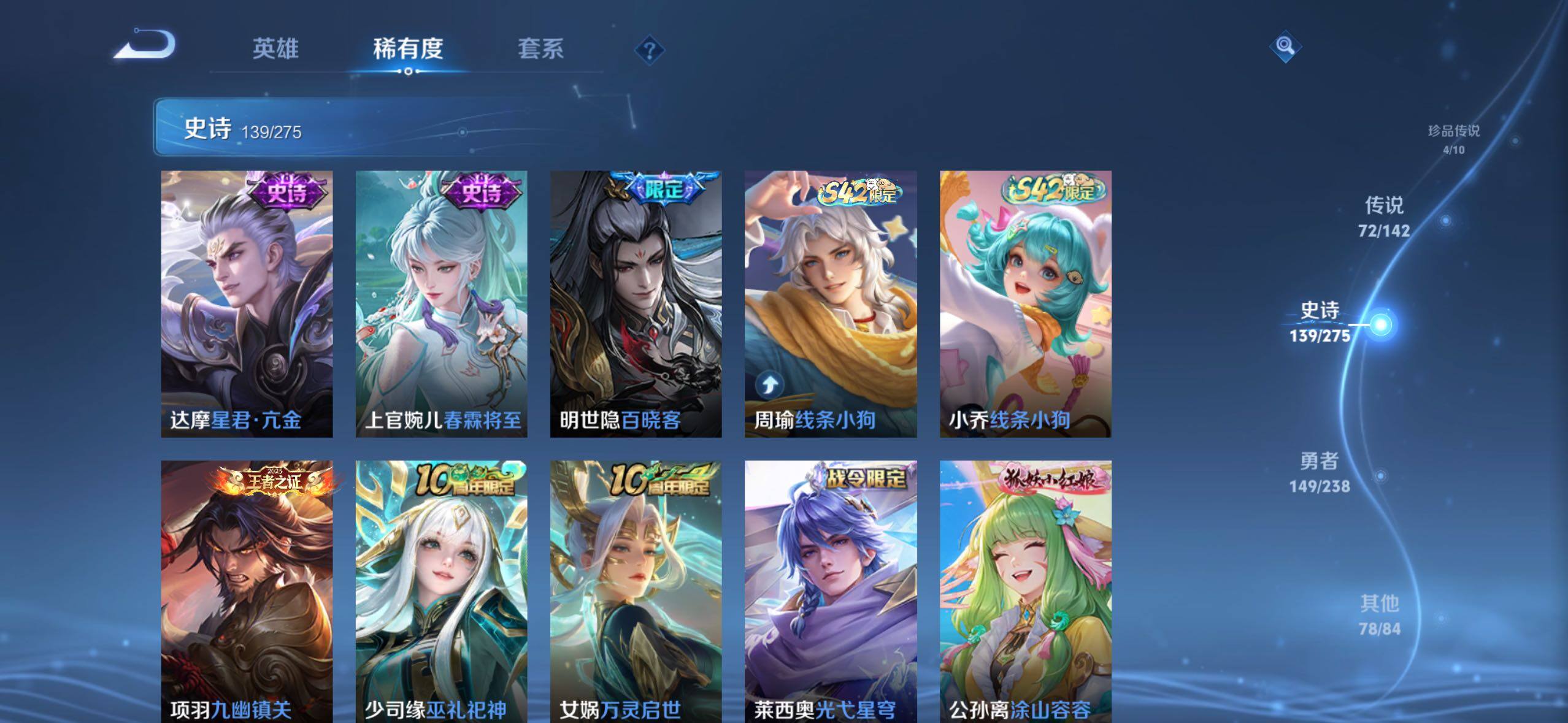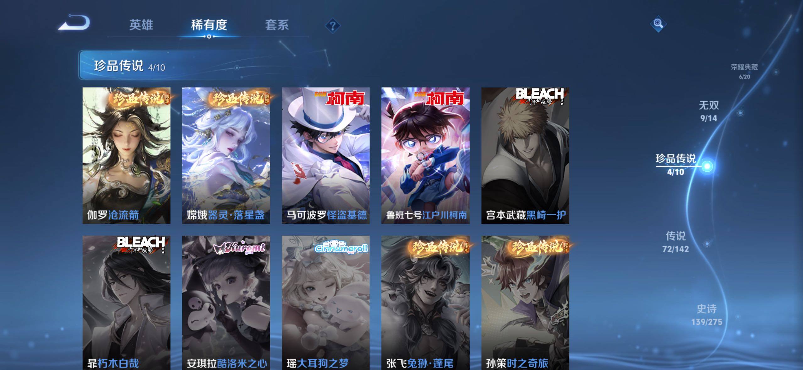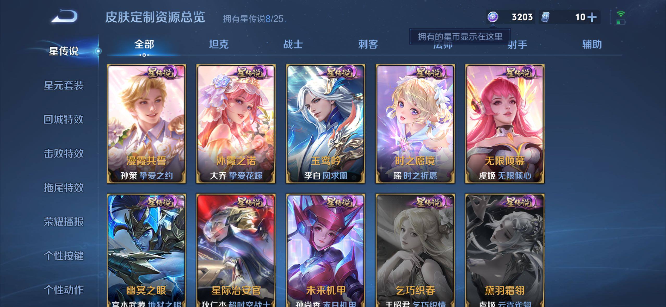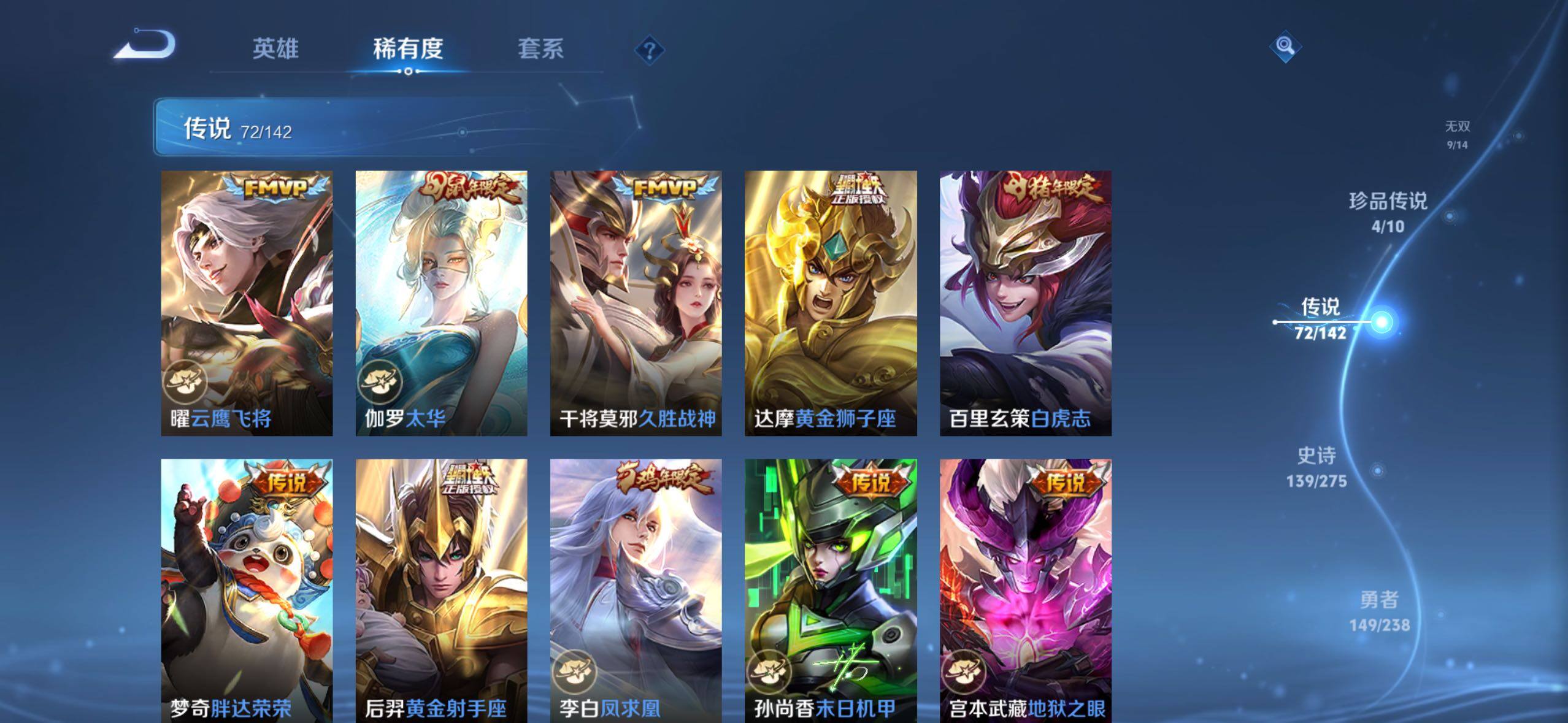 【传说皮肤】:阿轲罗刹妄海,韩信踏浪归,云缨神骥越千峰,关羽神骥镇沧海,朵莉亚神骥鸣幻洲,狄仁杰神骥赴朔漠,貂蝉神骥聚万邦,马超神骥逐星野,李元芳星君娄金,花木兰异界灵契,后羿神树通天,云缨幻光神枪,嬴政玄雷天君,桑启鸣野蒿,云中君群星魔术团,海月金乌负日,亚连落雪白狼,吕布曦玄引,貂蝉曦玄引,孙尚香乘龙问璇玑,孙策乘龙淬吴钩,赵云乘龙铭钟鼎,马超琥珀纪元,铠琥珀纪元,澜逐花归海,艾琳觅芳踪,露娜霜月吟,孙膑小动物乐团,云缨鹤归松栖,上官婉儿妄想奇谈,马可波罗妄想实况,诸葛亮鹤羽星尊,亚瑟追逃游戏,安琪拉追逃游戏,公孙离记忆之芯,夏洛特浮生妄,虞姬无限倾心,项羽无限倾心,小乔山海琳琅生,狄仁杰神器狴犴令,王昭君星穹之声,橘右京枫霜尽,马可波罗深海之息,马超无双飞将,大乔挚爱花嫁,孙策挚爱之约,瑶时之祈愿,裴擒虎寅虎赤拳,孙尚香异界灵契,赵云淬星耀世,王昭君乞巧织情,西施游龙清影,曜李逍遥 ,周瑜音你心动,小乔音你心动,李元芳飞鸢探春,兰陵王默契交锋,公孙离祈雪灵祝,镜炽阳神光,虞姬启明星使,曜云鹰飞将,伽罗太华,干将莫邪久胜战神,达摩黄金狮子座,百里玄策白虎志,梦奇胖达荣荣,后羿黄金射手座,李白凤求凰,孙尚香末日机甲,宫本武藏地狱之眼,吕布天魔缭乱,狄仁杰超时空战士