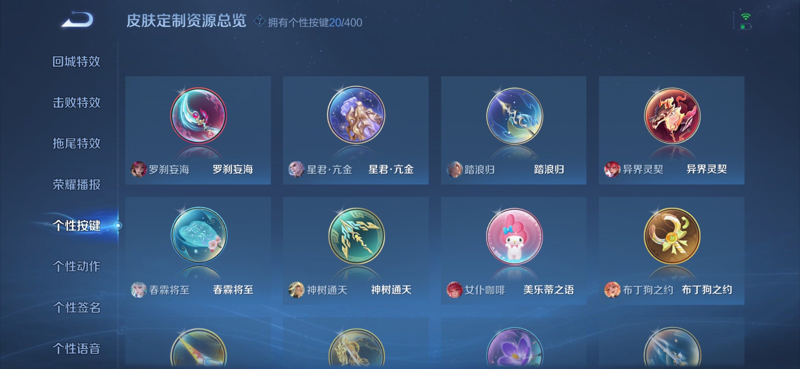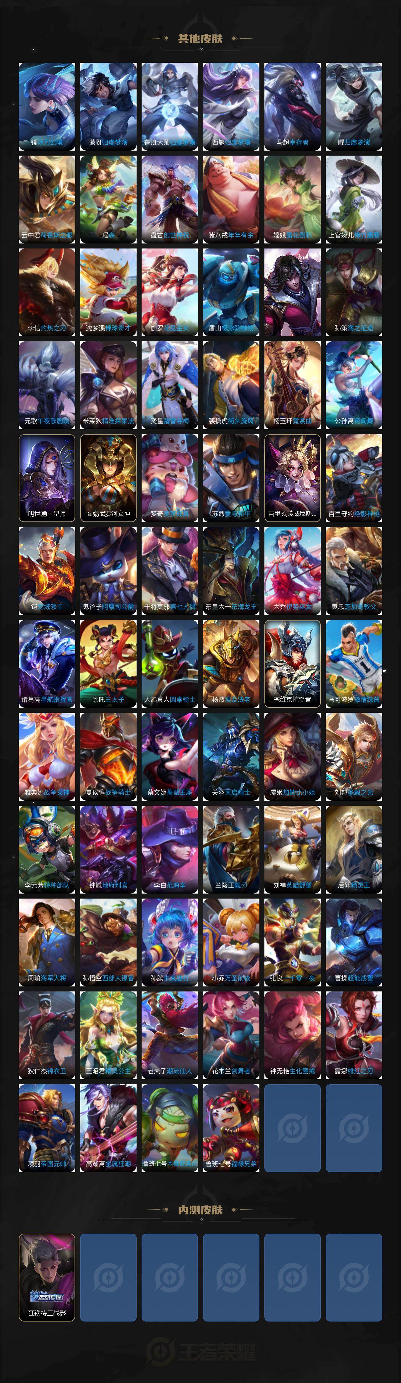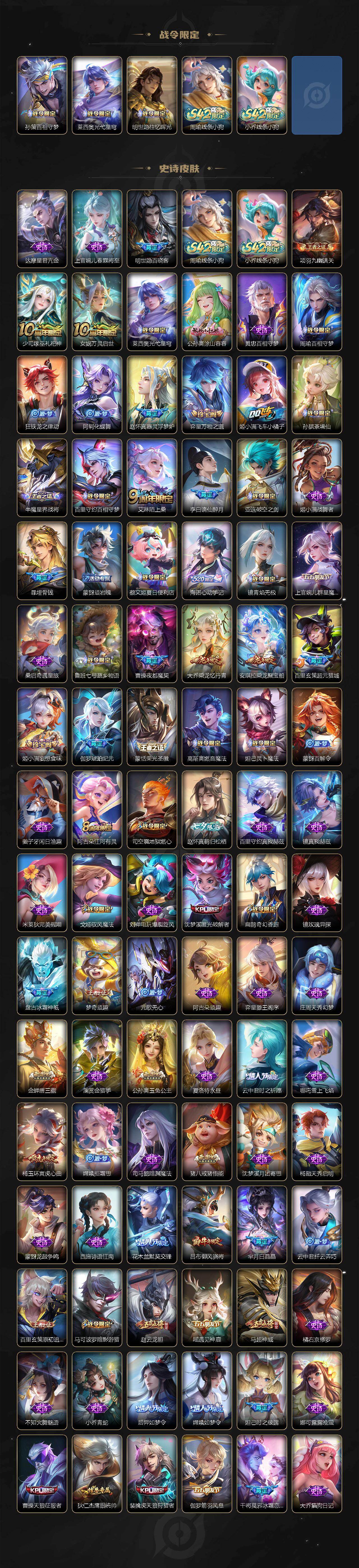 小乔青蛇,瑶遇见神鹿,娜可露露晚萤,伽罗箭羽风息,李元芳逐浪之夏,不知火舞魅语,大乔猫狗日记,阿轲节奏热浪,露娜紫霞仙子,诸葛亮黄金分割率,王昭君偶像歌手,韩信白龙吟,阿轲暗夜猫娘,雅典娜冰冠公主,吕布末日机甲,鲁班七号电玩小子,蒙犽龙鼓争鸣,橘右京修罗,嬴政摇滚巨星,刘禅绅士熊喵,刘禅天才门将,白起星夜王子,安琪拉心灵骇客,程咬金功夫厨神,刘邦德古拉伯爵,曹操幽灵船长,宫本武藏鬼剑武藏,司马懿暗渊魔法,亚瑟心灵战警,杨戬天秀·启明,蔡文姬舞动绿茵,廉颇地狱岩魂,西施诗语江南,小乔缤纷独角兽,夏侯惇乘风破浪,花木兰水晶猎龙者,铠曙光守护者,墨子金属风暴,百里玄策原初追逐者,吕布圣诞狂欢,貂蝉圣诞恋歌,百里守约特工魅影,嬴政暗夜贵公子,嫦娥拒霜思,李白千年之狐,哪吒雪上飞焰,夏洛特永昼,澜赏金猎手,庄周天秀·幻梦,弈星滕王阁序,阿古朵顽趣,镜玫瑰异探,沈梦溪匿光破解者,刘禅电玩·爆裂旋风,镜真我赫兹,百里守约真我赫兹,赵怀真鹤归松栖,姜子牙闲日渔趣,蒙犽百解令,高渐离燃音魔法,伽罗琥珀纪元,大乔乘龙·忆丹青,安琪拉乘龙·聚宝船,曹操夜都魔契,桑启奇遇星旅,上官婉儿群星魔术团,海诺心动手记,李白谪仙醉月,姬小满飞车小橘子,赵怀真器灵·浮梦炉