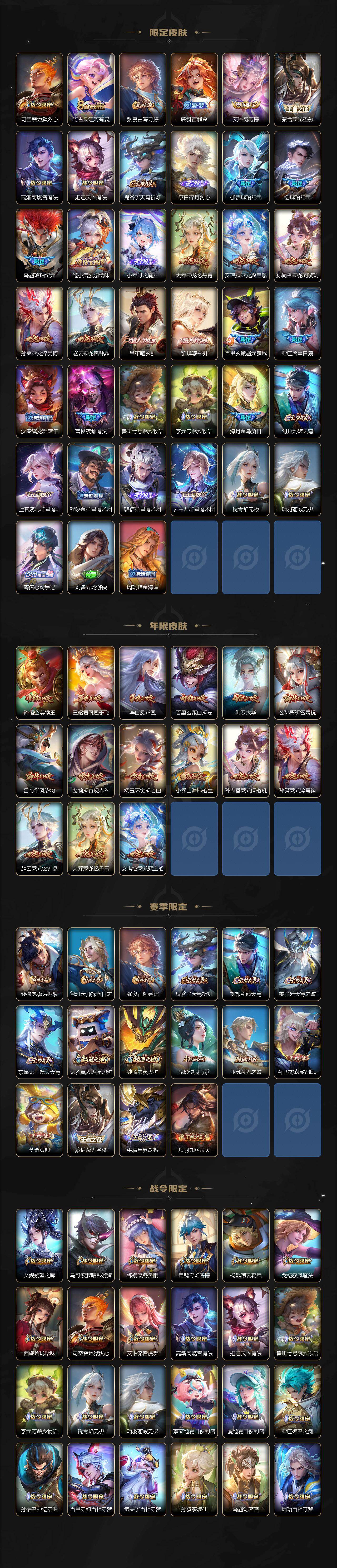 【限定皮肤】:公孙离离恨烟,暃埋骨钱,蒙犽顽岩魄,蔡文姬夏日便利店,大乔绒语心约,虞姬夏日便利店,姜子牙天穹之誓,杨戬破阵退雄兵,李白谪仙醉月,狄仁杰阴阳师,小乔山海琳琅生,赵云皇家上将,赵云引擎之心,赵云龙胆,妲己时之彼端,孙尚香异界灵契,扁鹊奇幻香踪,芈月白晶晶,吕布天魔缭乱,吕