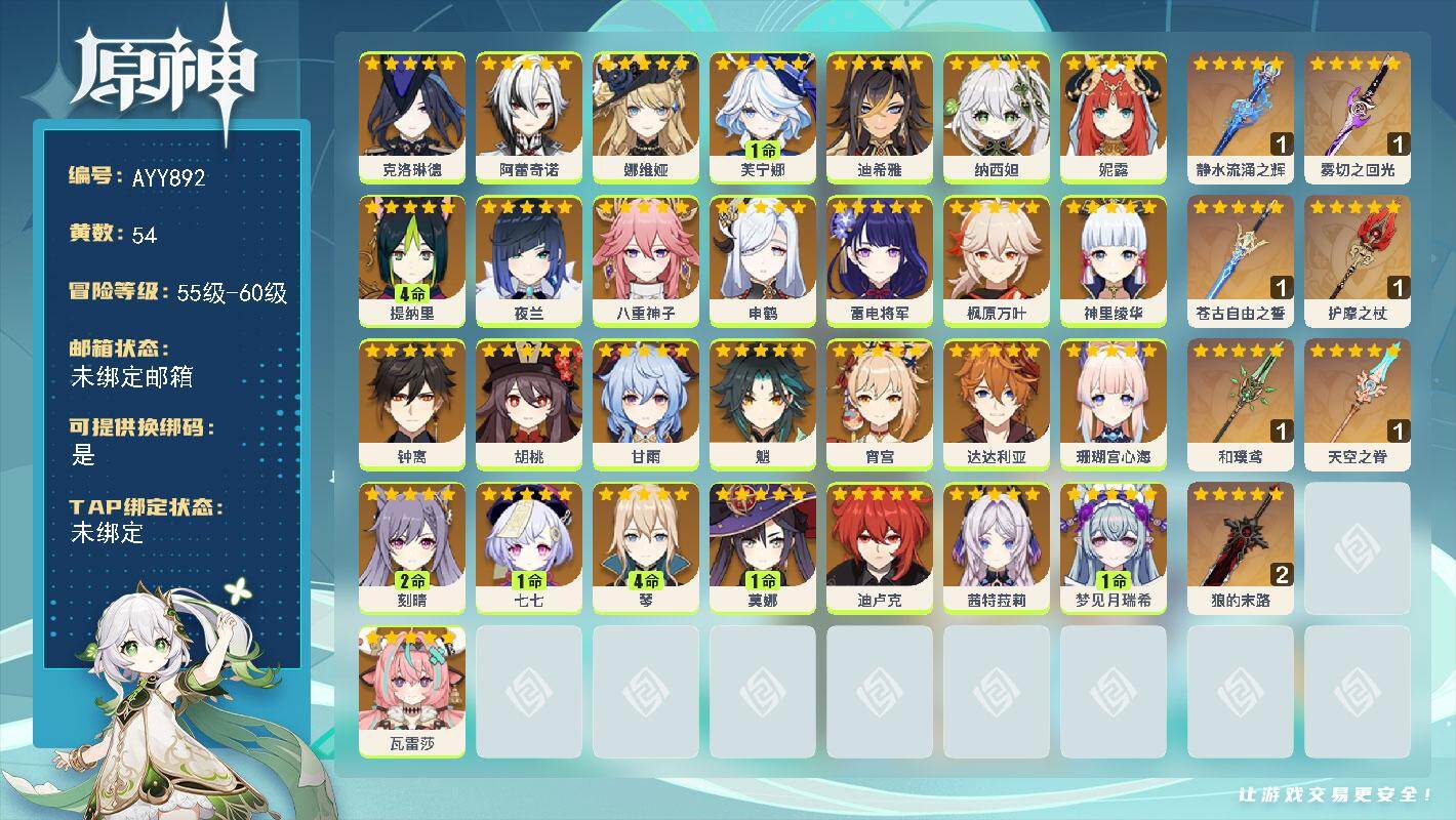 [18038068]60级/54黄/女主/29个五星角色/10个五星武器 0命克洛琳德,0命阿蕾奇诺,0命娜维娅,1命芙宁娜,0命迪希雅,0命纳西妲,0命妮露,4命提纳里,0命夜兰,0命八重神子,0命申鹤,0命雷电将军,0命枫原万叶,0命神里绫华,0命钟离,0命胡桃,0命甘雨,0命魈,0命宵宫,0命达达利亚,0命珊瑚宫心海,2命刻晴,1命七七,4命琴,1命莫娜,0命迪卢克,0命茜特菈莉,1命梦见月瑞希,0命瓦雷莎,精1静水流涌之辉,精1雾切之回光,精1苍古自由之誓,精1护摩之杖,精1和璞鸢,精1天空之脊,精2狼的末路