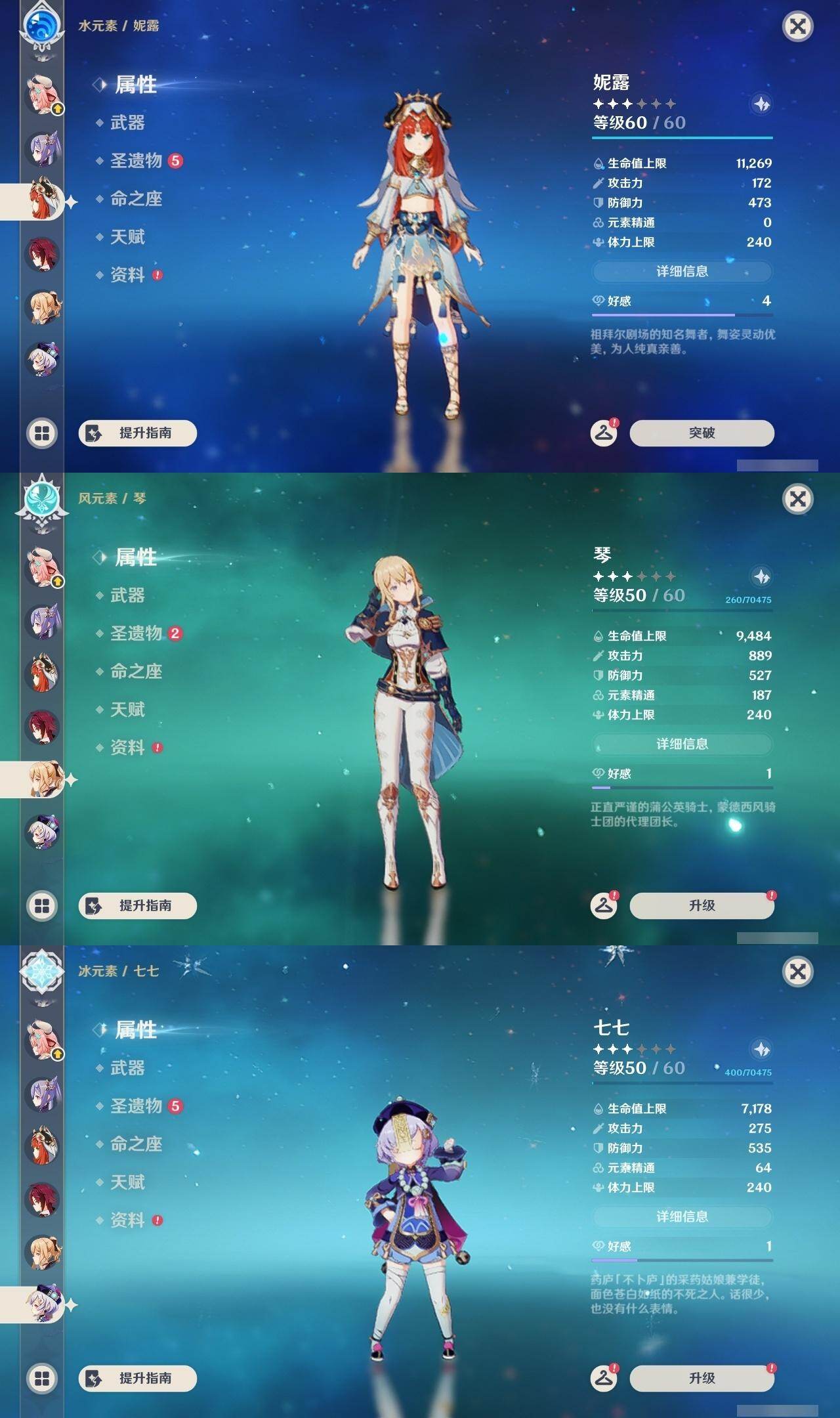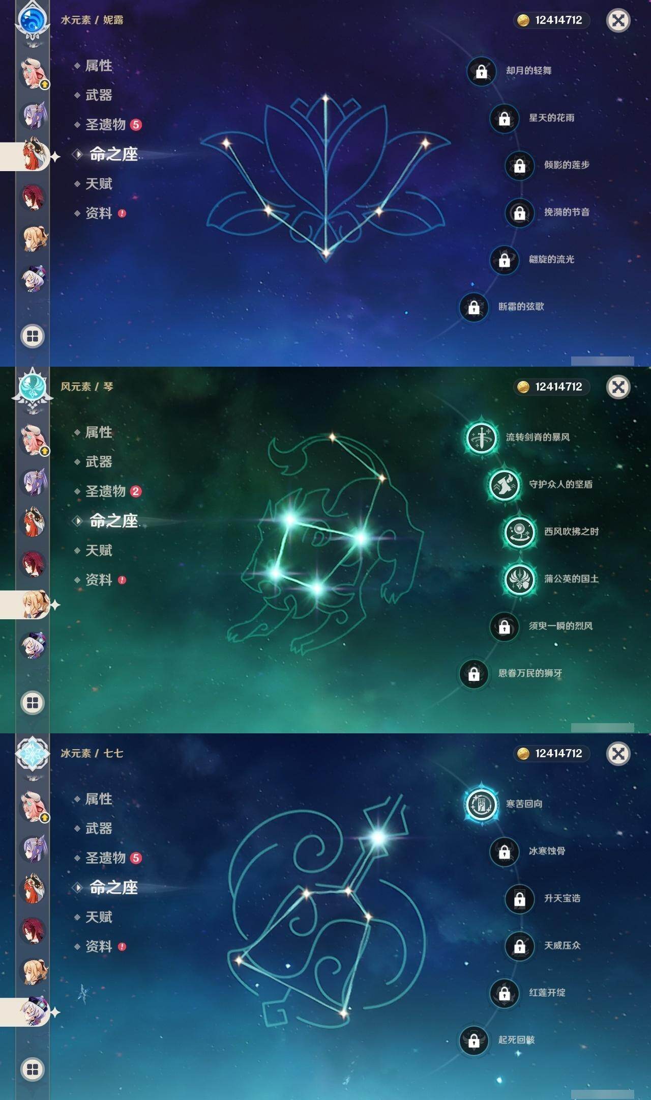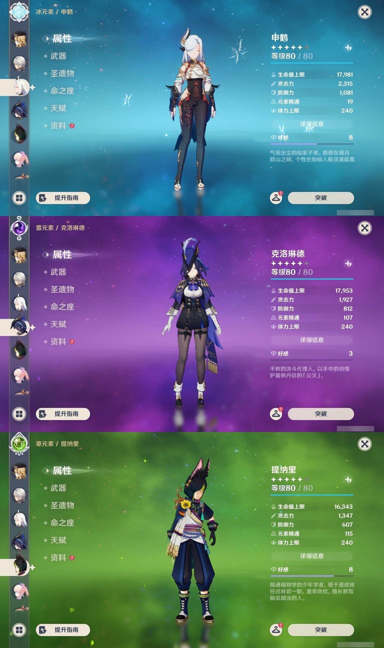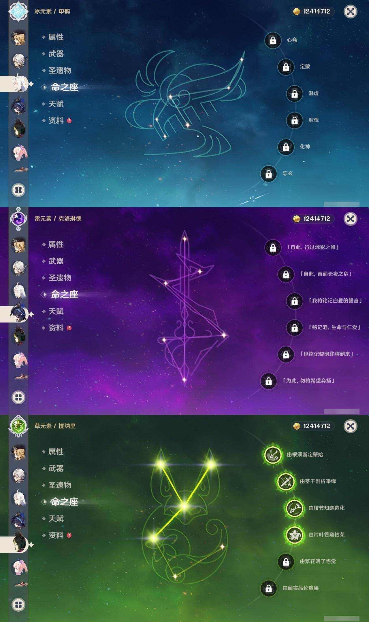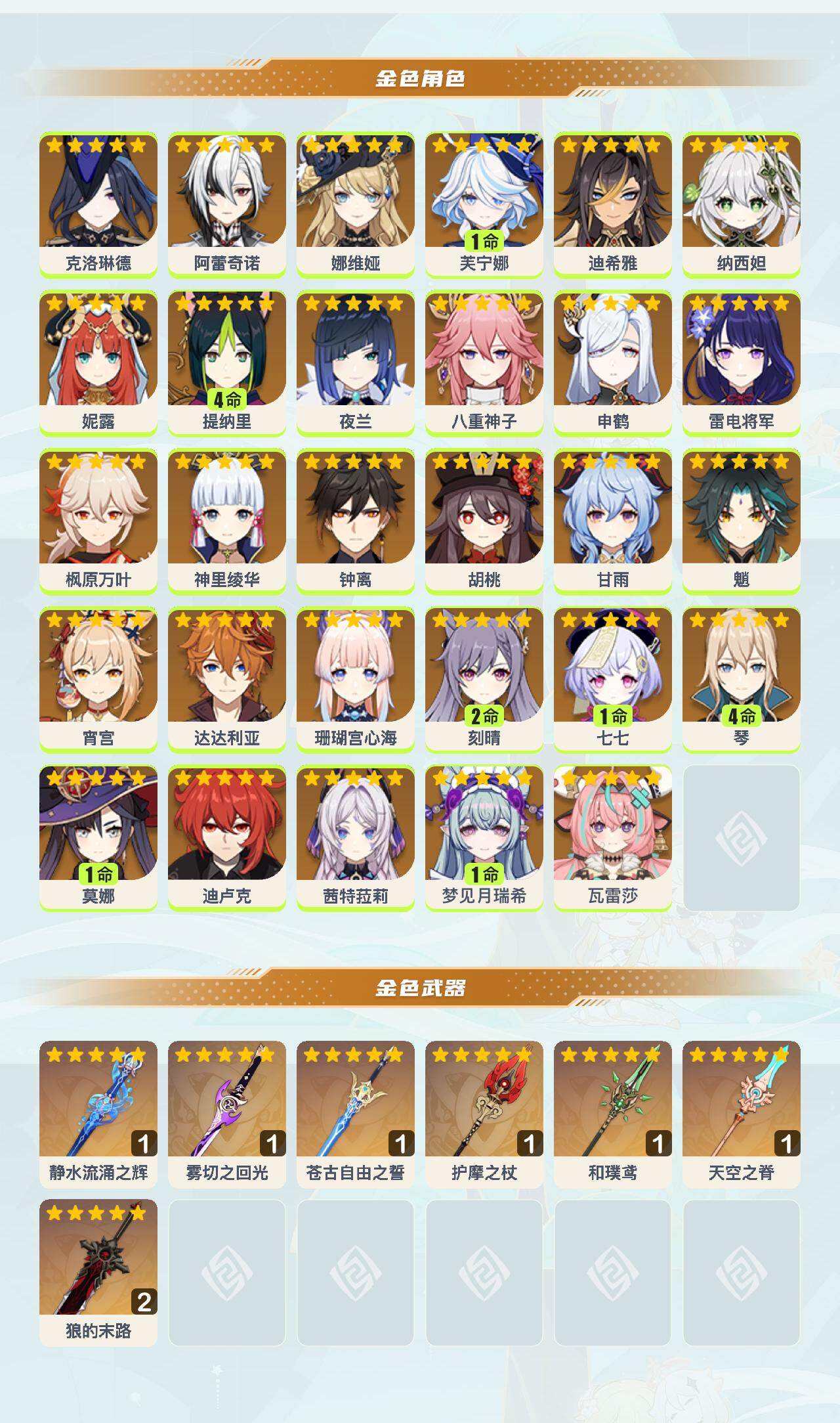 0命克洛琳德,0命阿蕾奇诺,0命娜维娅,1命芙宁娜,0命迪希雅,0命纳西妲,0命妮露,4命提纳里,0命夜兰,0命八重神子,0命申鹤,0命雷电将军,0命枫原万叶,0命神里绫华,0命钟离,0命胡桃,0命甘雨,0命魈,0命宵宫,0命达达利亚,0命珊瑚宫心海,2命刻晴,1命七七,4命琴,1命莫娜,0命迪卢克,0命茜特菈莉,1命梦见月瑞希,0命瓦雷莎,精1静水流涌之辉,精1雾切之回光,精1苍古自由之誓,精1护摩之杖,精1和璞鸢,精1天空之脊,精2狼的末路
