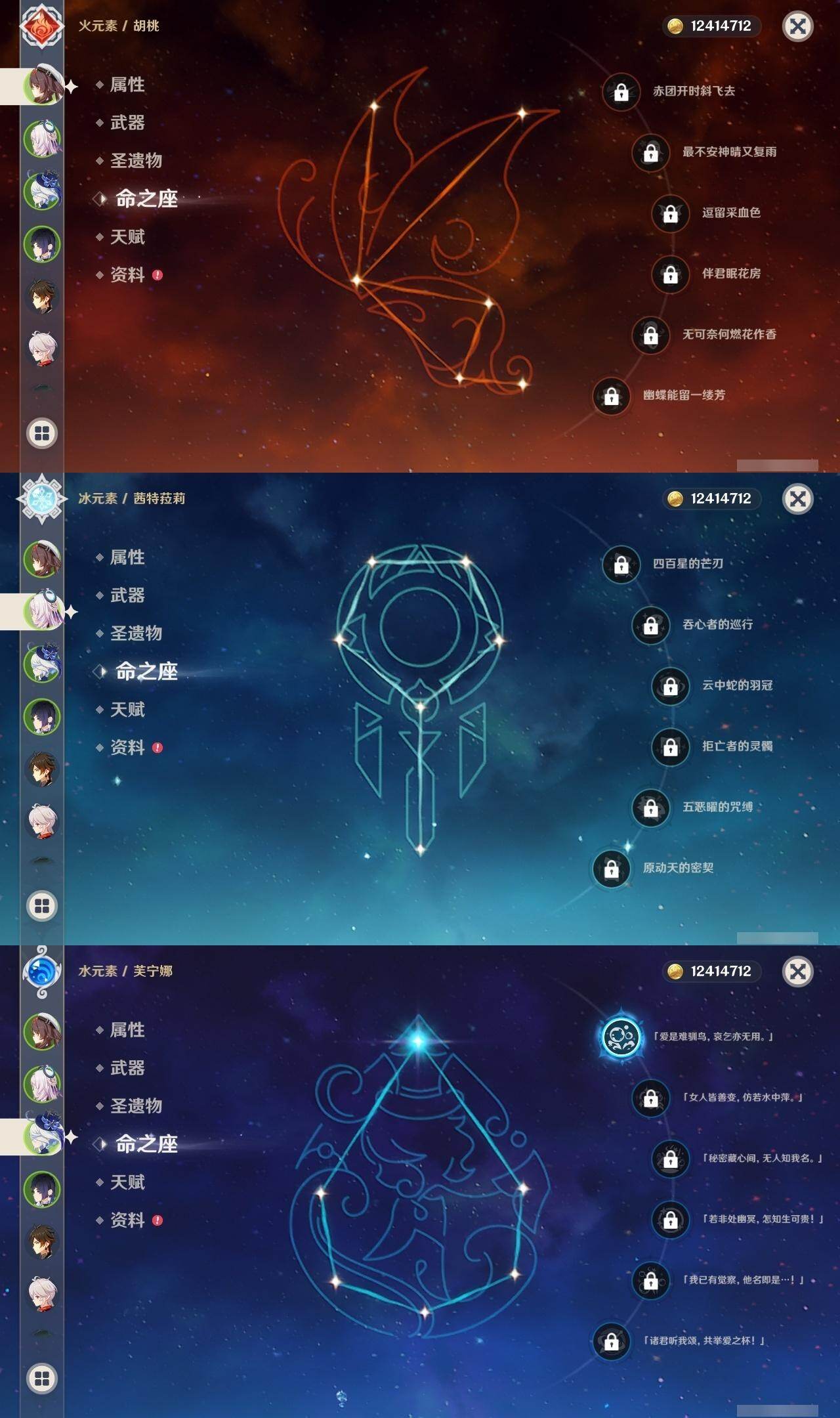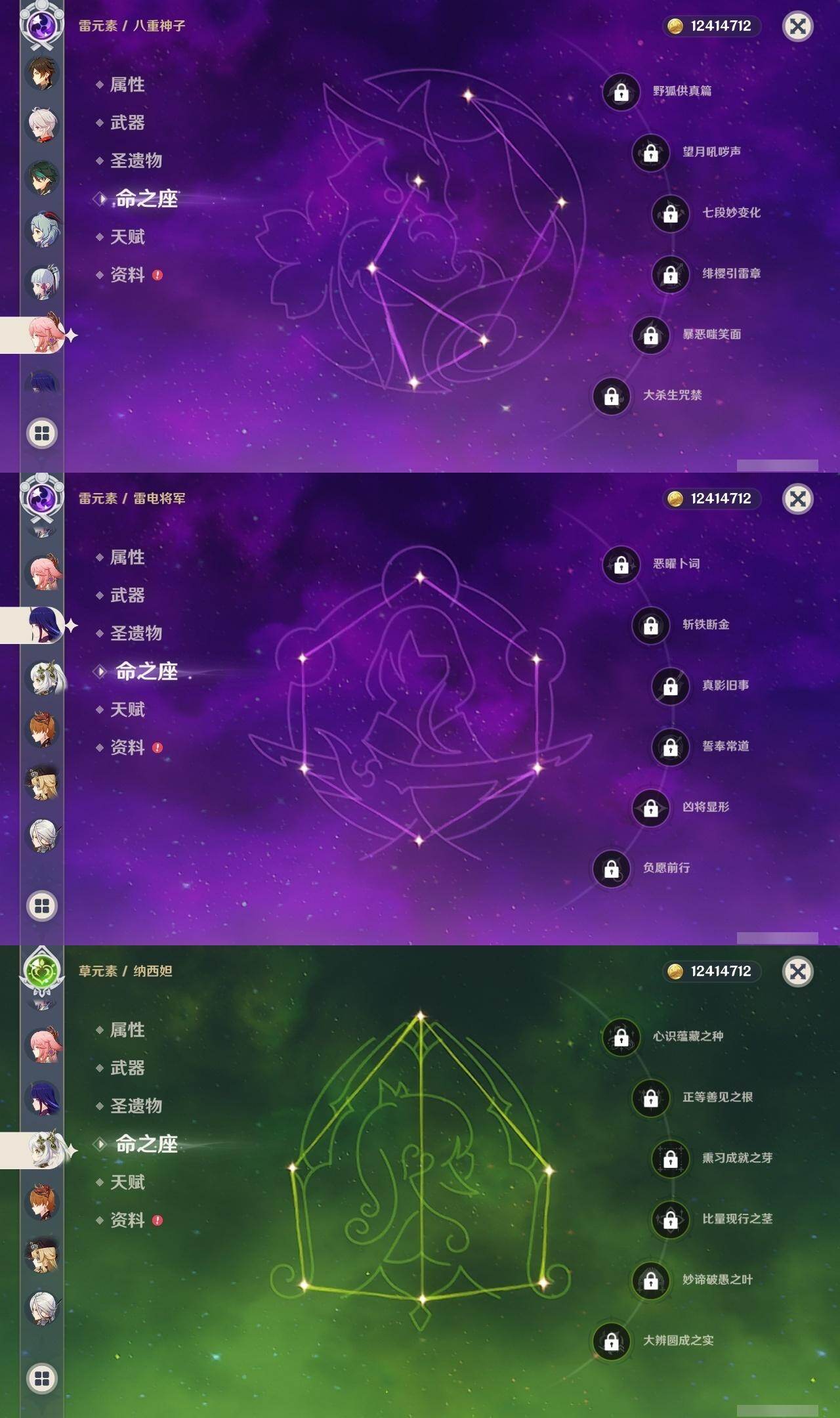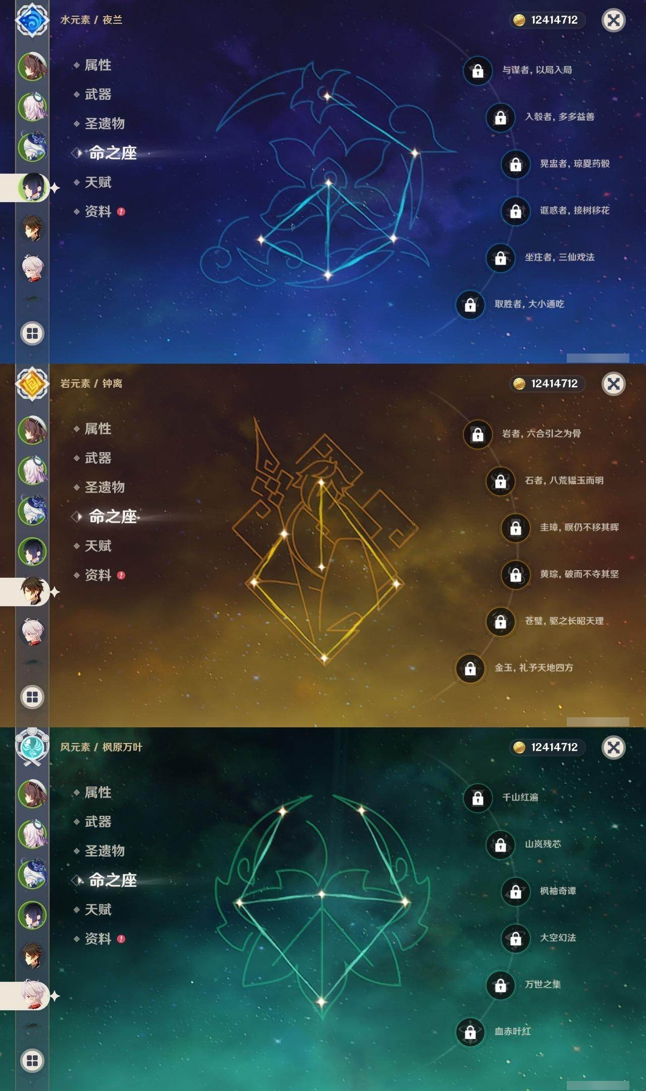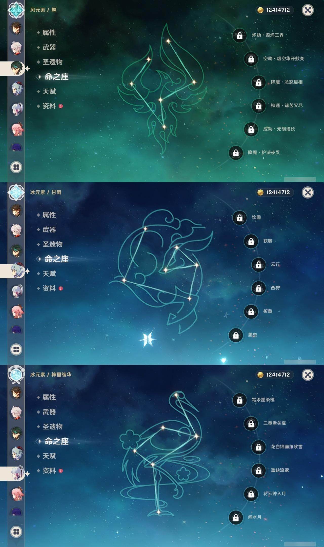0命克洛琳德,0命阿蕾奇诺,0命娜维娅,1命芙宁娜,0命迪希雅,0命纳西妲,0命妮露,4命提纳里,0命夜兰,0命八重神子,0命申鹤,0命雷电将军,0命枫原万叶,0命神里绫华,0命钟离,0命胡桃,0命甘雨,0命魈,0命宵宫,0命达达利亚,0命珊瑚宫心海,2命刻晴,1命七七,4命琴,1命莫娜,0命迪卢克,0命茜特菈莉,1命梦见月瑞希,0命瓦雷莎,精1静水流涌之辉,精1雾切之回光,精1苍古自由之誓,精1护摩之杖,精1和璞鸢,精1天空之脊,精2狼的末路