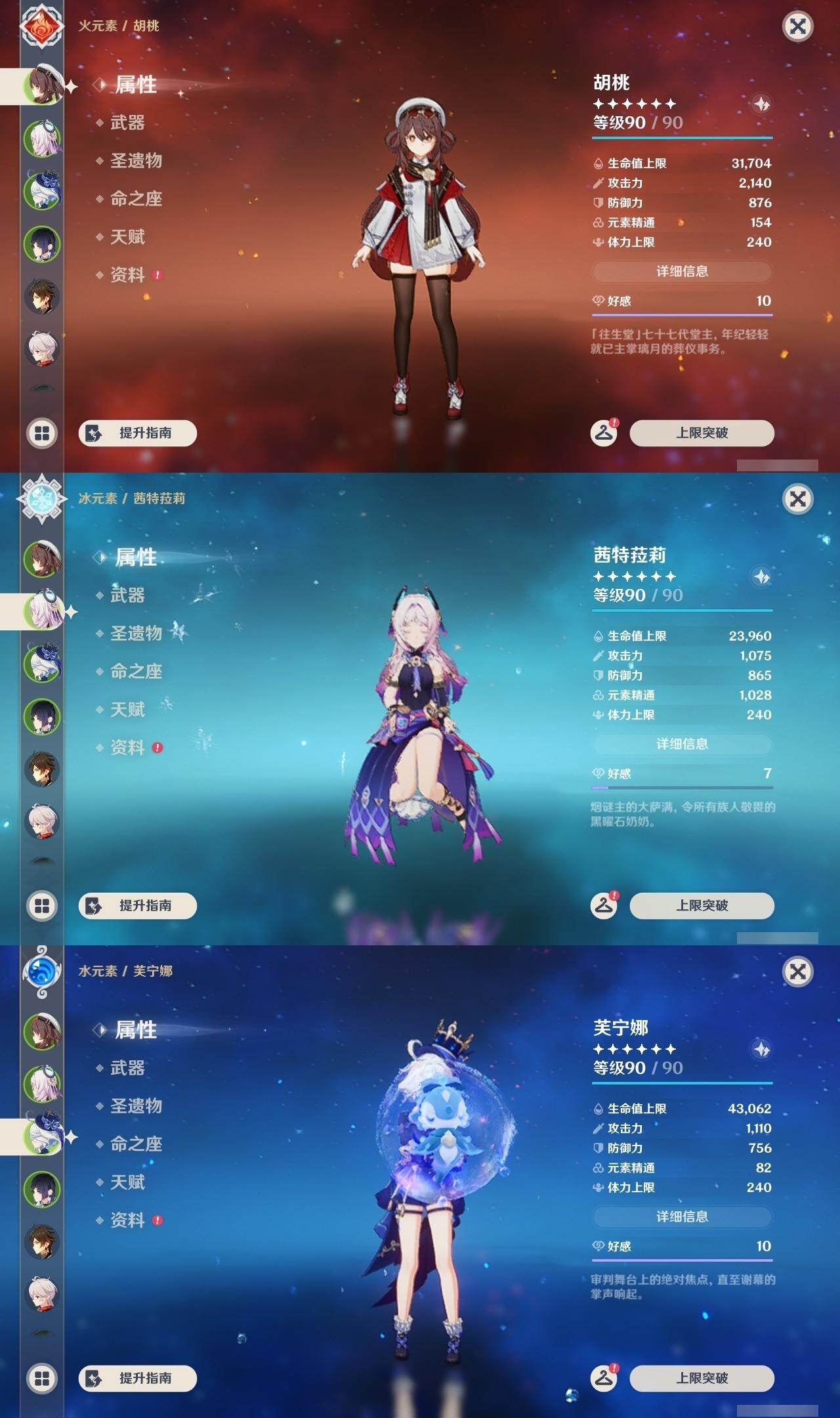 胡桃,钟离,枫原万叶,魈,甘雨,神里凌华,八重神子,雷电将军,达达利亚,申鹤,珊瑚宫心海,宵宫,迪卢克,刻晴,琴,七七,莫娜