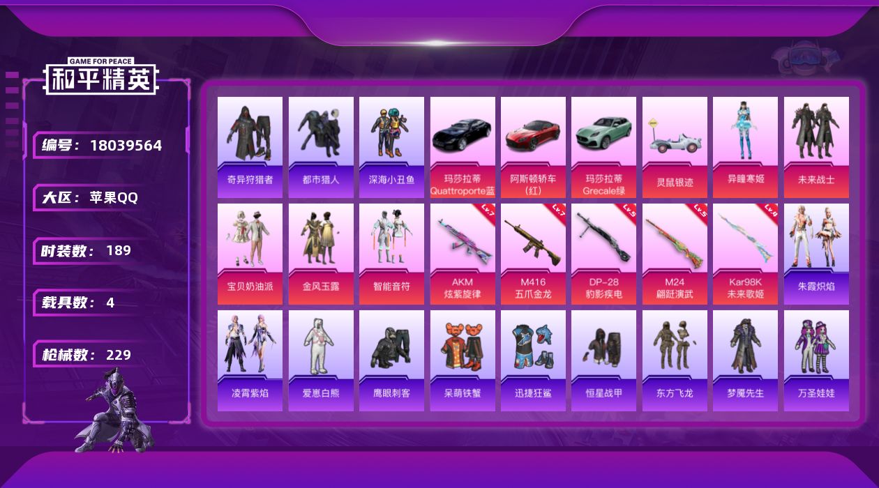 [18039564]苹果 手Q-无敌战神框-5粉装-6特效枪-4载具-1粉色飞行器-73868热力值-13王牌印记-189套装-229枪皮 【热门品类】:套装-浪漫天命,套装-都市猎人,套装-深海小丑鱼,套装-小丑鱼,套装-奇异狩猎者,套装-SS1特训,套装-暗影哥特,熔岩游骑兵连帽夹克 【粉色套装】:粉装-未来战士,粉装-宝贝奶油派,粉装-金风玉露,粉装-智能音符,角色-异瞳寒姬 【粉色枪皮等级】:AKM-炫紫旋律(七级),M416-五爪金龙(七级),Kar98K-未来歌姬(四级),M24-翩跹演武(五级),Mk14-福马献瑞(五级),DP-28-豹影疾电(五级) 【粉色载具】:阿斯顿马丁DBS(红),玛莎拉蒂Quattroporte(夜幕蓝),玛莎拉蒂Grecale(薄荷绿),灵鼠银迹,僚机-萌兔起飞 【粉色枪皮】:AKM-炫紫旋律,M416-五爪金龙,Kar98K-未来歌姬,M24-翩跹演武,Mk14-福马献瑞,DP-28-豹影疾电 【粉色飞行器】:炫紫旋律飞行器 【粉色降落伞】:未来战士降落伞,至尊龙雀降落伞,金风玉露降落伞,环太平洋降落伞,旋转彩虹降落伞,未来歌姬降落伞 【稀有套装】:套装-雪国风尚,套装-马上有钱,套装-朱霞炽焰,套装-凌霄紫焰 【稀有枪皮】:AKM-冰凉西瓜,AKM-夜灯,AKM-奇异狩猎者,AKM-彩虹符号,AKM-影袭,AKM-折纸暴龙,AKM-星之彼岸,AKM-灼热熔岩,AKM-霓虹街区,AKM-龙的传人,M16A4-幻世战舞者,M16A4-甜心亚梦,M16A4-生命誓言,M16A4-红色方程式,M16A4-蓝色火焰,SCAR-L-玉兔迎春,SCAR-L-金风玉露,SCAR-L-雷霆特警,M416-夜灯,M416-红色方程式,M416-蓝色火焰,GROZA-影袭,GROZA-春暖花开,GROZA-田园牧歌,GROZA-雷霆特警,GROZA-黑色刀锋,AUG-凝视深渊,AUG-耀粉歌者,QBZ-妙趣可丽,QBZ-未来歌姬,QBZ-神秘黑猫,QBZ-诡娃娃,M762-奇异狩猎者,M762-折纸暴龙,M762-拳皇97,M762-暗夜鎏金,M762-牛气冲天,M762-生命誓言,M762-第五大道,M762-诡娃娃,Mk47-妙红点点,Mk47-洛神天依,G36C-不夜海上花,G36C-暗夜玫瑰,G36C-炙焰牛王,G36C-荒野猎神,G36C-金风玉露