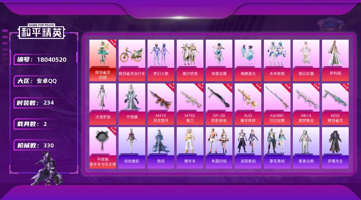 [18040520]无敌战神框1 【特价出售/店主推荐】安卓 手Q-无敌战神框-1神装-10粉装-10特效枪-2载具-5粉色飞行器-107081热力值-12王牌印记-234套装-330枪皮【红色神装等级】:辉羽雀灵-初翊(三级)【热门品类】:粉装-梦幻火箭【粉色套装】:粉装-梦幻火箭,粉装-潮汐统领,粉装-俏雪含霜,粉装-海螺星光,粉装-未来歌姬,角色-烟云彩露,角色-萨利娅,角色-冷漠罗丽,角色-宁雨蝶,角色-深渊主宰【粉色枪皮等级】:M416-风花雪月(七级),AUG-暖羊咩咩(五级),M762-鬼刀(七级),ACE32-萌骑漫游(四级),Kar98K-巳巳如意(五级),Mk14-甜梦熊击(五级),Mk14-福马献瑞(二级),DP-28-豹影疾电(五级),MG3-辉羽雀灵(三级),平底锅-喜羊羊与灰太狼(二级)【粉色载具】:旅行汪汪(海风蓝),辉羽雀灵自行车【粉色枪皮】:M416-风花雪月,AUG-暖羊咩咩,M762-鬼刀,ACE32-萌骑漫游,Kar98K-巳巳如意,Mk14-甜梦熊击,Mk14-福马献瑞,DP-28-豹影疾电,MG3-辉羽雀灵,平底锅-喜羊羊与灰太狼【粉色飞行器】:炫彩糖果飞行器,炫紫旋律飞行器,风花雪月飞行器,雀灵庇佑飞行器,冰狼掠影飞行器