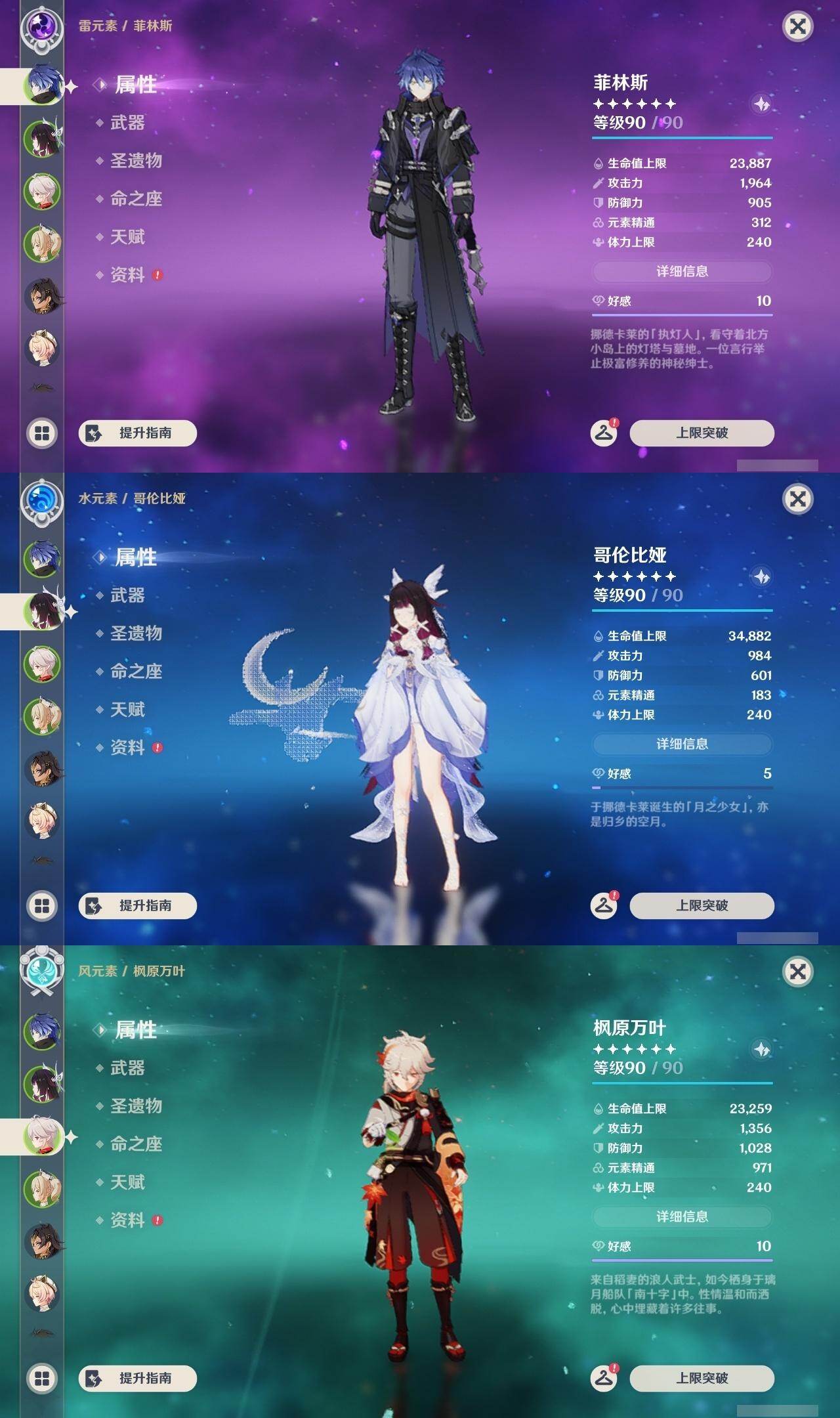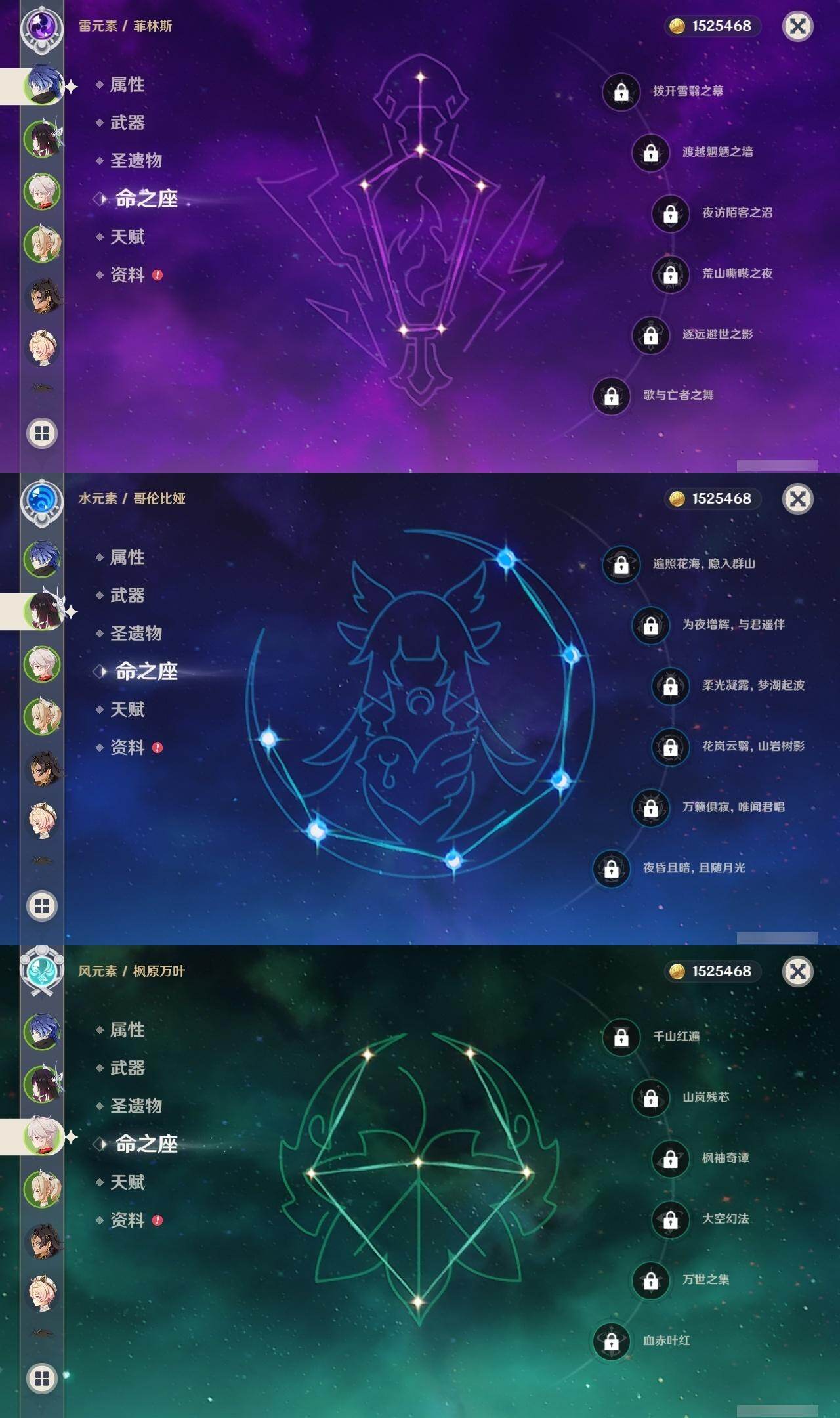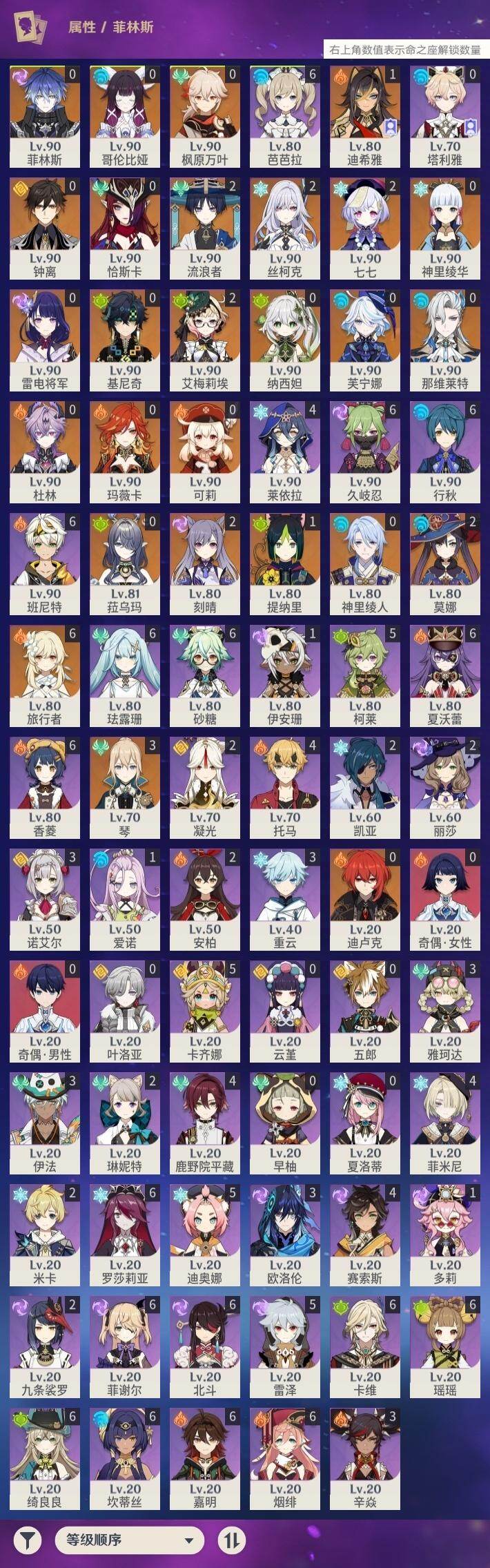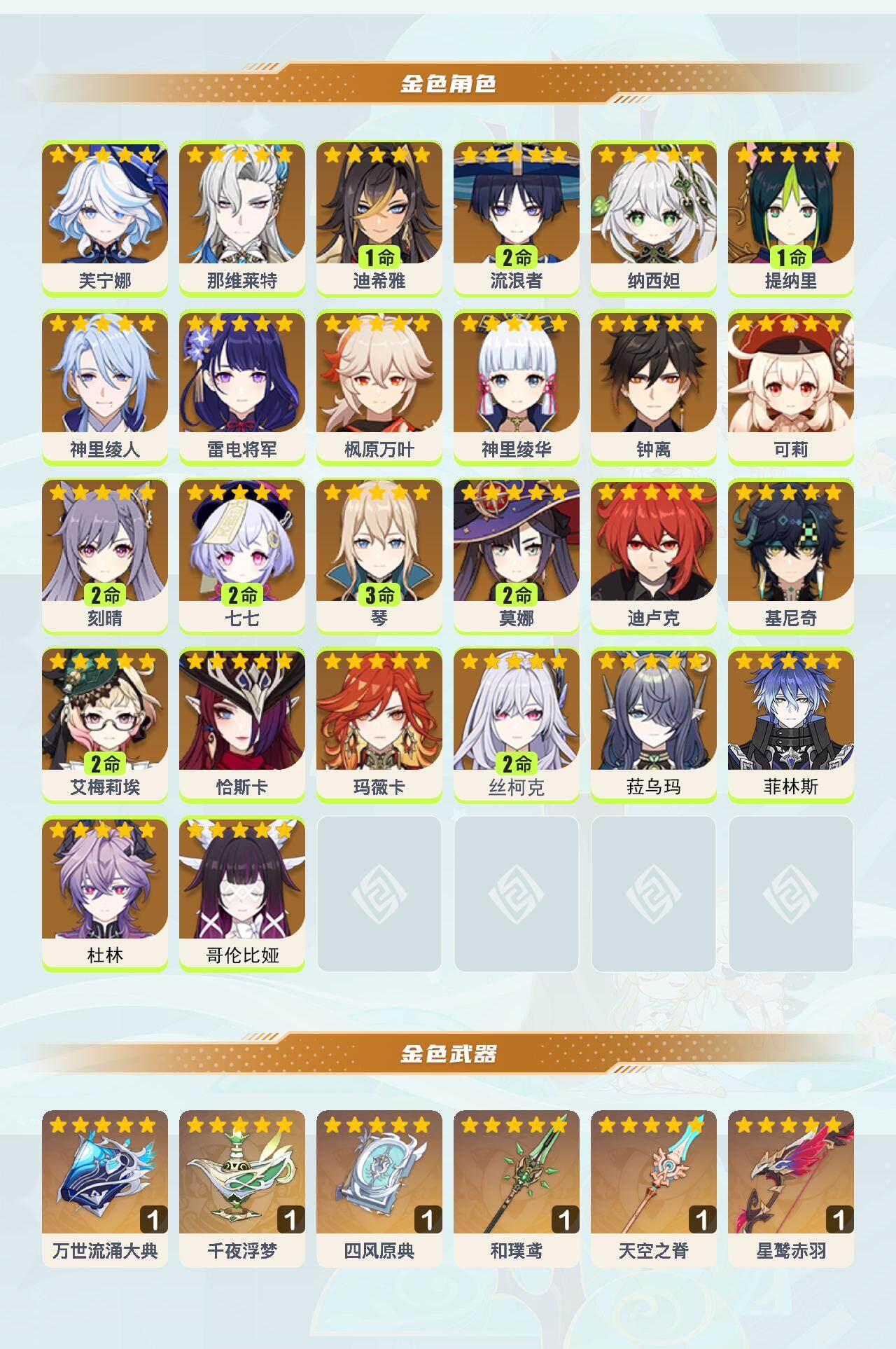 0命芙宁娜,0命那维莱特,1命迪希雅,2命流浪者,0命纳西妲,1命提纳里,0命神里绫人,0命雷电将军,0命枫原万叶,0命神里绫华,0命钟离,0命可莉,2命刻晴,2命七七,3命琴,2命莫娜,0命迪卢克,0命基尼奇,2命艾梅莉埃,0命恰斯卡,0命玛薇卡,2命丝柯克,0命菈乌玛,0命菲林斯,0命杜林,0命哥伦比娅,精1万世流涌大典,精1千夜浮梦,精1四风原典,精1和璞鸢,精1天空之脊,精1星鹫赤羽