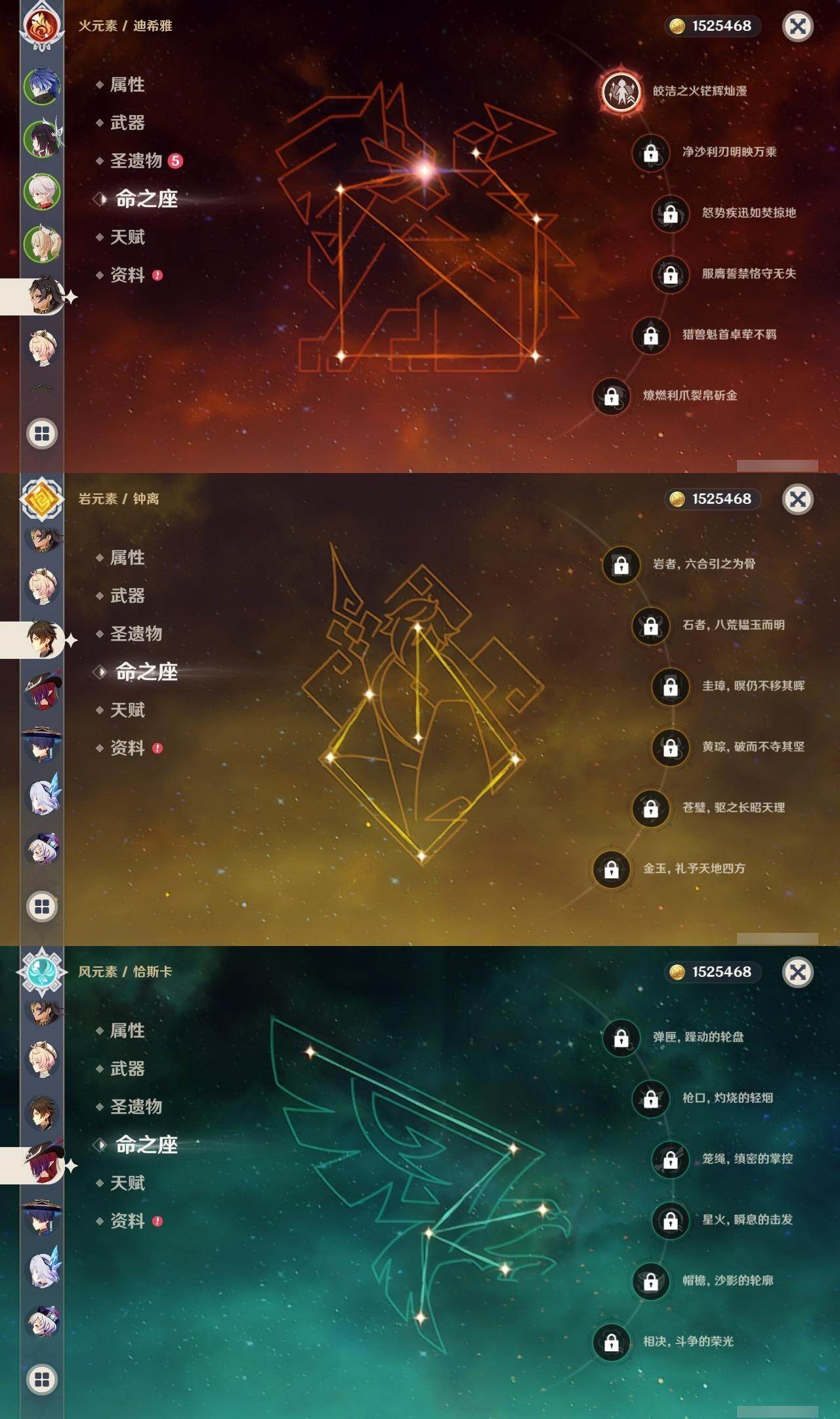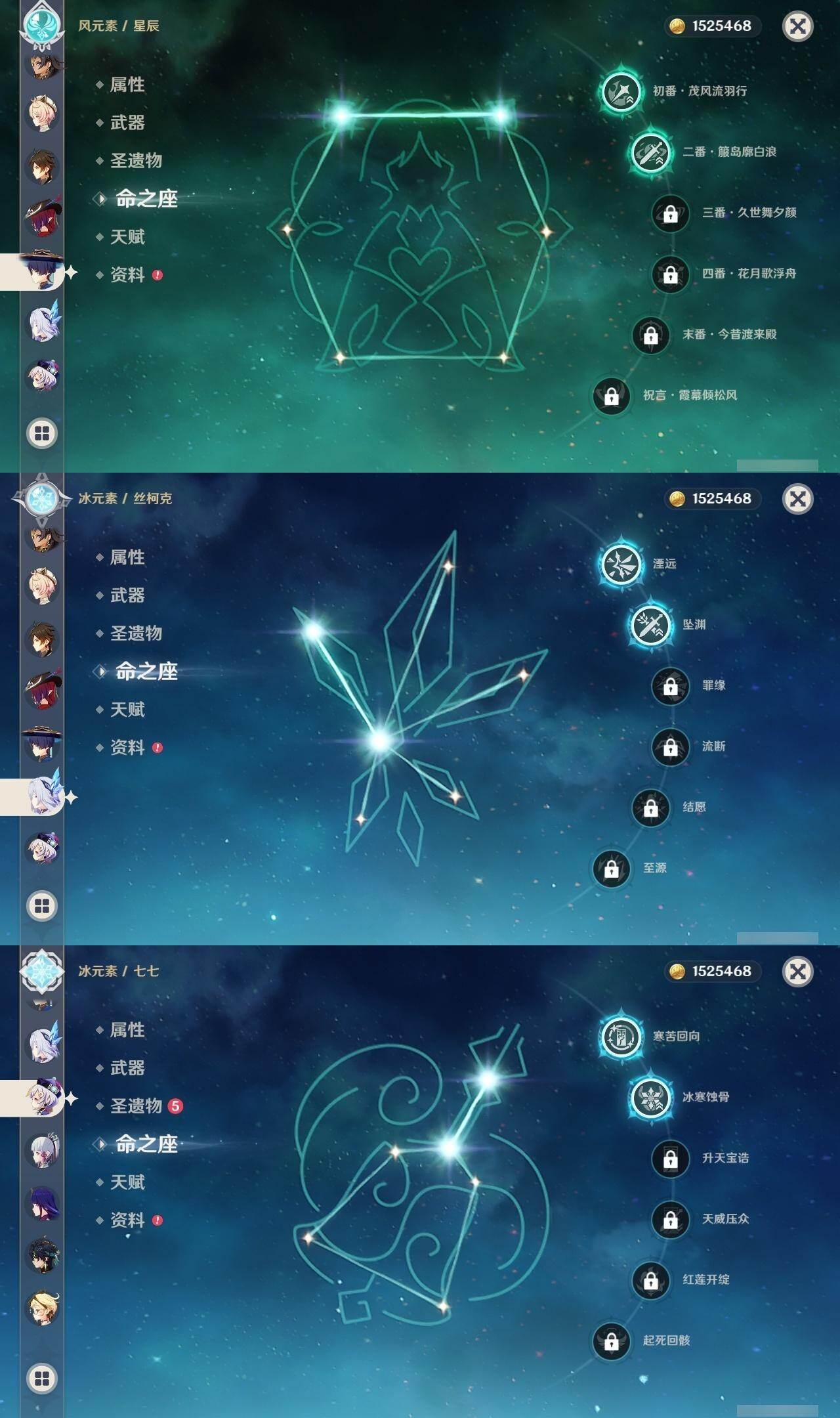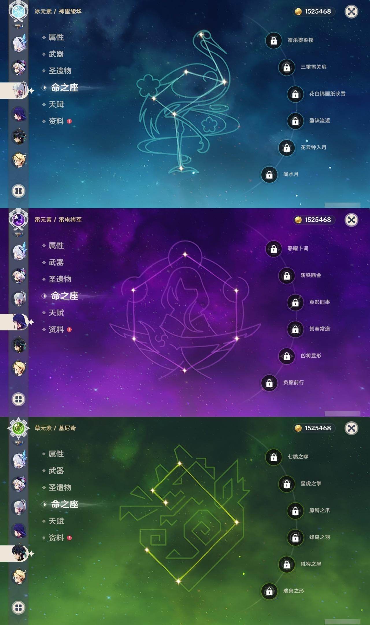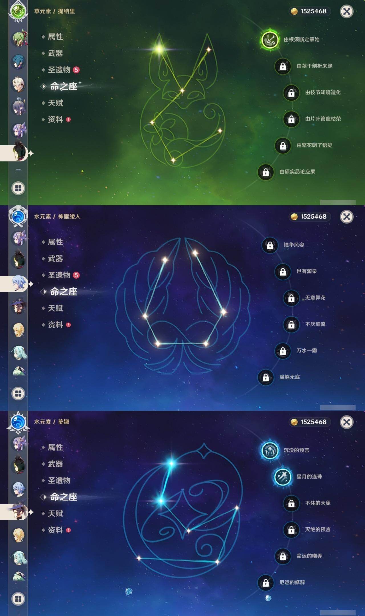 0命芙宁娜,0命那维莱特,1命迪希雅,2命流浪者,0命纳西妲,1命提纳里,0命神里绫人,0命雷电将军,0命枫原万叶,0命神里绫华,0命钟离,0命可莉,2命刻晴,2命七七,3命琴,2命莫娜,0命迪卢克,0命基尼奇,2命艾梅莉埃,0命恰斯卡,0命玛薇卡,2命丝柯克,0命菈乌玛,0命菲林斯,0命杜林,0命哥伦比娅,精1万世流涌大典,精1千夜浮梦,精1四风原典,精1和璞鸢,精1天空之脊,精1星鹫赤羽