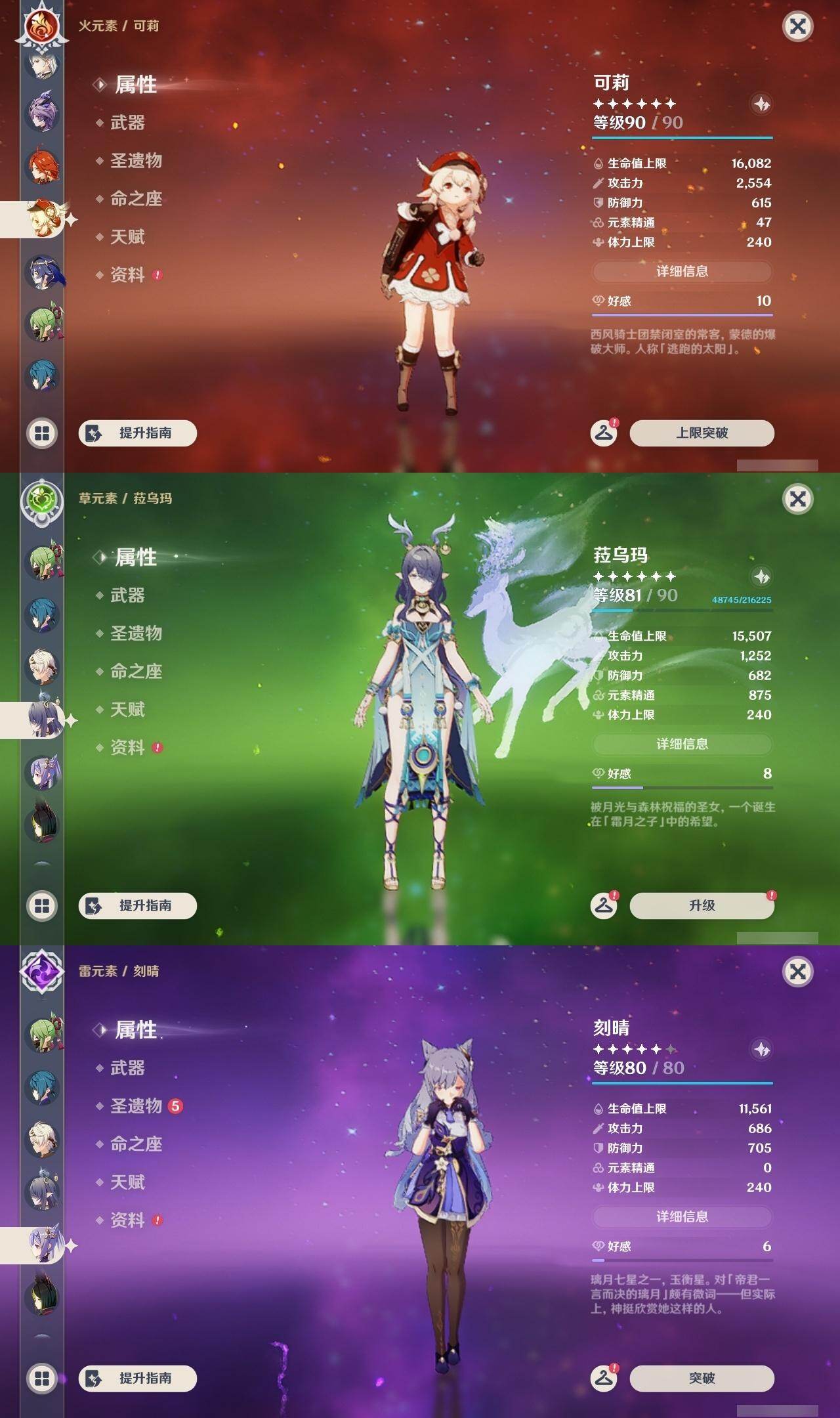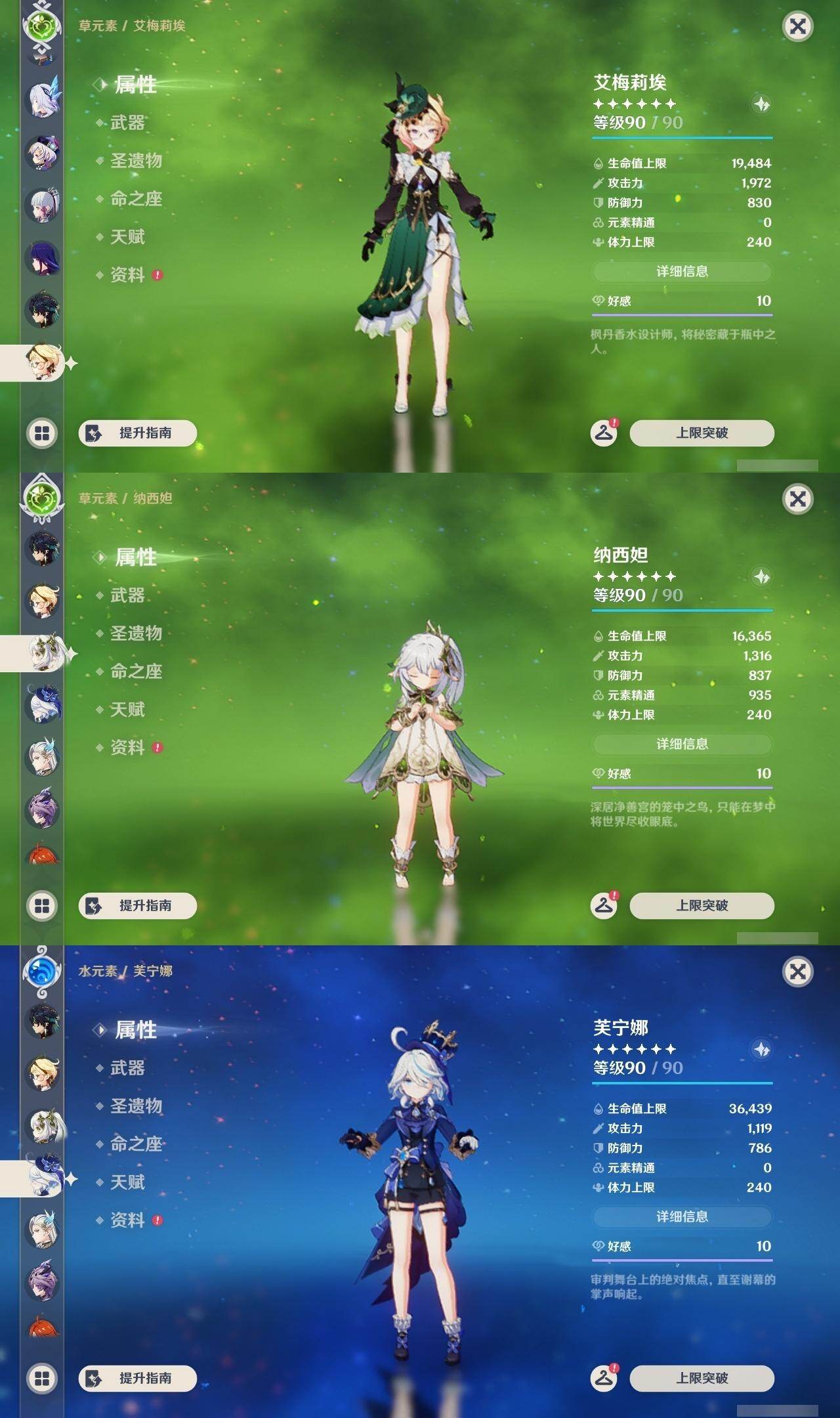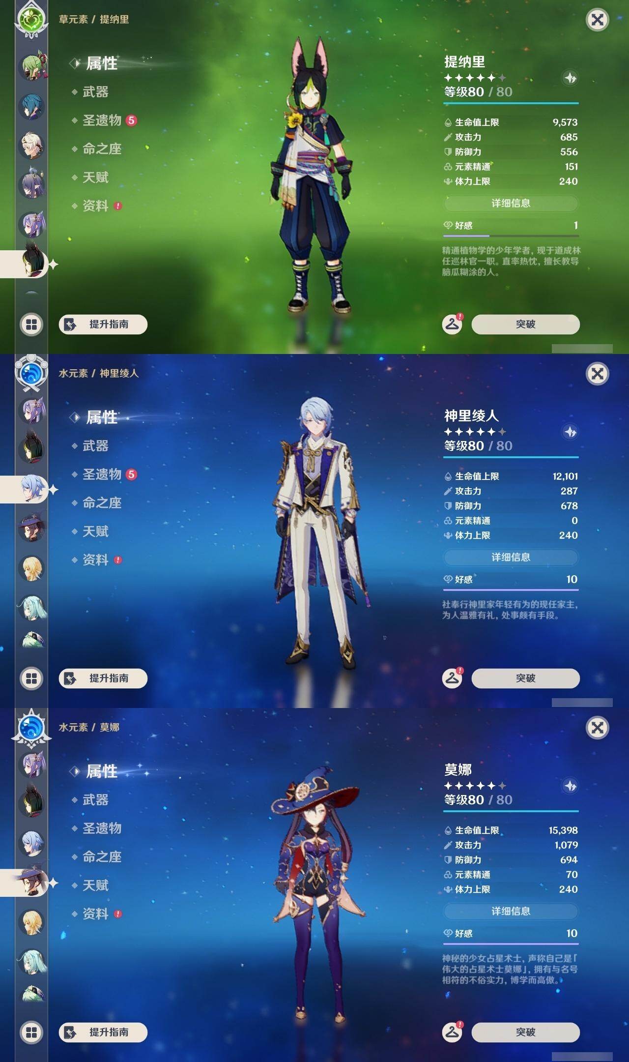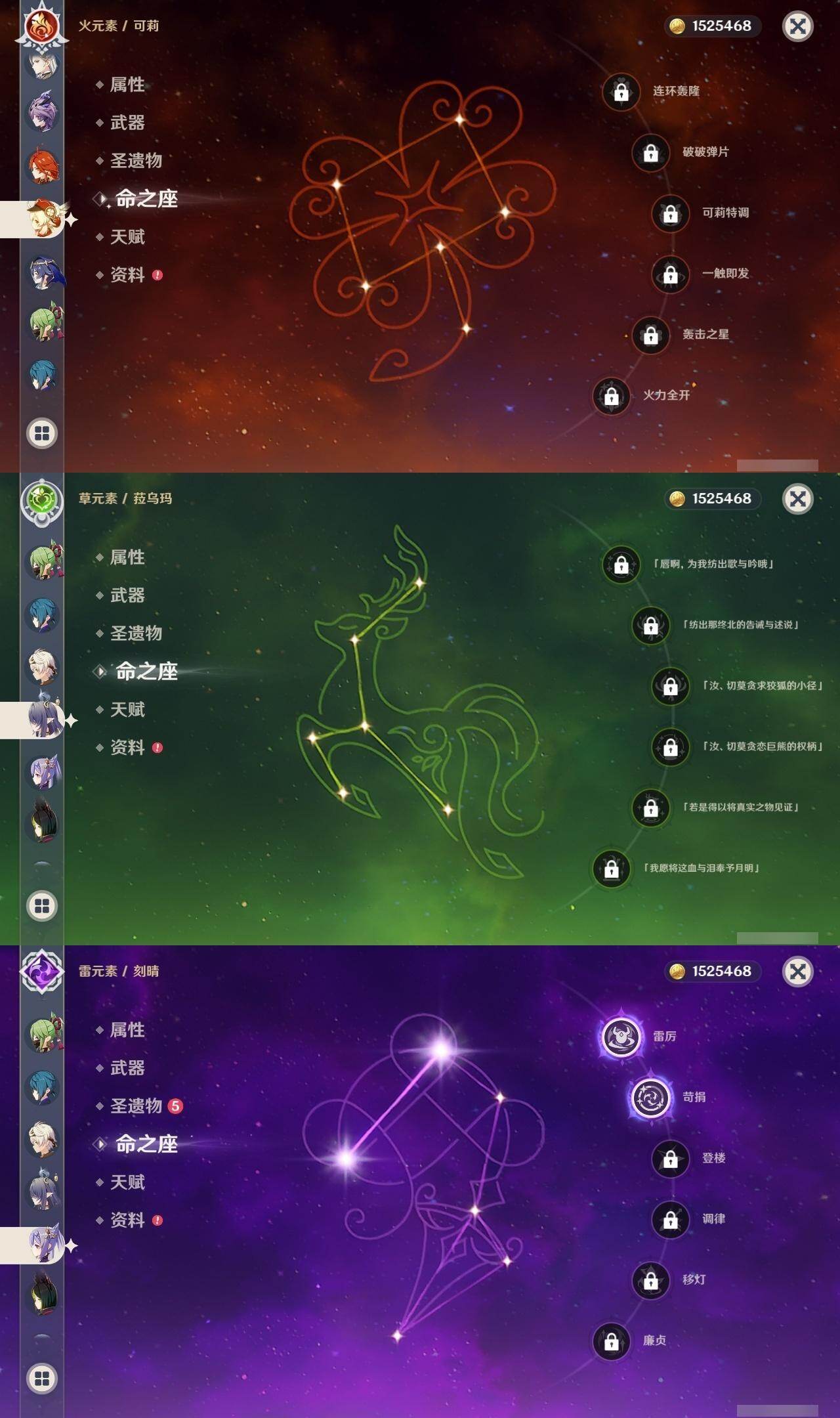 0命芙宁娜,0命那维莱特,1命迪希雅,2命流浪者,0命纳西妲,1命提纳里,0命神里绫人,0命雷电将军,0命枫原万叶,0命神里绫华,0命钟离,0命可莉,2命刻晴,2命七七,3命琴,2命莫娜,0命迪卢克,0命基尼奇,2命艾梅莉埃,0命恰斯卡,0命玛薇卡,2命丝柯克,0命菈乌玛,0命菲林斯,0命杜林,0命哥伦比娅,精1万世流涌大典,精1千夜浮梦,精1四风原典,精1和璞鸢,精1天空之脊,精1星鹫赤羽