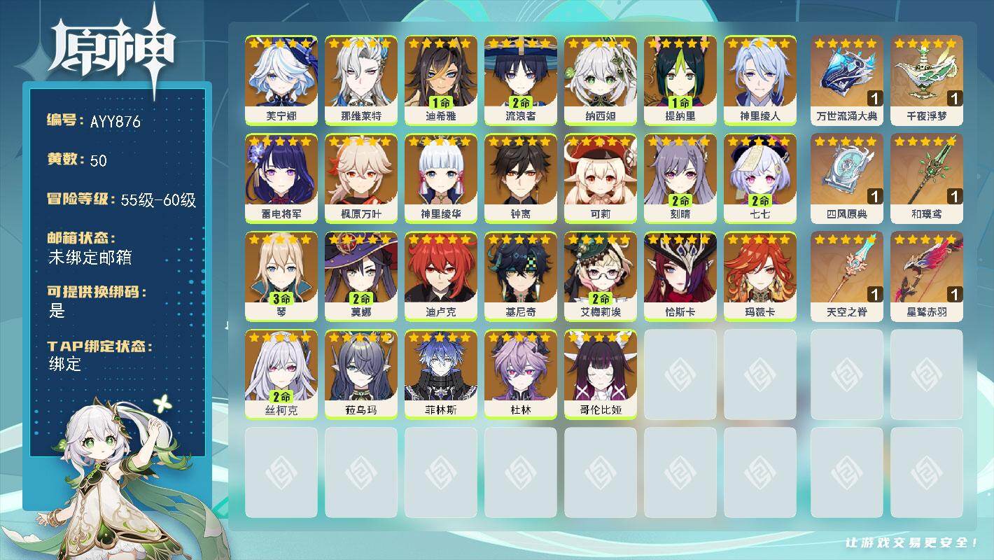 [18040573]60级/50黄/女主/26个五星角色/7个五星武器 0命芙宁娜,0命那维莱特,1命迪希雅,2命流浪者,0命纳西妲,1命提纳里,0命神里绫人,0命雷电将军,0命枫原万叶,0命神里绫华,0命钟离,0命可莉,2命刻晴,2命七七,3命琴,2命莫娜,0命迪卢克,0命基尼奇,2命艾梅莉埃,0命恰斯卡,0命玛薇卡,2命丝柯克,0命菈乌玛,0命菲林斯,0命杜林,0命哥伦比娅,精1万世流涌大典,精1千夜浮梦,精1四风原典,精1和璞鸢,精1天空之脊,精1星鹫赤羽