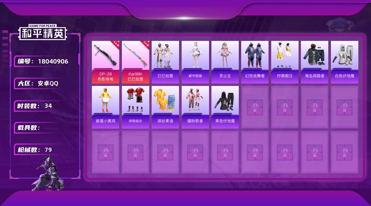 [18040906]安卓 手Q-0粉装-3特效枪-0载具-1粉色飞行器-18172热力值-0王牌印记-34套装-79枪皮