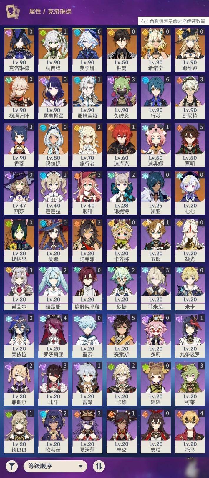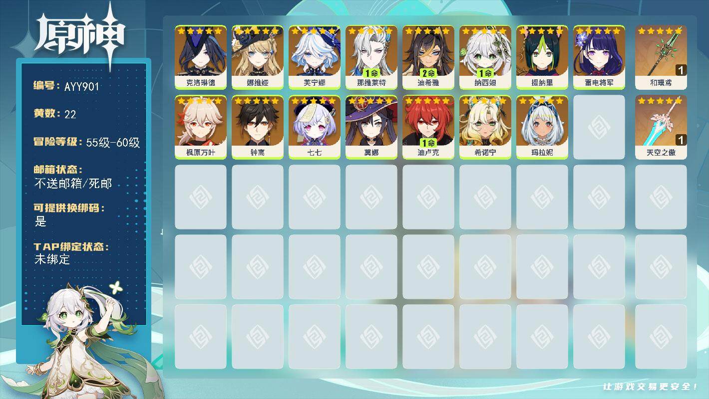 [18040975]【店主推荐捡漏号】57级/22黄/女主/15个五星角色/2个五星武器 0命克洛琳德,0命娜维娅,0命芙宁娜,1命那维莱特,2命迪希雅,1命纳西妲,0命提纳里,0命雷电将军,0命枫原万叶,0命钟离,0命七七,0命莫娜,1命迪卢克,0命希诺宁,0命玛拉妮,精1和璞鸢,精1天空之傲