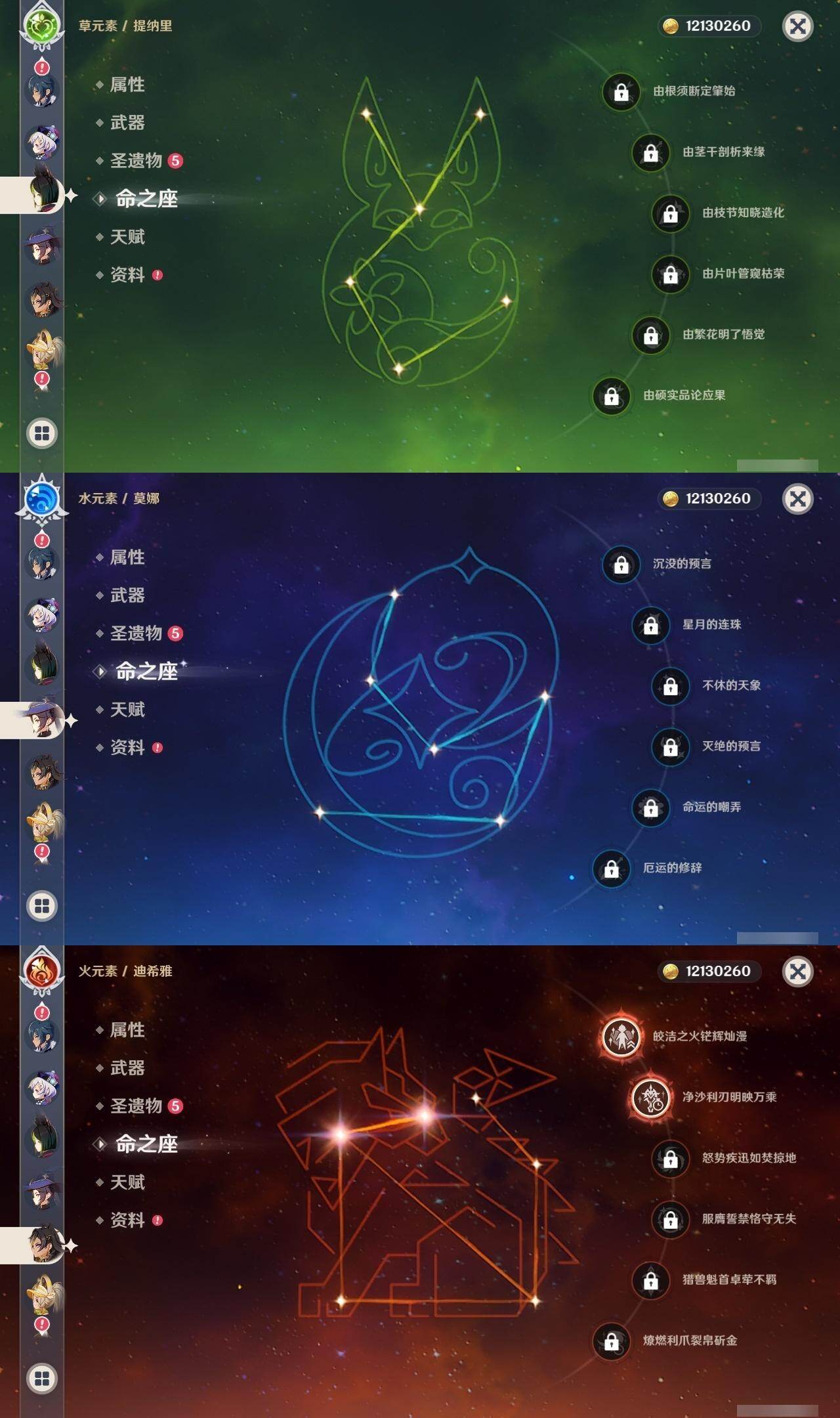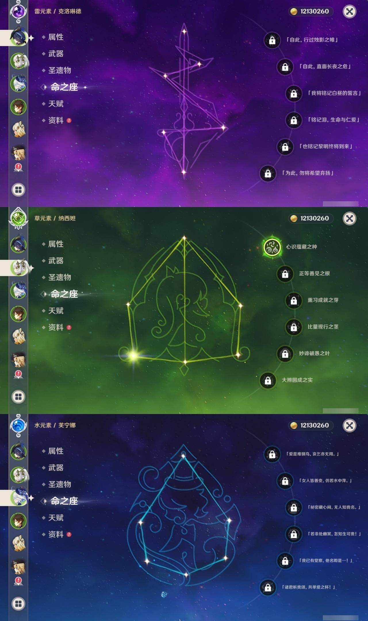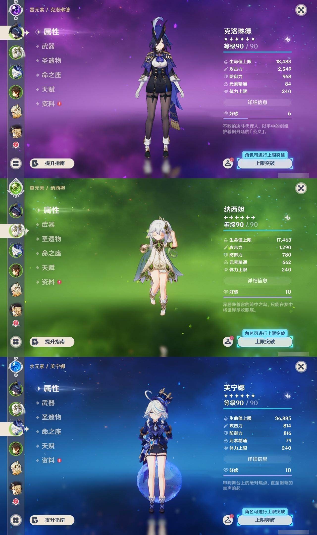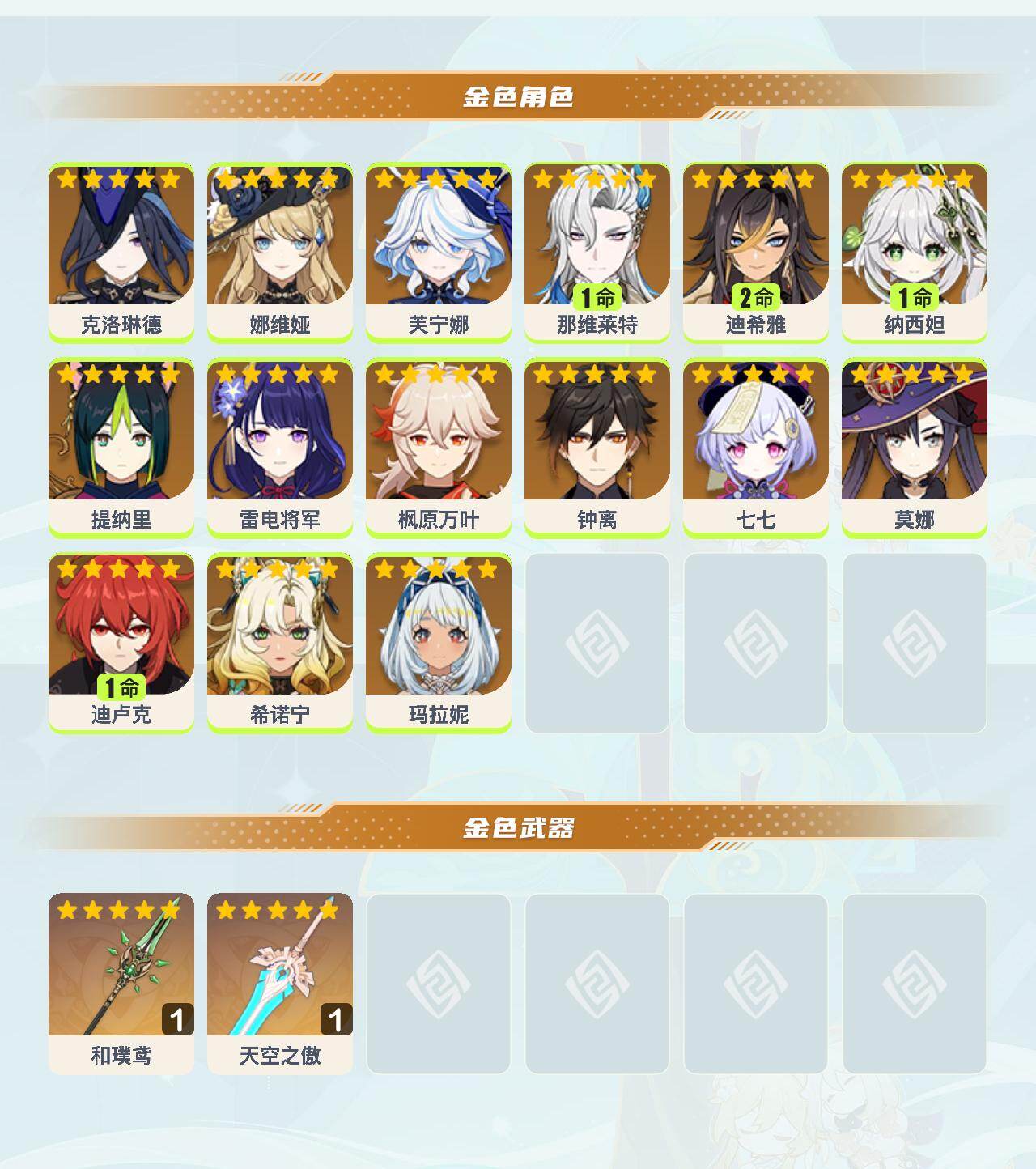 0命克洛琳德,0命娜维娅,0命芙宁娜,1命那维莱特,2命迪希雅,1命纳西妲,0命提纳里,0命雷电将军,0命枫原万叶,0命钟离,0命七七,0命莫娜,1命迪卢克,0命希诺宁,0命玛拉妮,精1和璞鸢,精1天空之傲