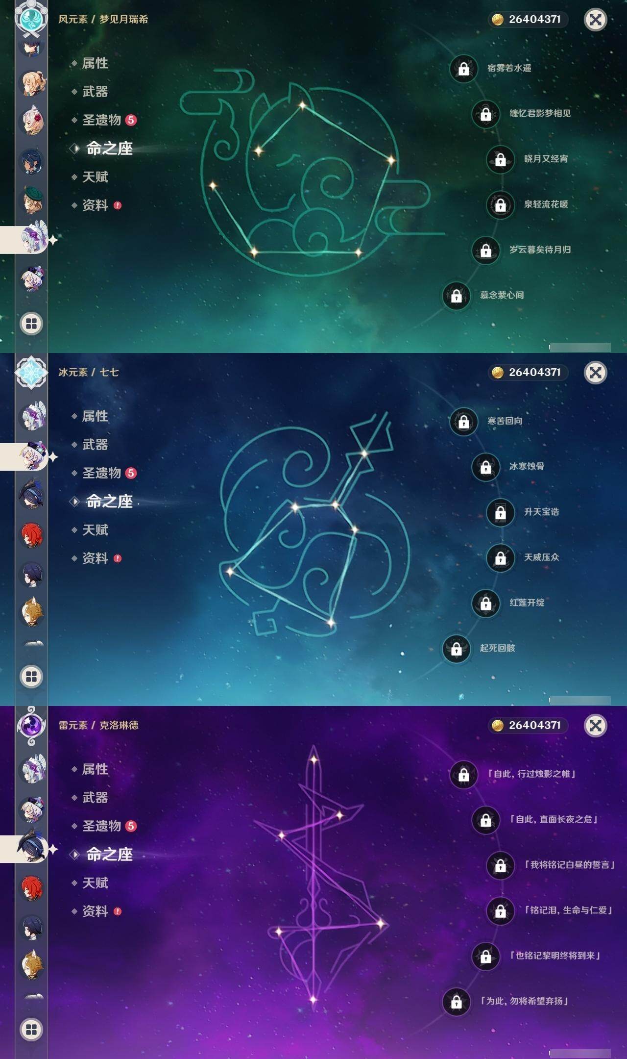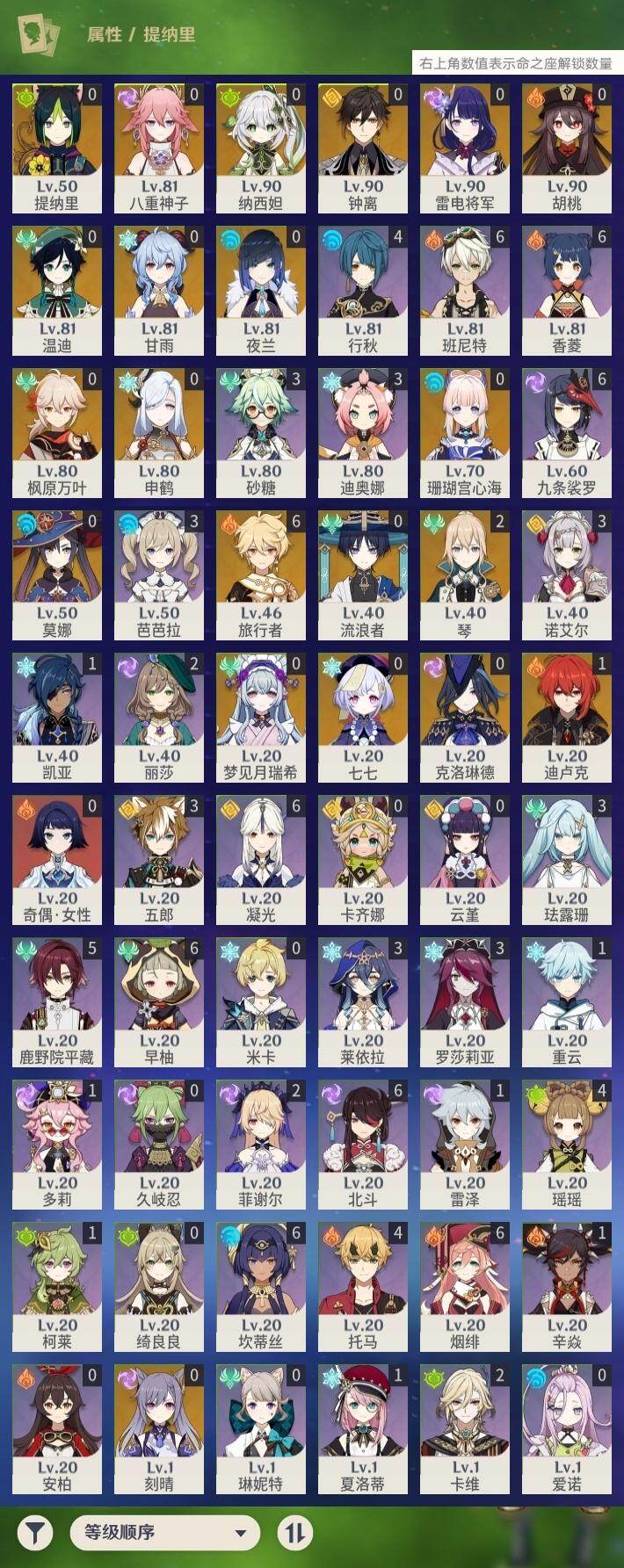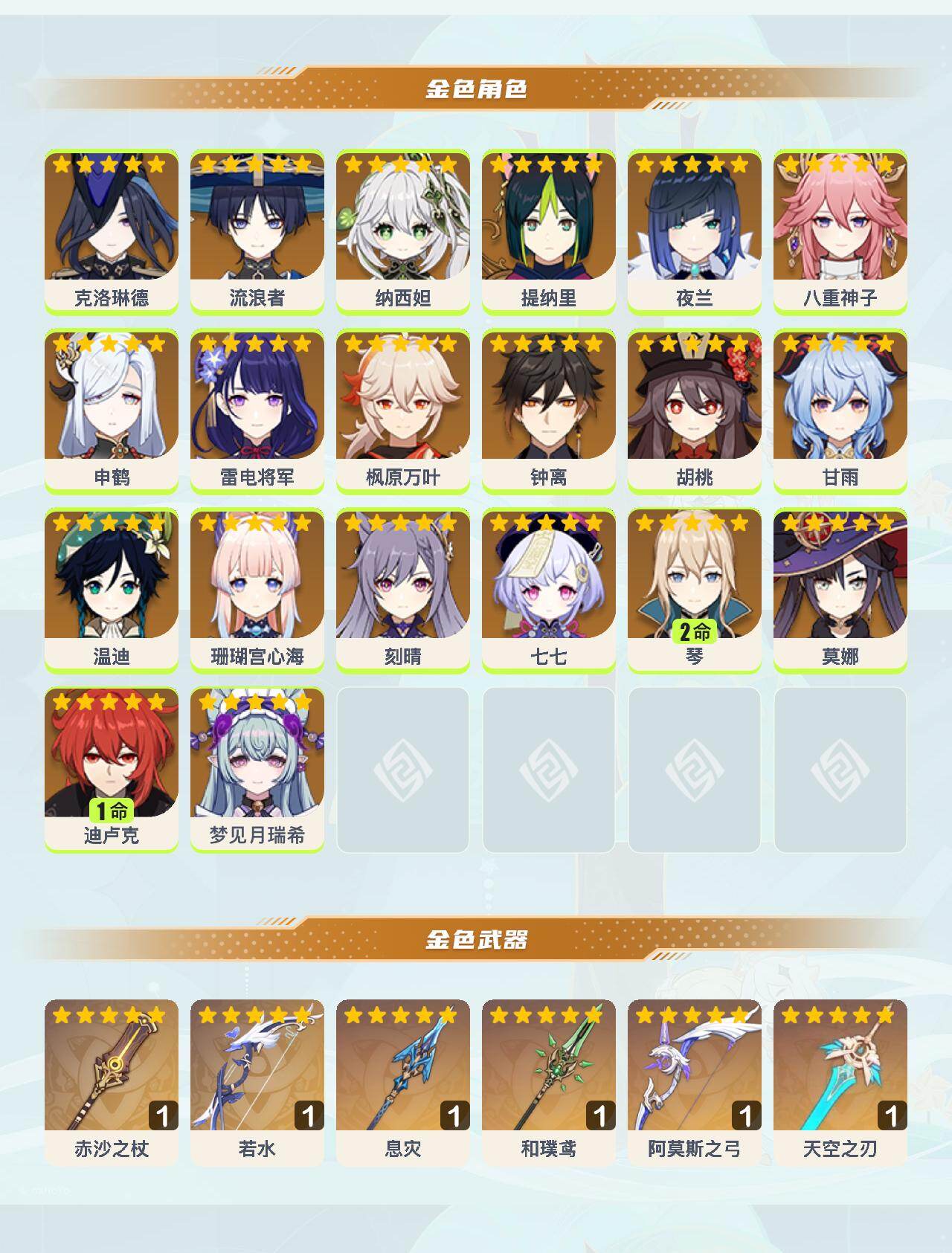 0命克洛琳德,0命流浪者,0命纳西妲,0命提纳里,0命夜兰,0命八重神子,0命申鹤,0命雷电将军,0命枫原万叶,0命钟离,0命胡桃,0命甘雨,0命温迪,0命珊瑚宫心海,0命刻晴,0命七七,2命琴,0命莫娜,1命迪卢克,0命梦见月瑞希,精1赤沙之杖,精1若水,精1息灾,精1和璞鸢,精1阿莫斯之弓,精1天空之刃