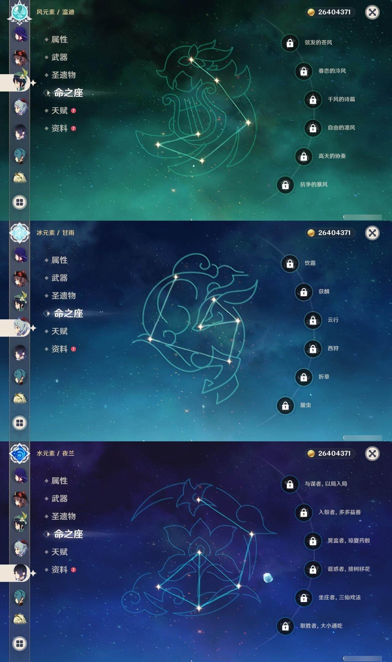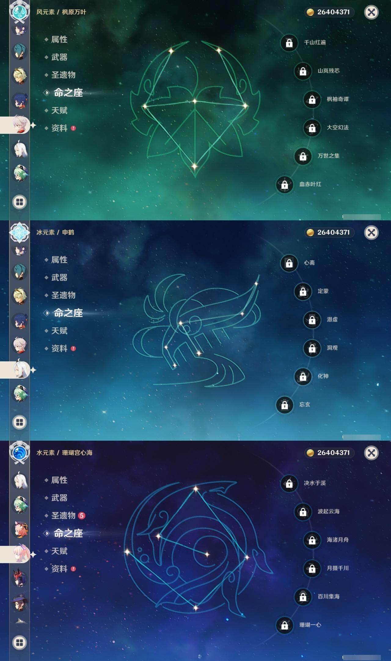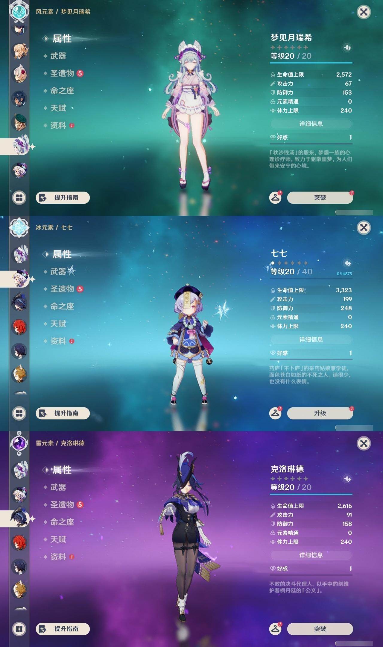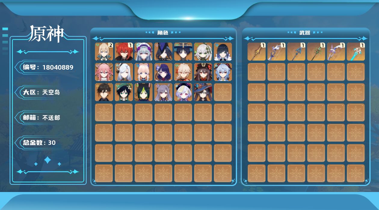 0命克洛琳德,0命流浪者,0命纳西妲,0命提纳里,0命夜兰,0命八重神子,0命申鹤,0命雷电将军,0命枫原万叶,0命钟离,0命胡桃,0命甘雨,0命温迪,0命珊瑚宫心海,0命刻晴,0命七七,2命琴,0命莫娜,1命迪卢克,0命梦见月瑞希,精1赤沙之杖,精1若水,精1息灾,精1和璞鸢,精1阿莫斯之弓,精1天空之刃