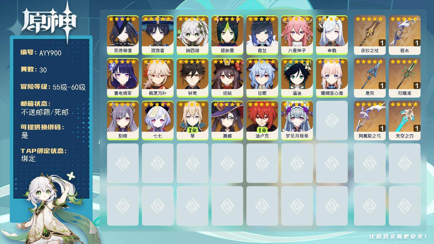 [18040889]58级/30黄/男主/20个五星角色/7个五星武器 0命克洛琳德,0命流浪者,0命纳西妲,0命提纳里,0命夜兰,0命八重神子,0命申鹤,0命雷电将军,0命枫原万叶,0命钟离,0命胡桃,0命甘雨,0命温迪,0命珊瑚宫心海,0命刻晴,0命七七,2命琴,0命莫娜,1命迪卢克,0命梦见月瑞希,精1赤沙之杖,精1若水,精1息灾,精1和璞鸢,精1阿莫斯之弓,精1天空之刃