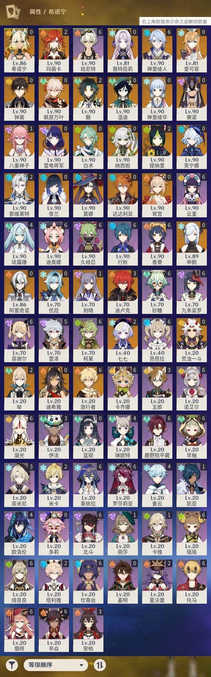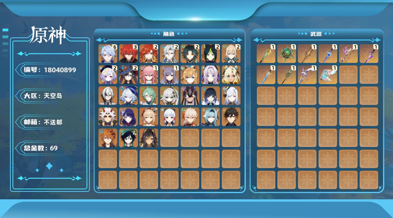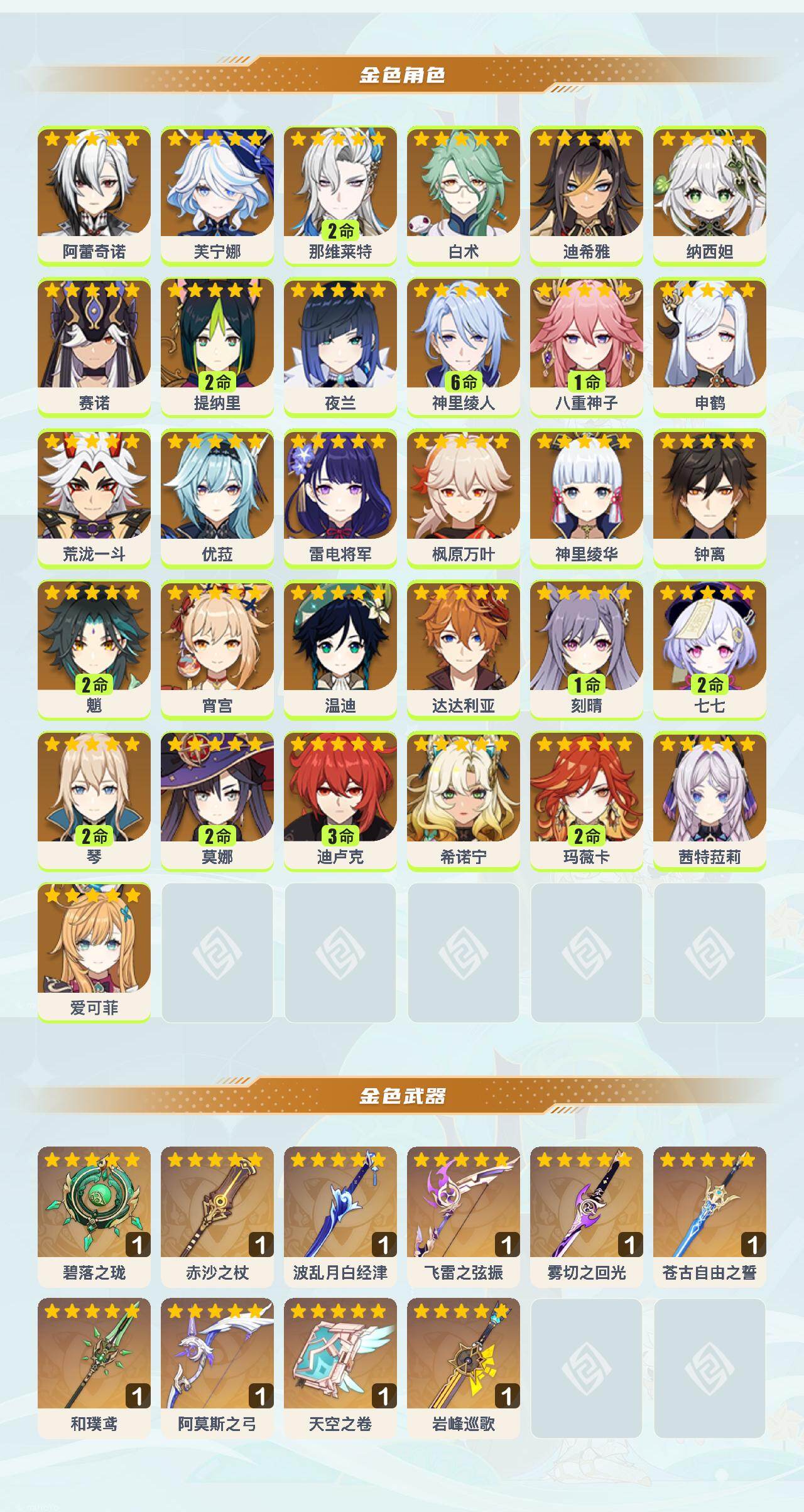 0命阿蕾奇诺,0命芙宁娜,2命那维莱特,0命白术,0命迪希雅,0命纳西妲,0命赛诺,2命提纳里,0命夜兰,满命神里绫人,1命八重神子,0命申鹤,0命荒泷一斗,0命优菈,0命雷电将军,0命枫原万叶,0命神里绫华,0命钟离,2命魈,0命宵宫,0命温迪,0命达达利亚,1命刻晴,2命七七,2命琴,2命莫娜,3命迪卢克,0命希诺宁,2命玛薇卡,0命茜特菈莉,0命爱可菲,精1碧落之珑,精1赤沙之杖,精1波乱月白经津,精1飞雷之弦振,精1雾切之回光,精1苍古自由之誓,精1和璞鸢,精1阿莫斯之弓,精1天空之卷,精1岩峰巡歌