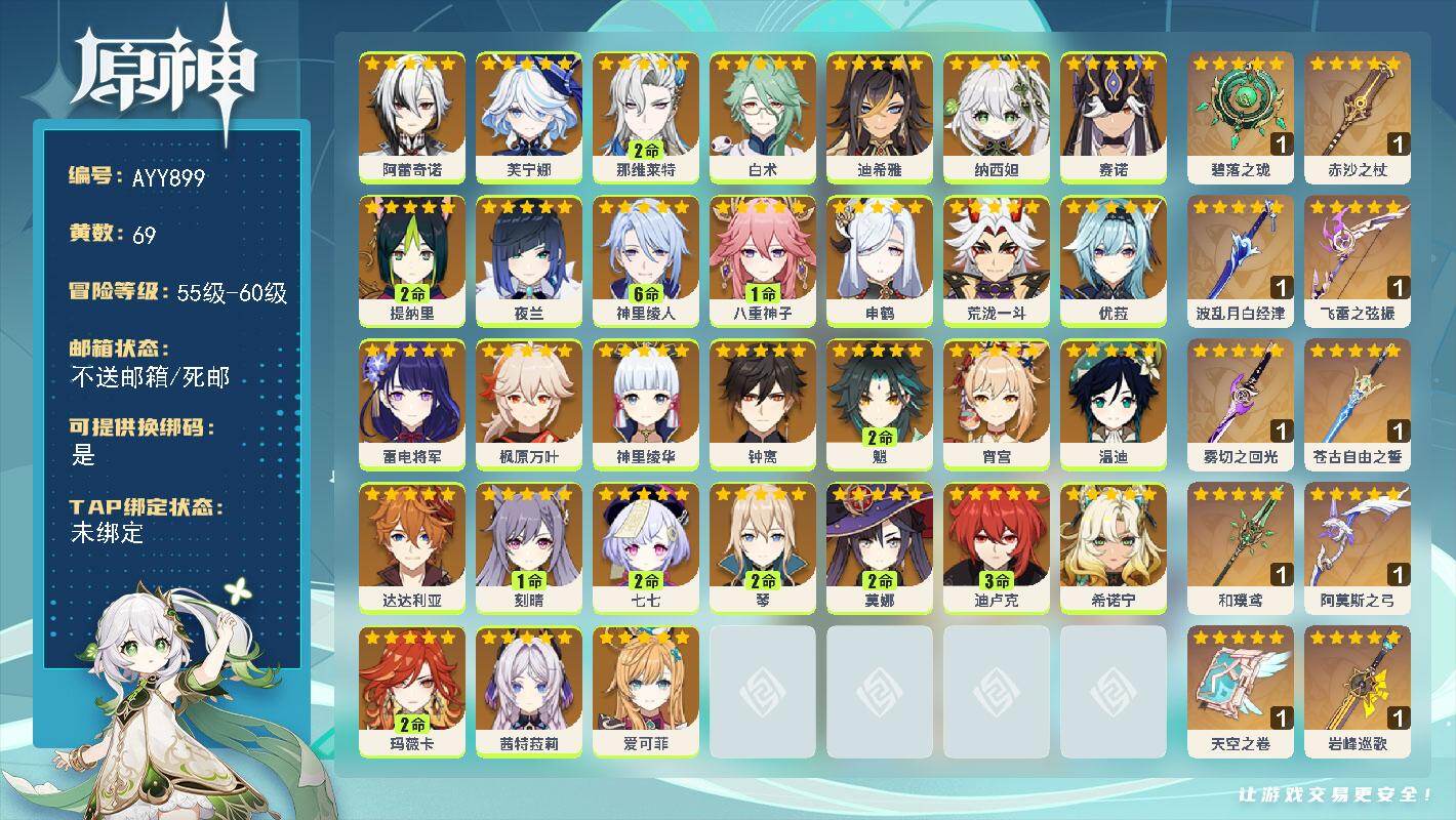 [18040899]60级/69黄/男主/31个五星角色/13个五星武器 0命阿蕾奇诺,0命芙宁娜,2命那维莱特,0命白术,0命迪希雅,0命纳西妲,0命赛诺,2命提纳里,0命夜兰,满命神里绫人,1命八重神子,0命申鹤,0命荒泷一斗,0命优菈,0命雷电将军,0命枫原万叶,0命神里绫华,0命钟离,2命魈,0命宵宫,0命温迪,0命达达利亚,1命刻晴,2命七七,2命琴,2命莫娜,3命迪卢克,0命希诺宁,2命玛薇卡,0命茜特菈莉,0命爱可菲,精1碧落之珑,精1赤沙之杖,精1波乱月白经津,精1飞雷之弦振,精1雾切之回光,精1苍古自由之誓,精1和璞鸢,精1阿莫斯之弓,精1天空之卷,精1岩峰巡歌