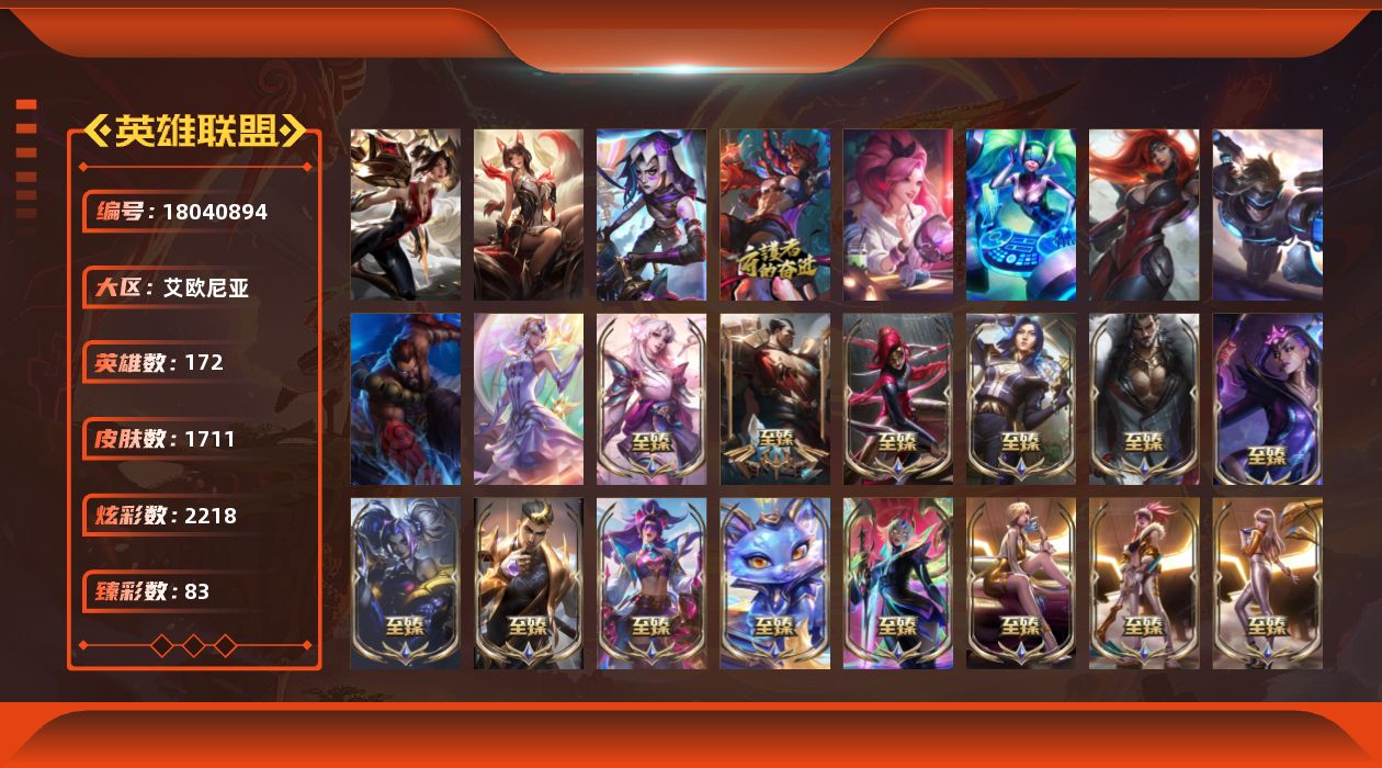 [18040894]【店主推荐捡漏号】钻石段位-172英雄-1711皮肤-2218炫彩-9终极-124神话-352限定-131传说-215史诗