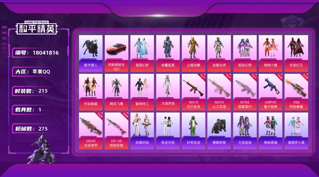 [18041816]苹果 手Q-11粉装-9特效枪-1载具-2粉色飞行器-91210热力值-16王牌印记-215套装-275枪皮 【热门品类】:粉装-雪国幻梦,套装-浪漫天命,套装-都市猎人,套装-SS1特训,套装-暗夜之虎,套装-龟仙人,熔岩游骑兵连帽夹克 【粉色套装】:粉装-水曜玄武,粉装-土曜战麒,粉装-金曜白虎,粉装-雪国幻梦,粉装-极致幻想,粉装-锦绣火鲤,粉装-炙焰红王,粉装-烈焰拳霸,粉装-飓风飞鹰,粉装-蜜桃特工,角色-冷漠罗丽 【粉色枪皮等级】:M416-五爪金龙(七级),M416-心之恋语(七级),M762-甜蜜誓约(七级),ACE32-萌骑漫游(五级),UMP45-量子极限(五级),VSS-烈焰拳霸(五级),Mk14-福马献瑞(一级),M249-古战神甲(五级),DP-28-枪炮玫瑰(五级) 【粉色载具】:阿斯顿马丁DBS(红) 【粉色枪皮】:M416-五爪金龙,M416-心之恋语,M762-甜蜜誓约,ACE32-萌骑漫游,UMP45-量子极限,VSS-烈焰拳霸,Mk14-福马献瑞,M249-古战神甲,DP-28-枪炮玫瑰 【粉色飞行器】:扶摇飞仙飞行器,诡面斩飞行器 【粉色降落伞】:幻影战神降落伞,春暖花开降落伞,PEL轰鸣竞梦者降落伞,甜蜜誓约降落伞,诡面斩降落伞,锦绣火鲤降落伞,荧光虫舞降落伞,阿狸红降落伞,夏日绵绵冰降落伞,烈焰拳霸降落伞,古战神甲降落伞,枪炮玫瑰降落伞,洛神天依降落伞,星穹咏叹调降落伞,最终圣卫者降落伞 【稀有套装】:套装-龟仙人,角色-罗莉,套装-迅捷龙虾,套装-蓝海鲸歌,套装-朱霞炽焰,套装-雨过天青,套装-红釉青花 【稀有枪皮】:AKM-四圣焕新,AKM-夜灯,AKM-彩虹符号,AKM-影袭,AKM-灼热熔岩,AKM-环太平洋,AKM-生命誓言,AKM-破晓战魂,AKM-萌趣颜团子,AKM-虎虎生威,AKM-阿狸红,AKM-霓虹街区,AKM-龙的传人,M16A4-凝视深渊,M16A4-幻世战舞者,M16A4-机械英豪,M16A4-生命誓言,SCAR-L-炫彩节奏,SCAR-L-玉兔迎春,SCAR-L-红色方程式,SCAR-L-黄金龙骨,M416-仓鼠灰灰,M416-夜灯,M416-糯团青竹,M416-葫芦兄弟,GROZA-异彩先驱,GROZA-彩虹符号,GROZA-影袭,GROZA-恐龙拽拽,GROZA-治愈之星,GROZA-田园
