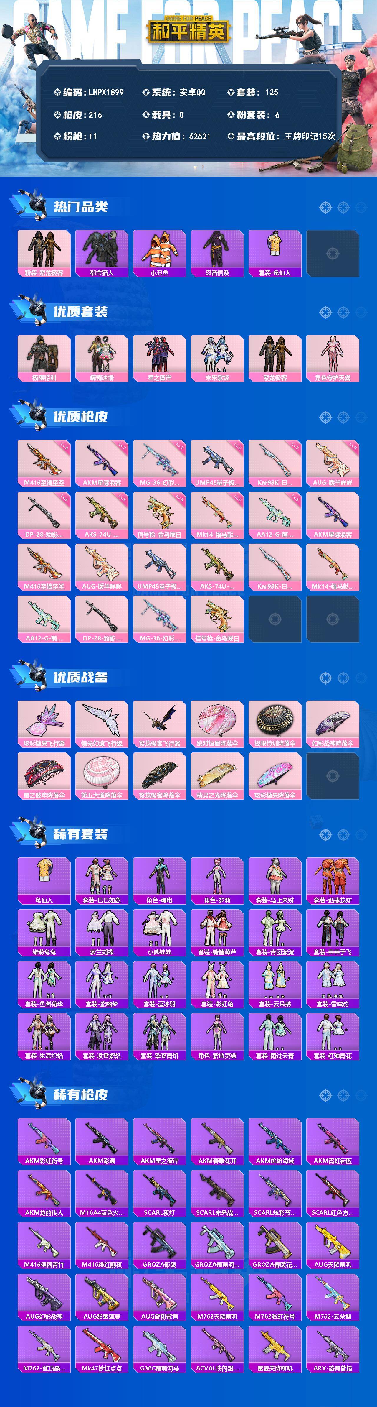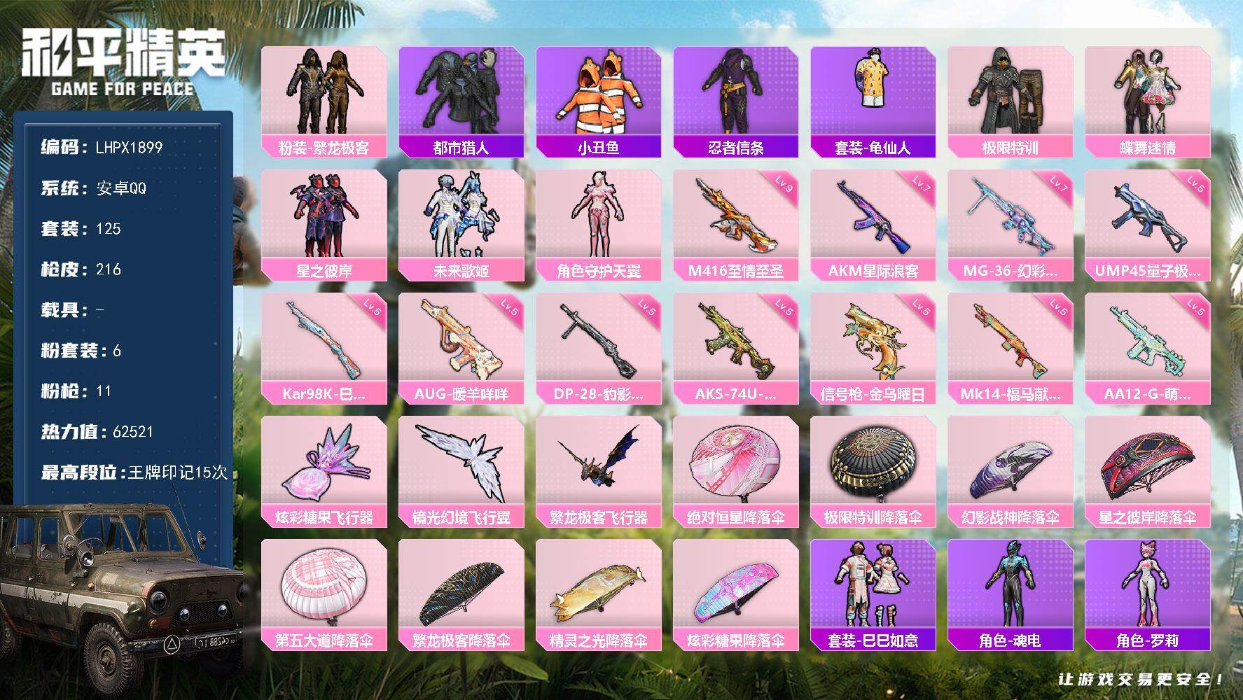 [18041897]可二次【特价出售/店主推荐】 M416-至情至圣(九级) 安卓 手Q-6粉装-11特效枪-3粉色飞行器-62521热力值-15王牌印记-125套装-216枪皮【热门品类】:粉装-繁龙极客,套装-都市猎人,套装-小丑鱼,套装-忍者信条,套装-龟仙人【粉色套装】:粉装-极限特训,粉装-蝶舞迷情,粉装-星之彼岸,粉装-未来歌姬,粉装-繁龙极客,角色-守护天翼【粉色枪皮等级】:AKM-星际浪客(七级),M416-至情至圣(九级),AUG-暖羊咩咩(五级),UMP45-量子极限(五级),AKS-74U-森灵之息(五级),Kar98K-巳巳如意(五级),Mk14-福马献瑞(五级),AA12-G-萌骑幻想(五级),DP-28-豹影疾电(五级),MG-36-幻彩电音(七级),信号枪-金乌曜日(五级)【粉色枪皮】:AKM-星际浪客,M416-至情至圣,AUG-暖羊咩咩,UMP45-量子极限,AKS-74U-森灵之息,Kar98K-巳巳如意,Mk14-福马献瑞,AA12-G-萌骑幻想,DP-28-豹影疾电,MG-36-幻彩电音,信号枪-金乌曜日【粉色飞行器】:炫彩糖果飞行器,镜光幻境飞行翼,繁龙极客飞行器