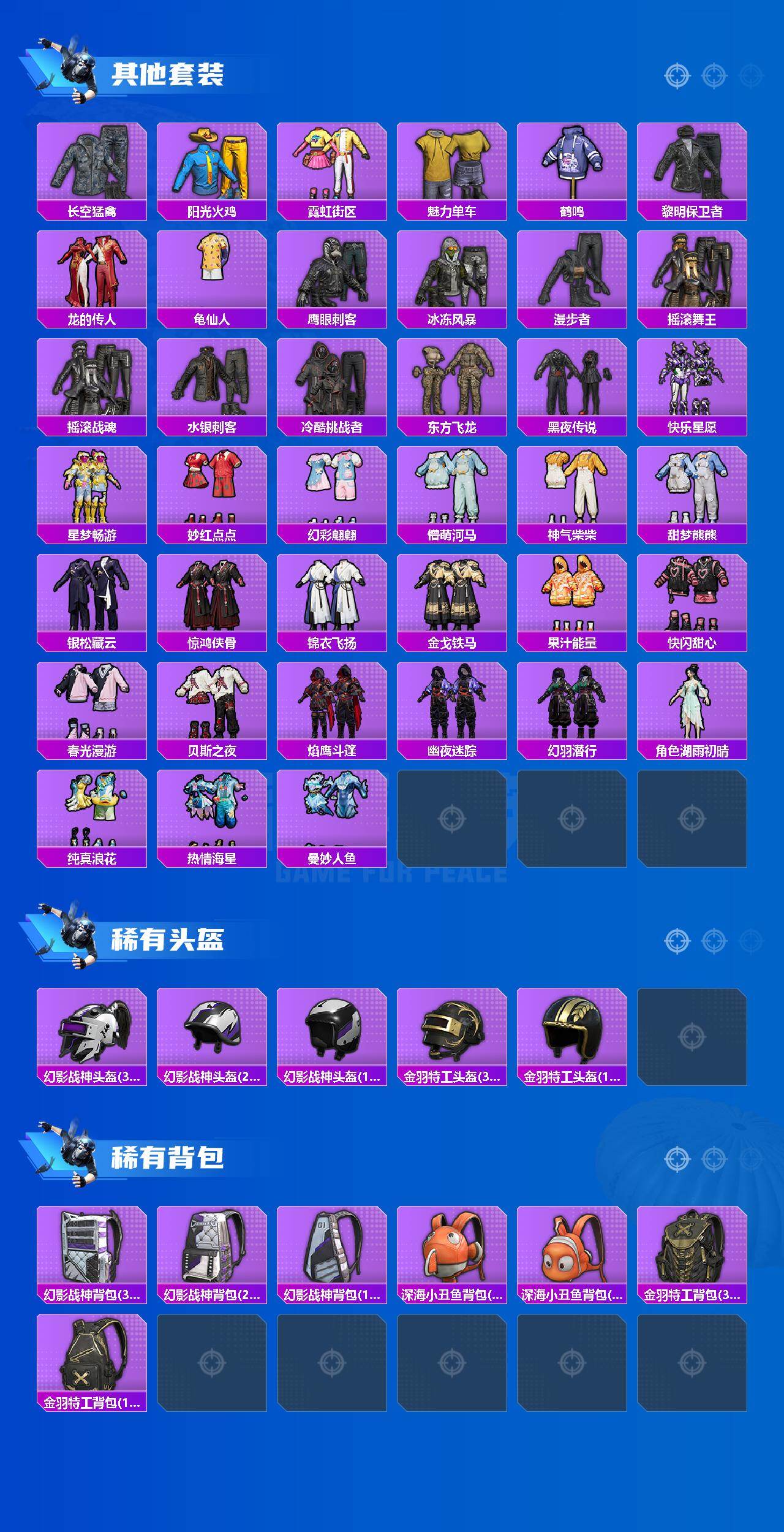 套装-繁龙极客,套装-都市猎人,套装-极限特训,套装-蝶舞迷情,套装-星之彼岸,套装-未来歌姬,角色-守护天翼,套装-鹰眼刺客,套装-东方飞龙