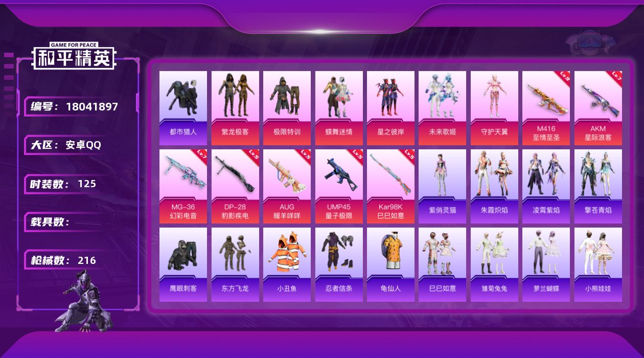 - PX_2078014- 苹果手Q-14王牌印记-10粉装-3特效枪-0载具-46230热力值-129套装-129枪皮-0卓越印记-0传奇印记 【10粉装】,梦幻火箭,灵感创作师,狂魅哈莉,蜜语绒猫,天禅智恒,傲雪凌霜,圣光天使,霞光圣骑,寒光使者,妙趣可丽 【3特效枪】M416-暖熊萌萌-7级 Kar98K-巳巳如意-5级 野牛-流星咚咚-6级 【2稀有紫装】,迅捷狂鲨,龟仙人, 【129稀有时