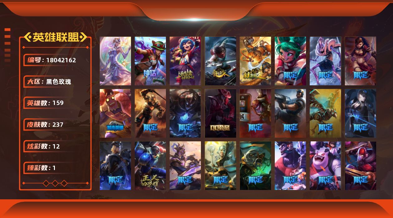 [18042162]未定级段位-159英雄-237皮肤-12炫彩-1终极-2神话-37限定-28传说-56史诗