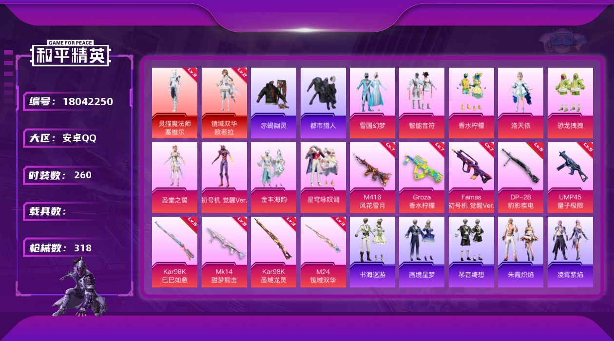 [18042250]安卓 手Q-2神装-10粉装-10特效枪-0载具-6粉色飞行器-110580热力值-21王牌印记-260套装-318枪皮【红色神装等级】:灵猫魔法师-塞维尔(三级),镜域双华-欧若拉(二级)【红色角色神装】:灵猫魔法师-塞维尔,镜域双华-欧若拉【热门品类】:粉装-雪国幻梦,套装-浪漫天命,套装-赤蝎幽灵,套装-都市猎人,套装-龟仙人,套装-潮萌小黄鸭,套装-暗影哥特,套装-粉红小猪,套装-软软马卡龙,角色-8号机,角色-Mark.06【粉色套装】:粉装-雪国幻梦,粉装-智能音符,粉装-香水柠檬,角色-洛天依,粉装-恐龙拽拽,角色-圣堂之誓,角色-初号机 觉醒Ver.,粉装-金丰海韵,粉装-星穹咏叹调【粉色枪皮等级】:M416-风花雪月(七级),GROZA-香水柠檬(七级),Famas-初号机 觉醒Ver.(七级),UMP45-量子极限(五级),UMP45-萌骑冒险(四级),Kar98K-巳巳如意(五级),Kar98K-圣域龙灵(三级),M24-镜域双华(三级),Mk14-甜梦熊击(五级),DP-28-豹影疾电(五级)【粉色枪皮】:M416-风花雪月,GROZA-香水柠檬,Famas-初号机 觉醒Ver.,UMP45-量子极限,UMP45-萌骑冒险,Kar98K-巳巳如意,Kar98K-圣域龙灵,M24-镜域双华,Mk14-甜梦熊击,DP-28-豹影疾电【粉色飞行器】:镜域双华-灵镜之阶,绝色倾城飞行器,鎏金朋克飞行器,深渊漩涡飞行器,终晖之翼飞行器,暮色之舞飞行器