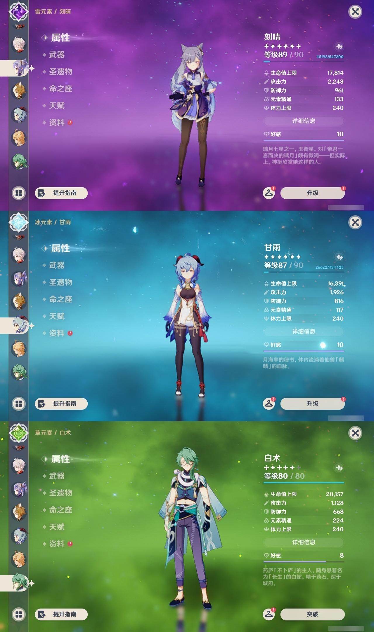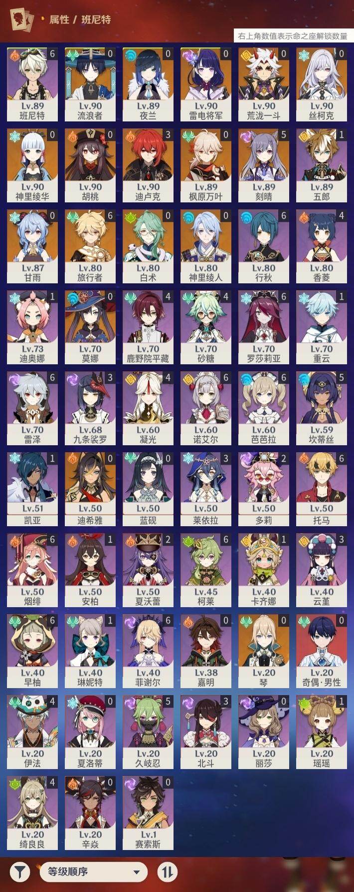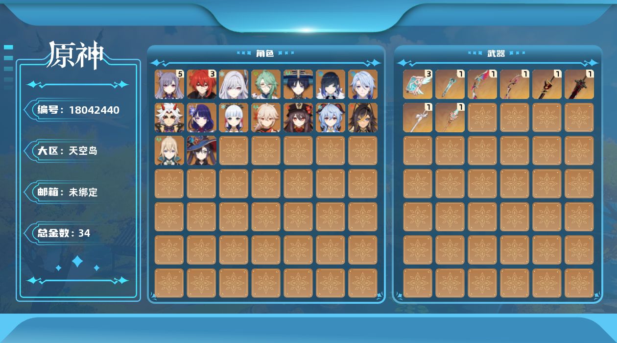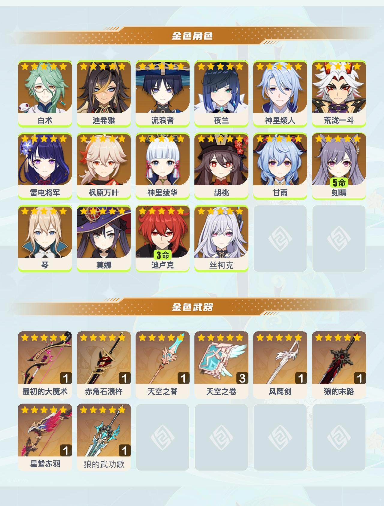 0命白术,0命迪希雅,0命流浪者,0命夜兰,0命神里绫人,0命荒泷一斗,0命雷电将军,0命枫原万叶,0命神里绫华,0命胡桃,0命甘雨,5命刻晴,0命琴,0命莫娜,3命迪卢克,0命丝柯克,精1最初的大魔术,精1赤角石溃杵,精1天空之脊,精3天空之卷,精1风鹰剑,精1狼的末路,精1星鹫赤羽,精1狼的武功歌