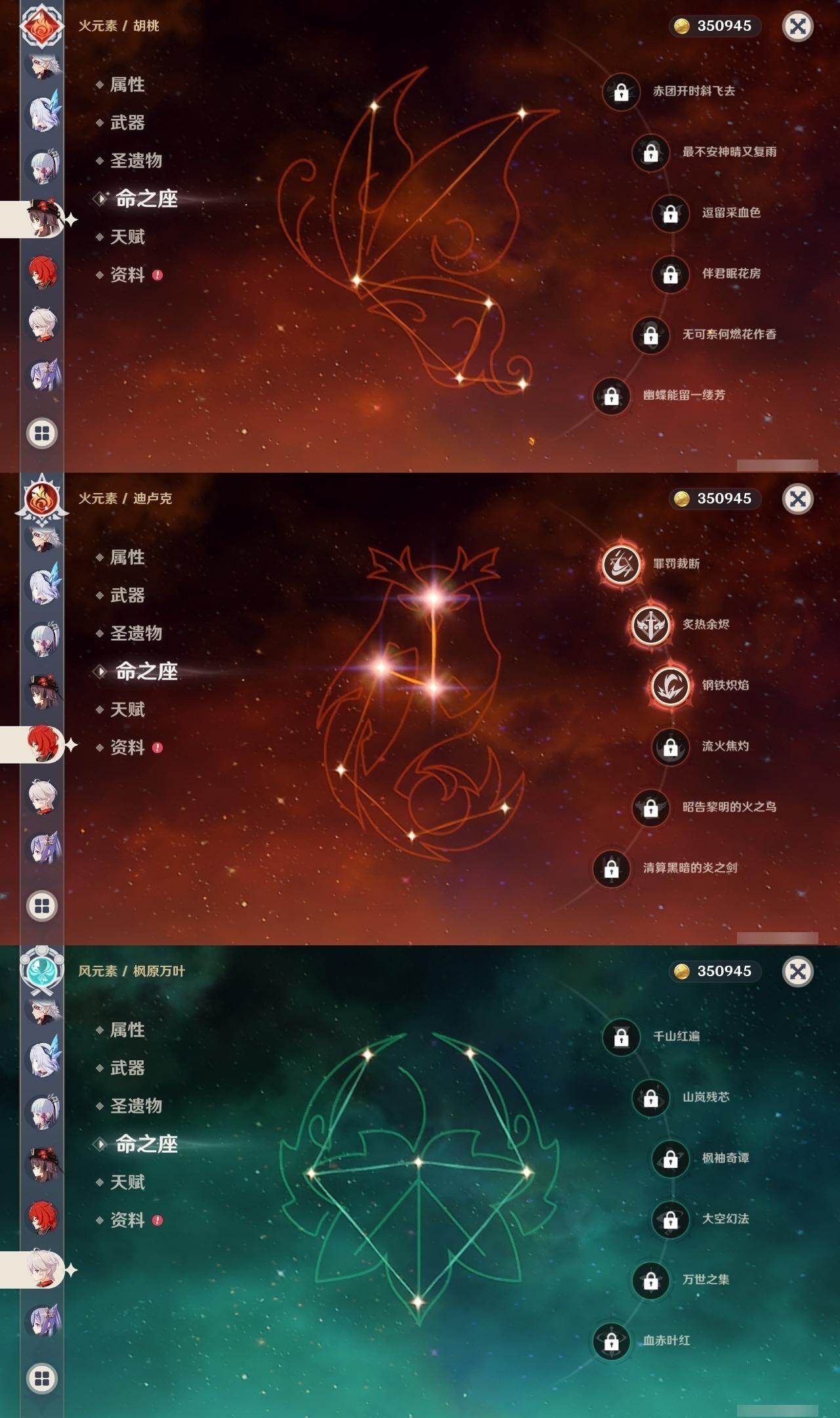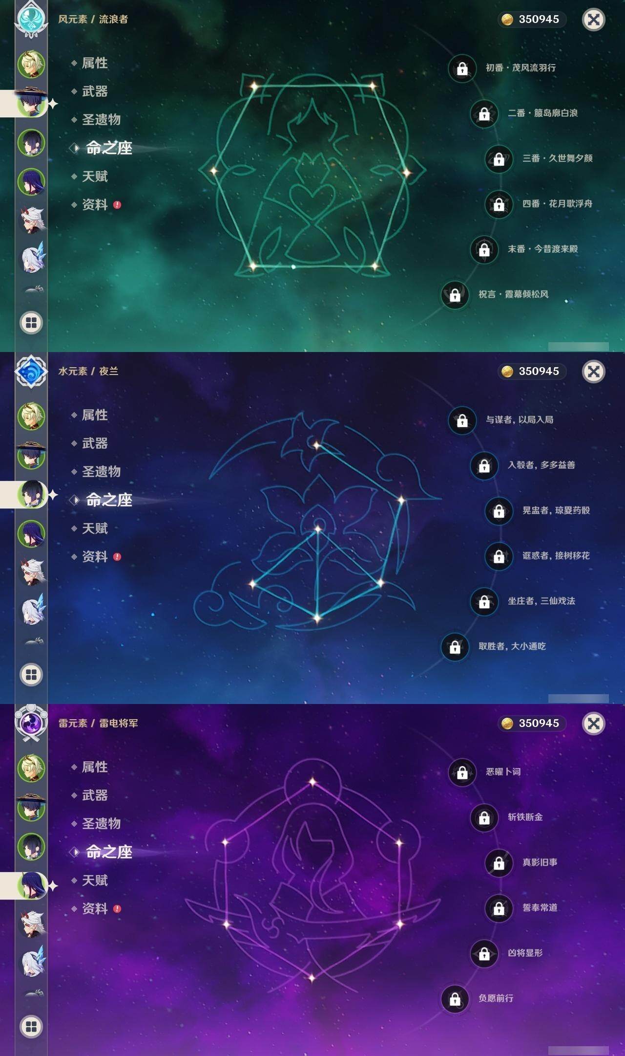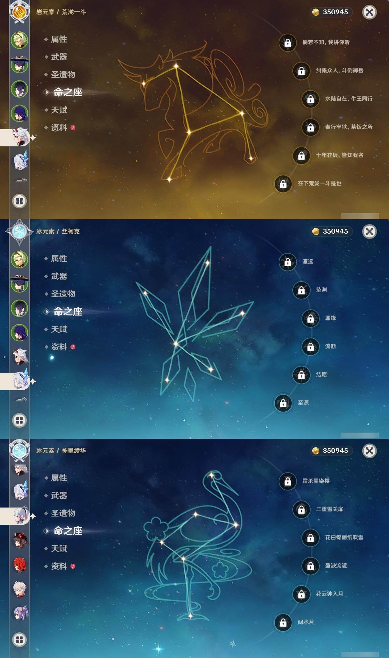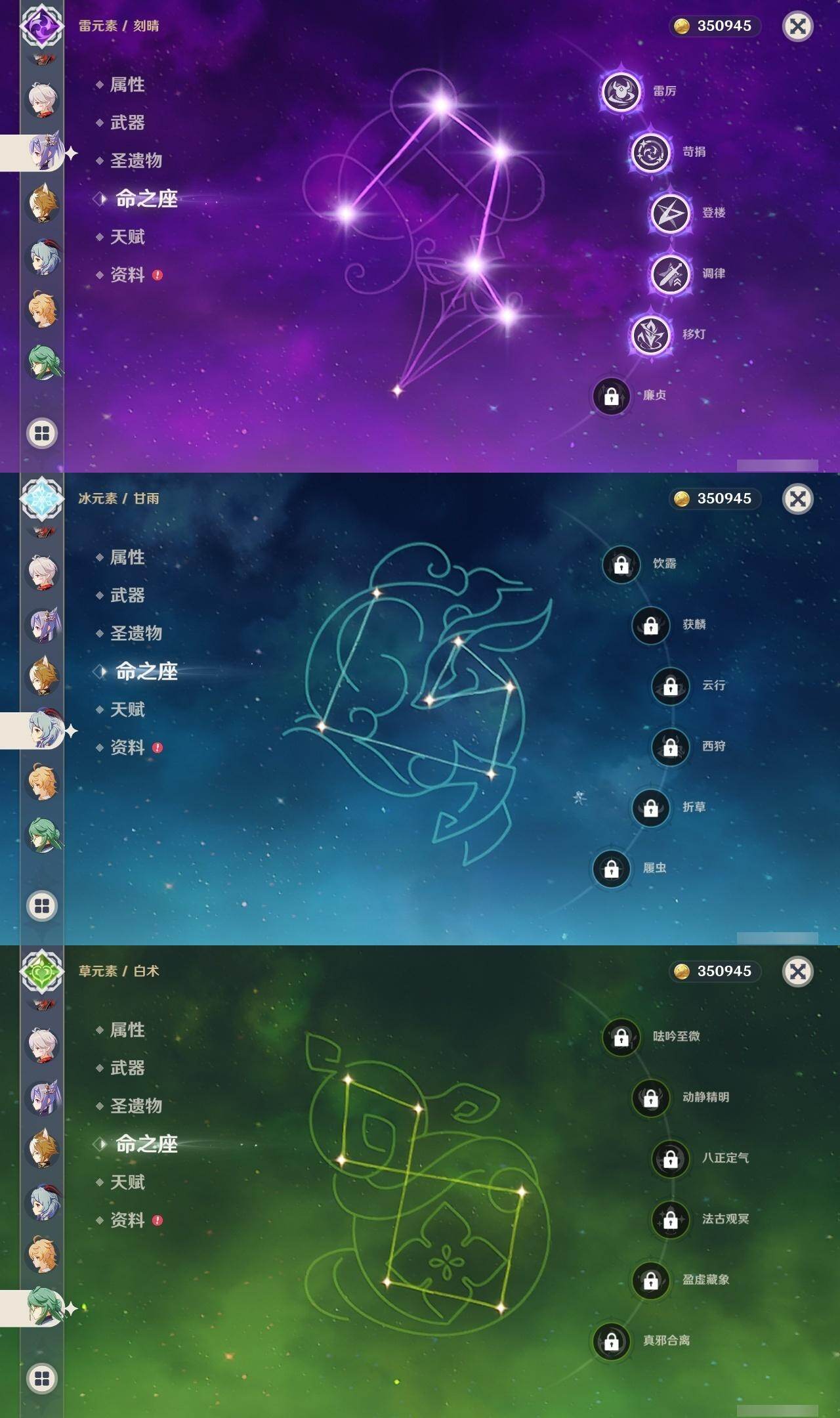 0命白术,0命迪希雅,0命流浪者,0命夜兰,0命神里绫人,0命荒泷一斗,0命雷电将军,0命枫原万叶,0命神里绫华,0命胡桃,0命甘雨,5命刻晴,0命琴,0命莫娜,3命迪卢克,0命丝柯克,精1最初的大魔术,精1赤角石溃杵,精1天空之脊,精3天空之卷,精1风鹰剑,精1狼的末路,精1星鹫赤羽,精1狼的武功歌
