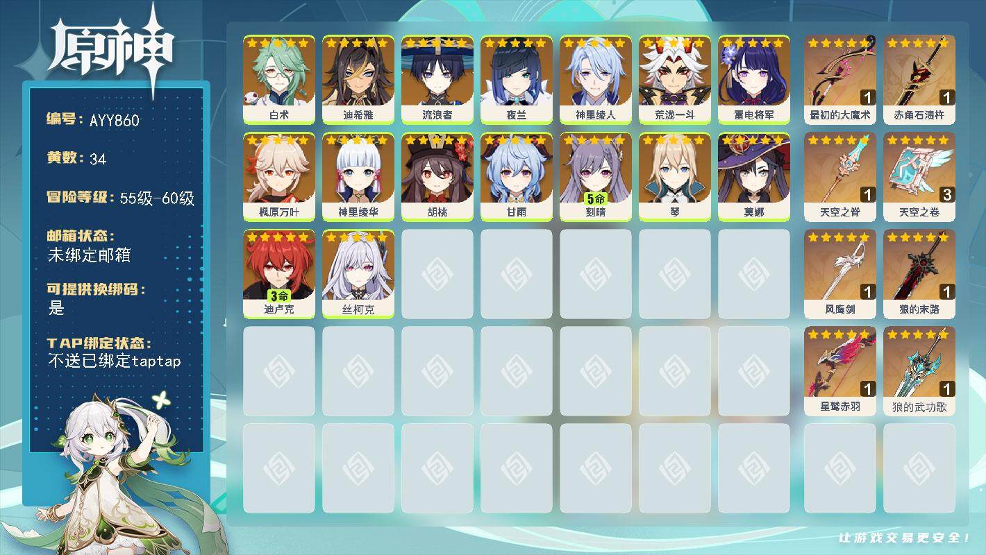[18042440]【店主推荐捡漏号】59级/34黄/男主/16个五星角色/8个五星武器 0命白术,0命迪希雅,0命流浪者,0命夜兰,0命神里绫人,0命荒泷一斗,0命雷电将军,0命枫原万叶,0命神里绫华,0命胡桃,0命甘雨,5命刻晴,0命琴,0命莫娜,3命迪卢克,0命丝柯克,精1最初的大魔术,精1赤角石溃杵,精1天空之脊,精3天空之卷,精1风鹰剑,精1狼的末路,精1星鹫赤羽,精1狼的武功歌