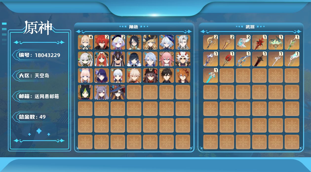 [18043229]59级/49黄/女主/24个五星角色/14个五星武器