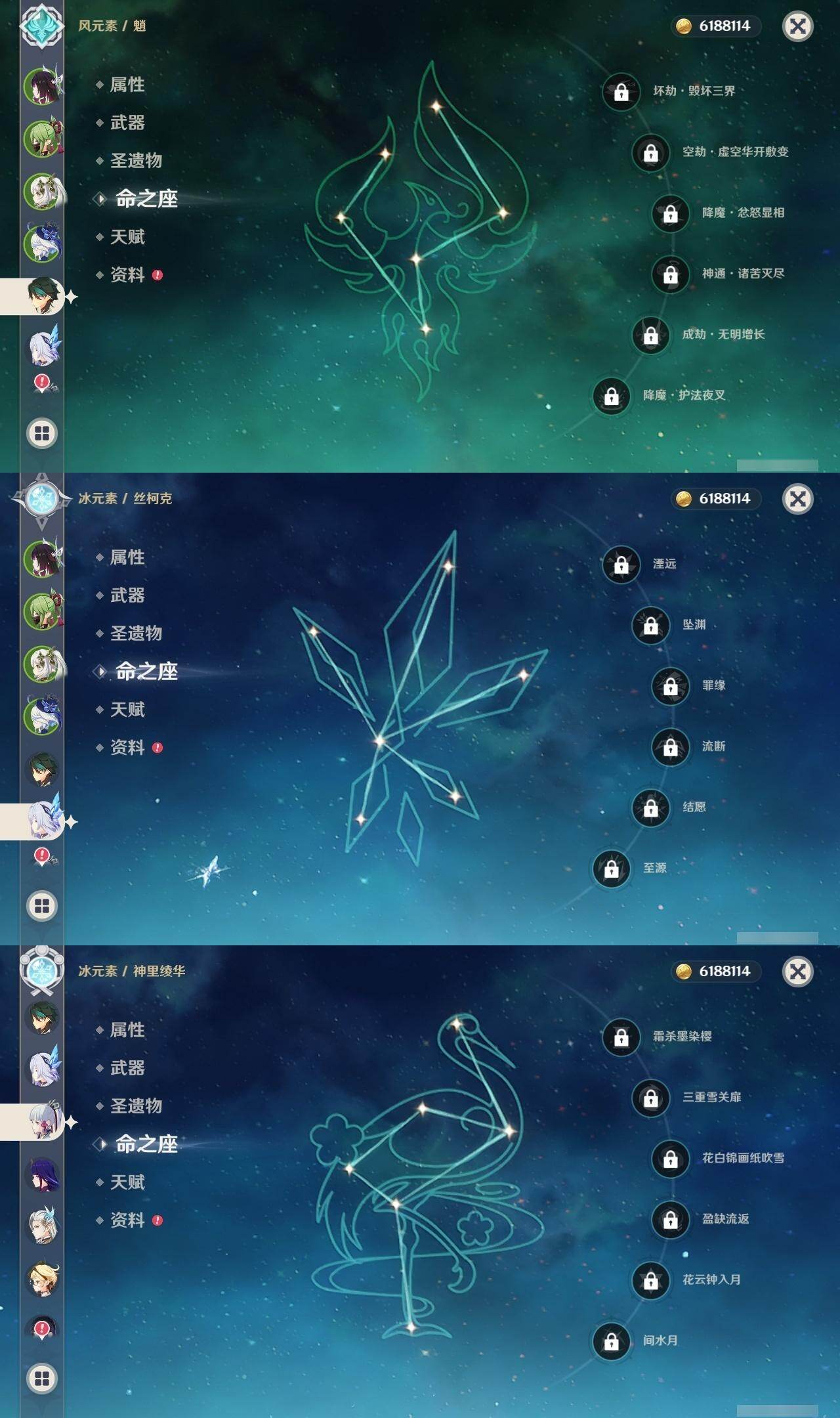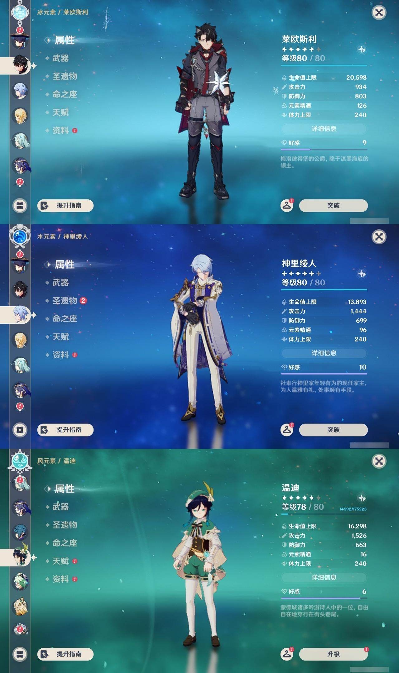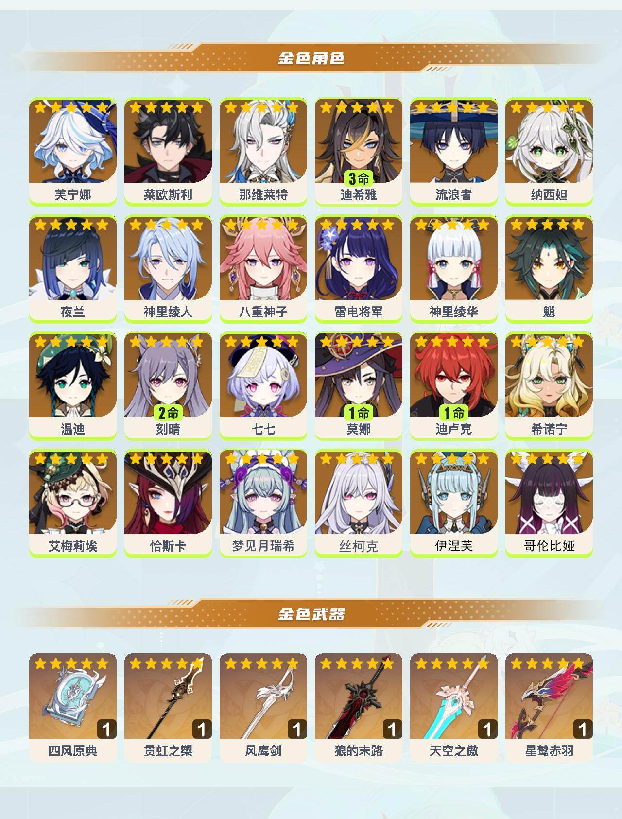 0命芙宁娜,0命莱欧斯利,0命那维莱特,3命迪希雅,0命流浪者,0命纳西妲,0命夜兰,0命神里绫人,0命八重神子,0命雷电将军,0命神里绫华,0命魈,0命温迪,2命刻晴,0命七七,1命莫娜,1命迪卢克,0命希诺宁,0命艾梅莉埃,0命恰斯卡,0命梦见月瑞希,0命丝柯克,0命伊涅芙,0命哥伦比娅,精1四风原典,精1贯虹之槊,精1风鹰剑,精1狼的末路,精1天空之傲,精1星鹫赤羽