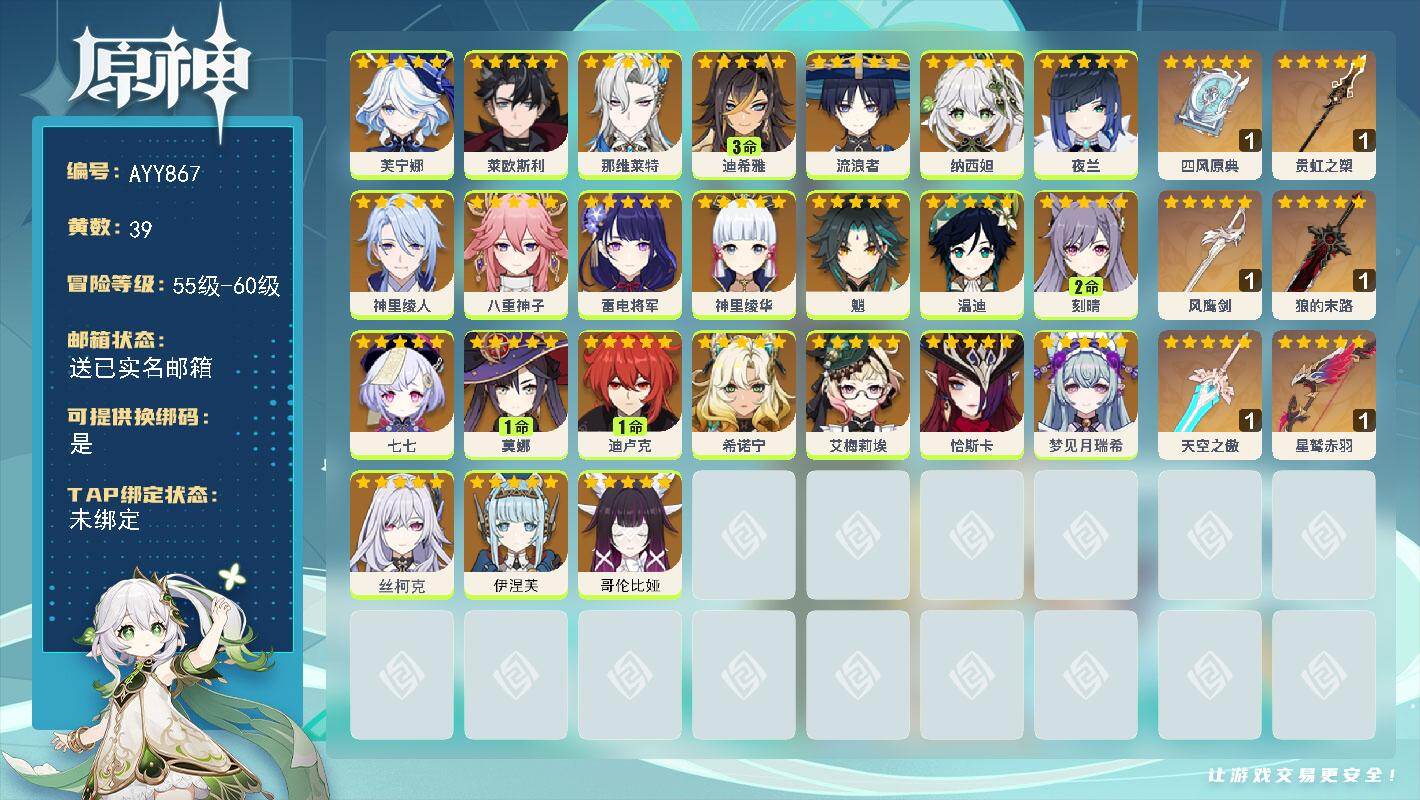 [18043424]59级/39黄/女主/24个五星角色/8个五星武器 0命芙宁娜,0命莱欧斯利,0命那维莱特,3命迪希雅,0命流浪者,0命纳西妲,0命夜兰,0命神里绫人,0命八重神子,0命雷电将军,0命神里绫华,0命魈,0命温迪,2命刻晴,0命七七,1命莫娜,1命迪卢克,0命希诺宁,0命艾梅莉埃,0命恰斯卡,0命梦见月瑞希,0命丝柯克,0命伊涅芙,0命哥伦比娅,精1四风原典,精1贯虹之槊,精1风鹰剑,精1狼的末路,精1天空之傲,精1星鹫赤羽