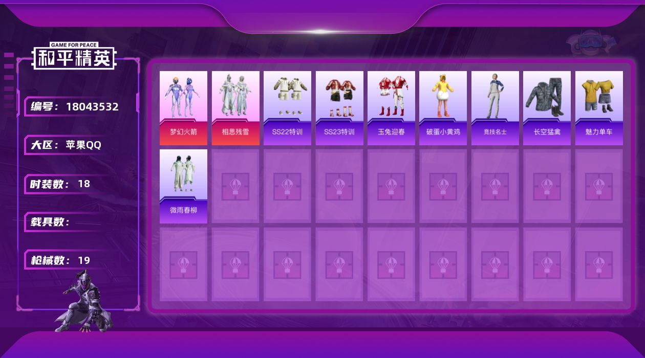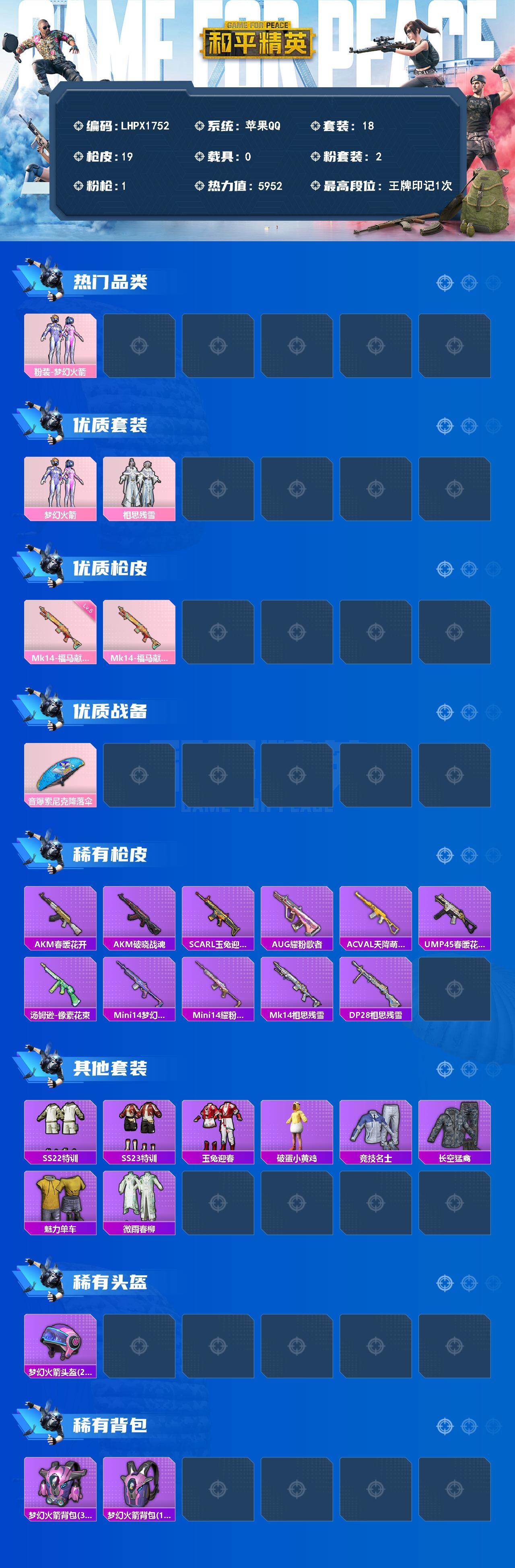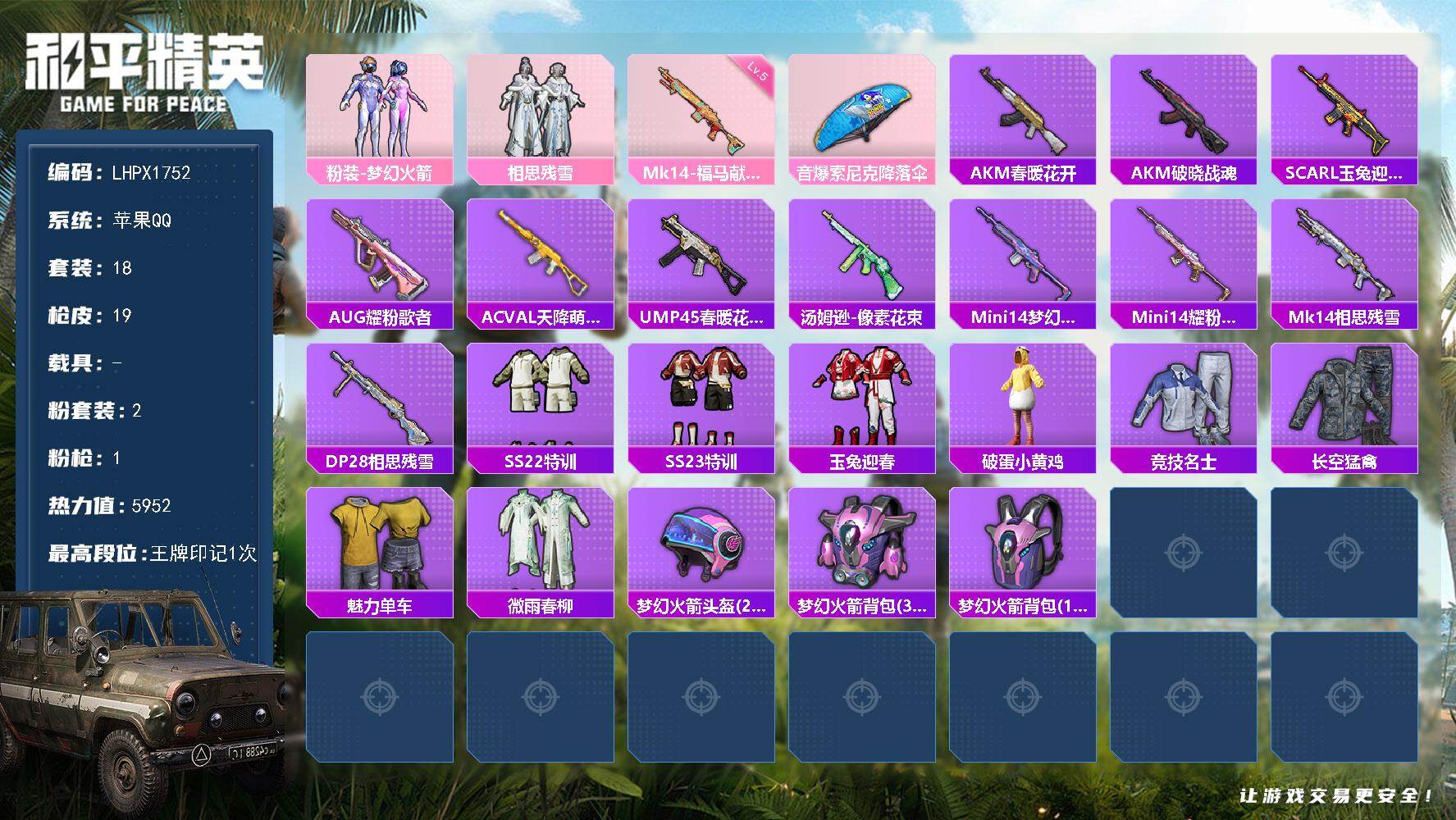 [18043532]【特价出售/店主推荐】苹果 手Q-2粉装-1特效枪-5952热力值-1王牌印记-18套装-19枪皮【热门品类】:粉装-梦幻火箭【粉色套装】:粉装-梦幻火箭,粉装-相思残雪【粉色枪皮等级】:Mk14-福马献瑞(五级)